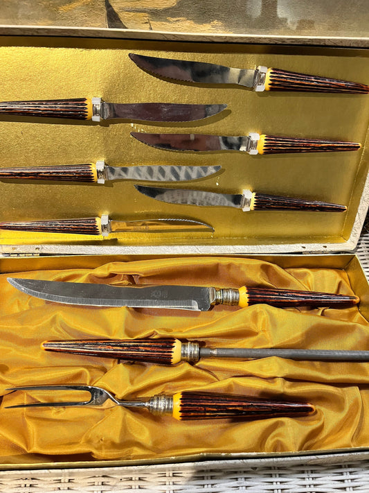 Absolutely fabulous genuine staghorn and stainless steel carving knife fork and Schaffner and six steak knife set in box - Great condition
