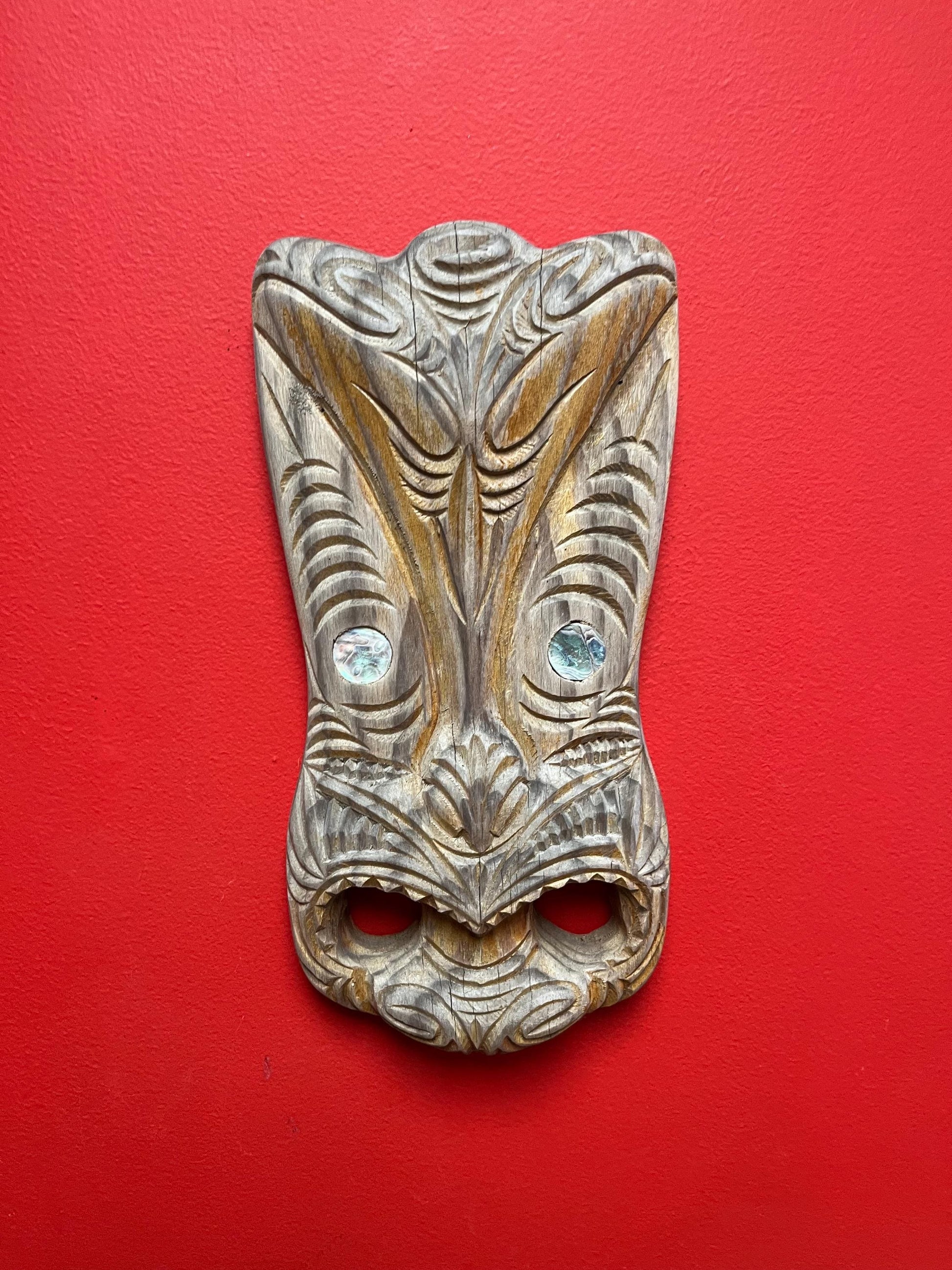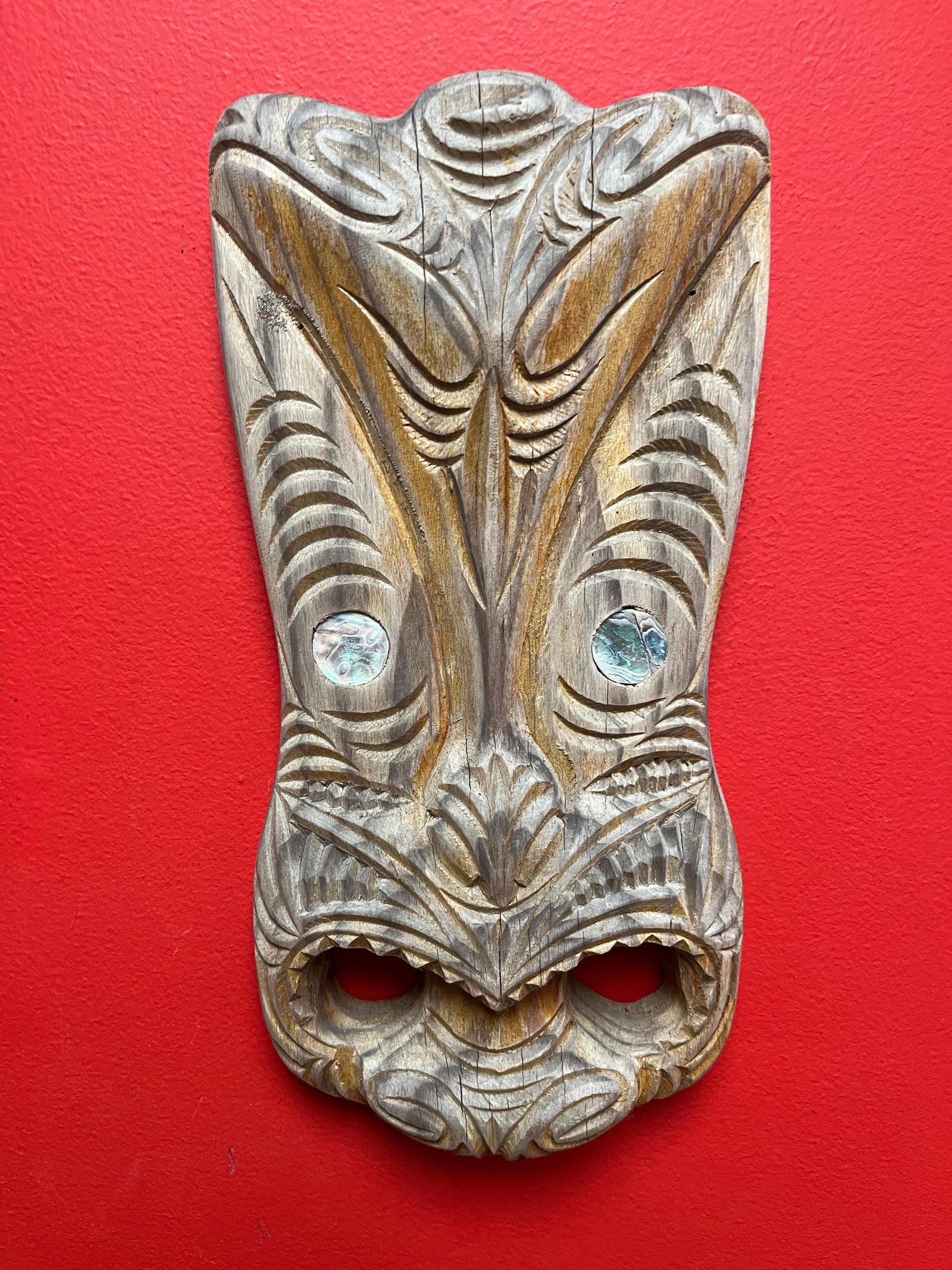 13 x 5 stunning New Zealand Maori mask with abalone eyes amazing patina ready to hang - super gift