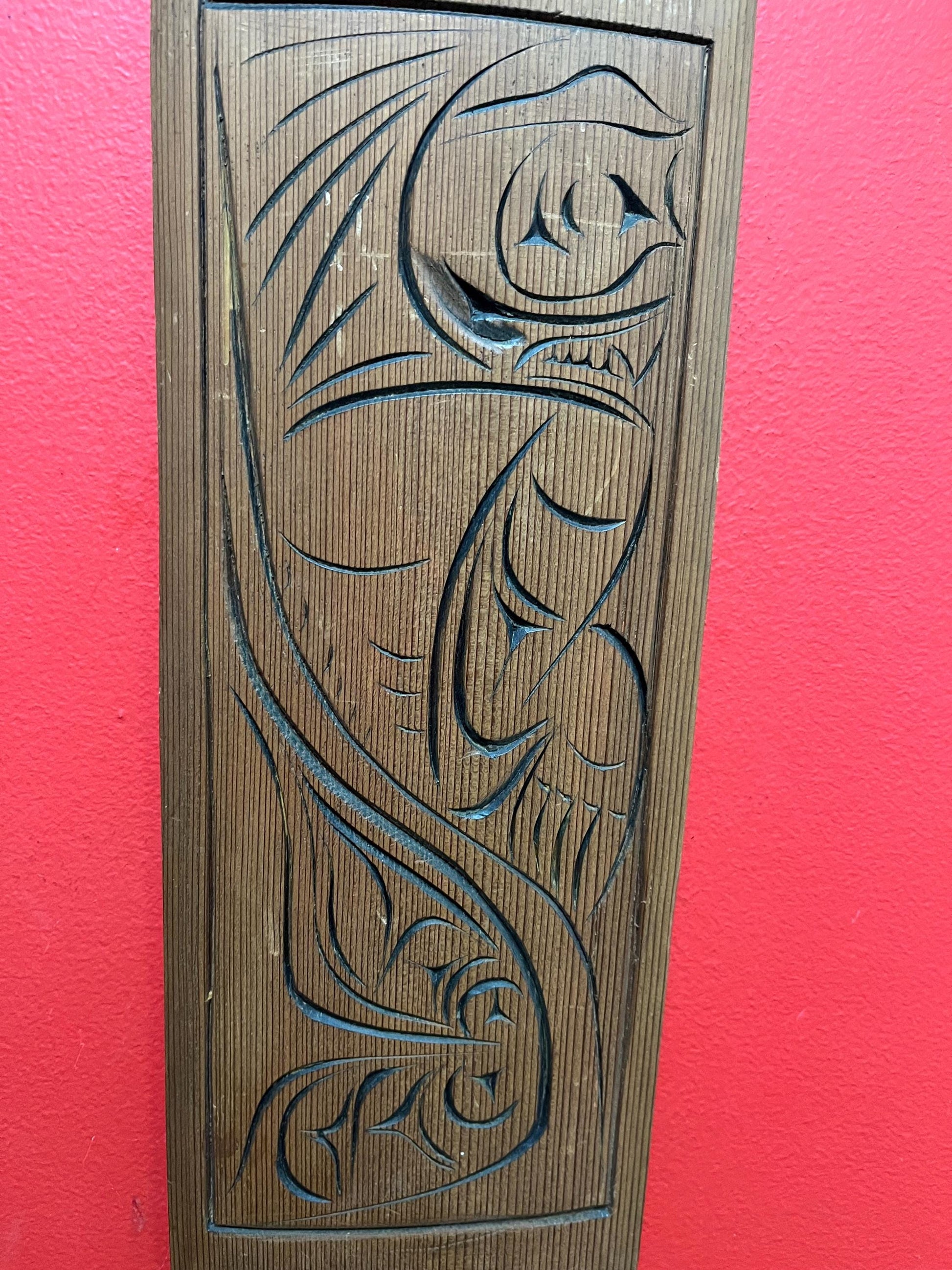 15 x 6 indigenous First Nations Pacific Northwest coast wild man cedar plaque signed and great imagery good price Canadian art