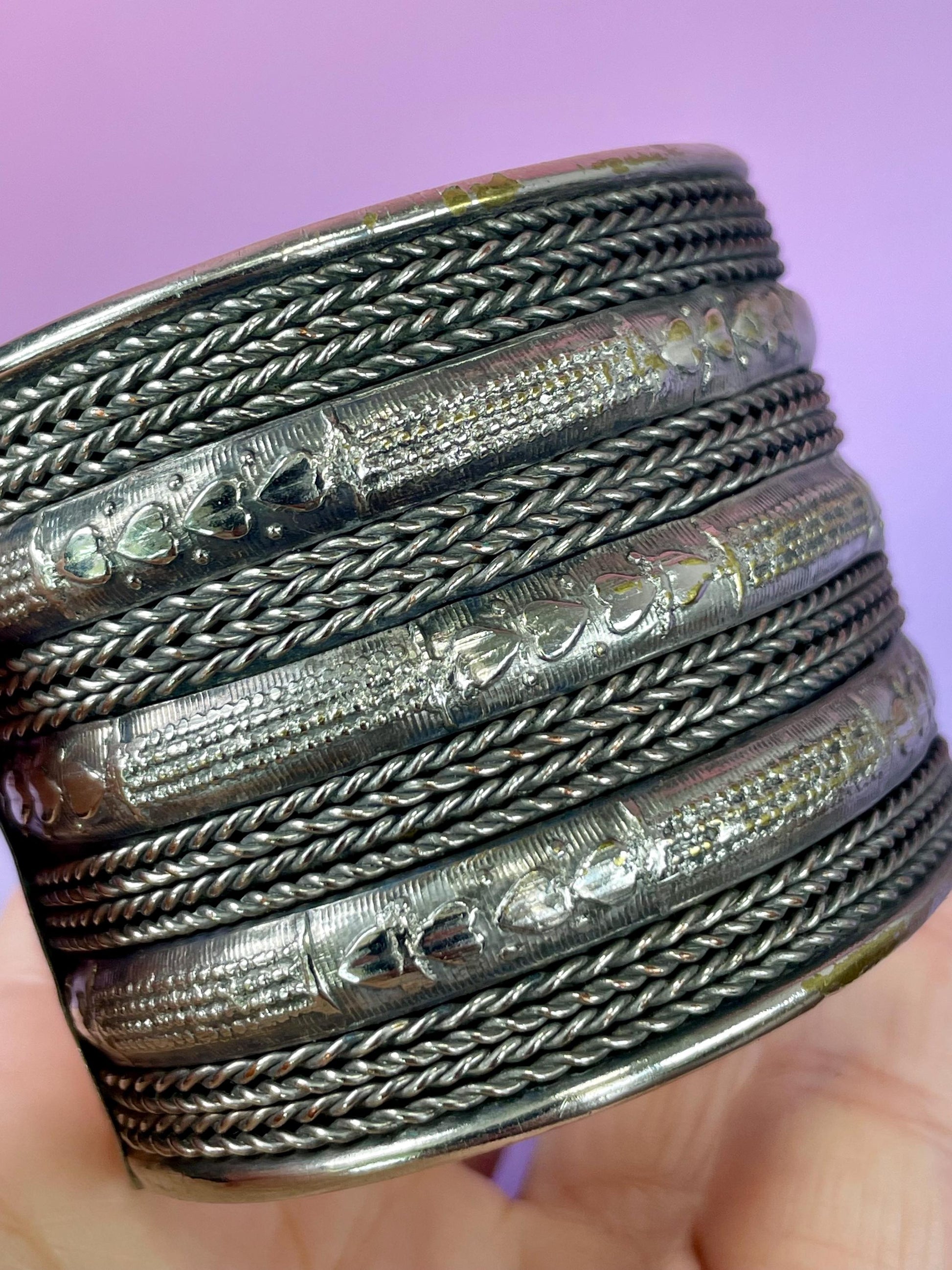 This 2.5 inch untested silver cuff bracelet features intricate, delicate detailing.