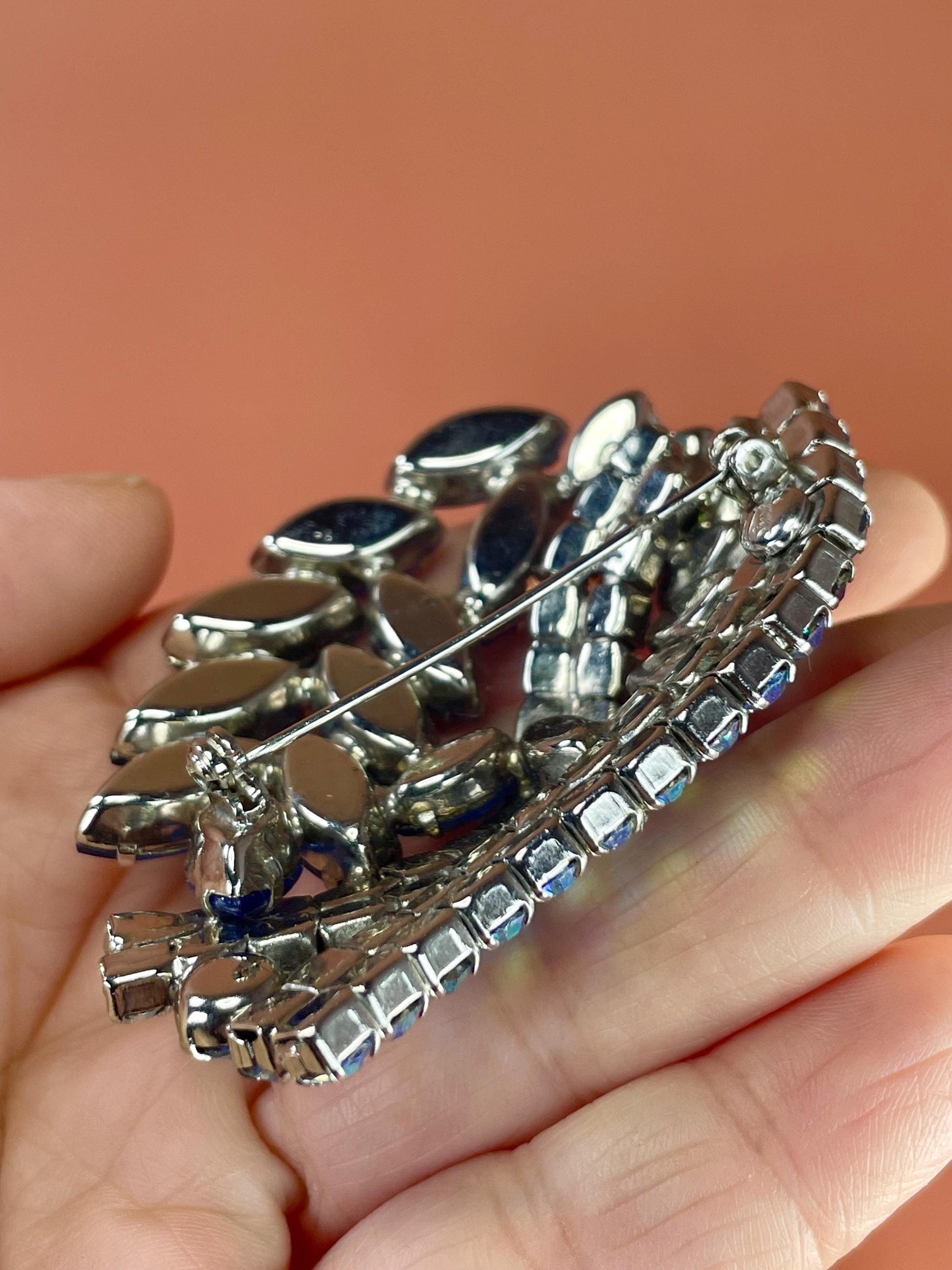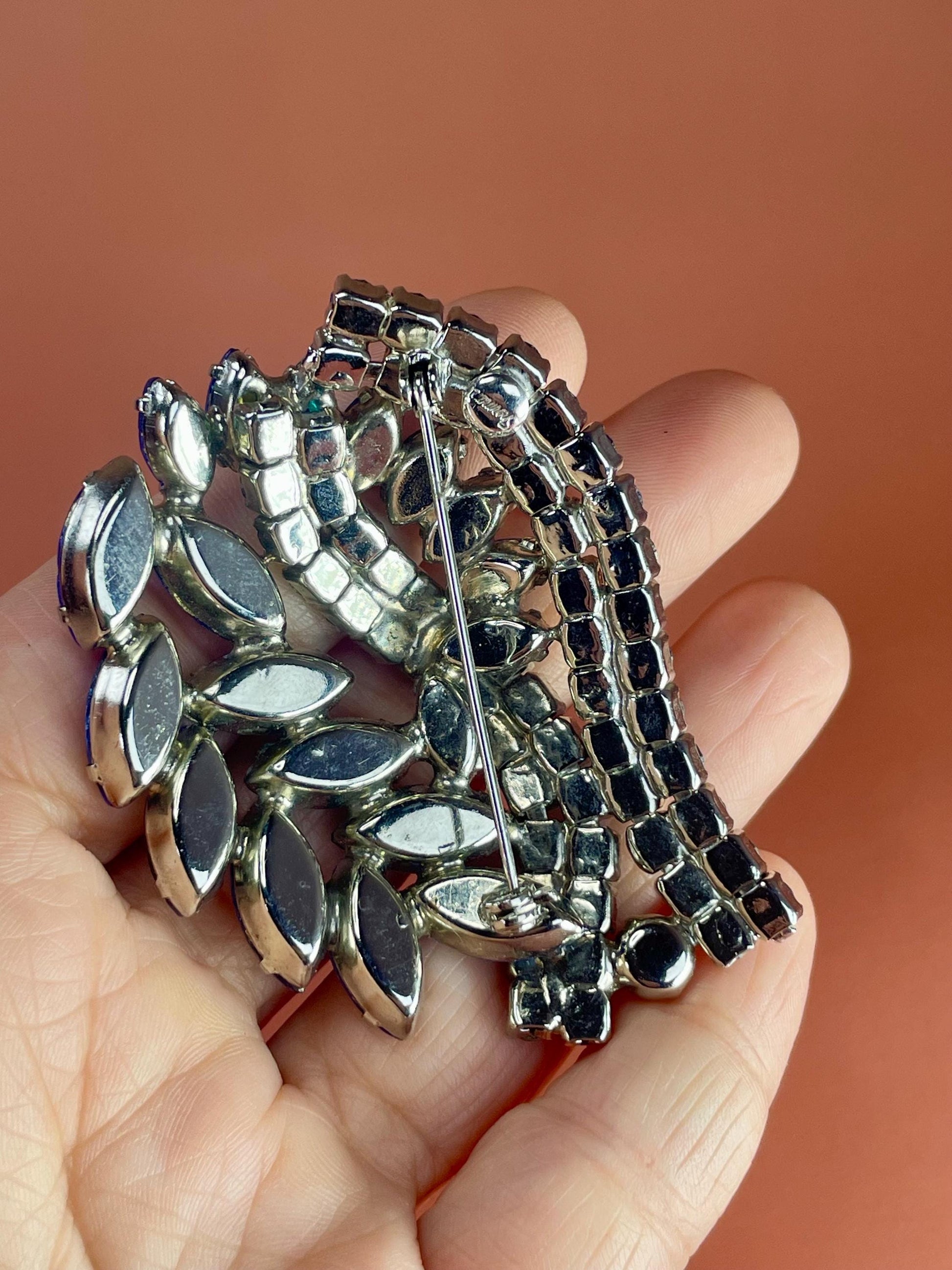 Turquoise and gold toned brooch measures 2 x 2 inches, Larger Rhinestone brooch measures 2.5 x 2 inches