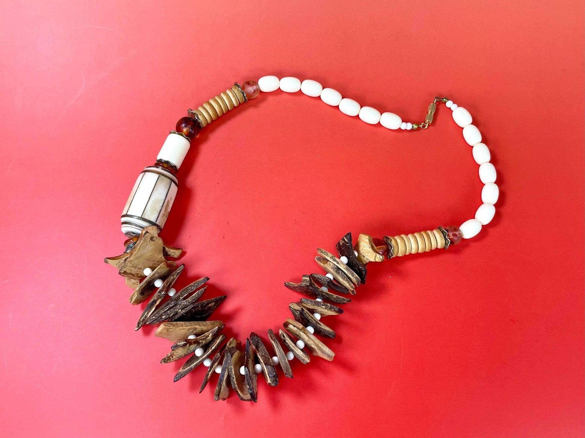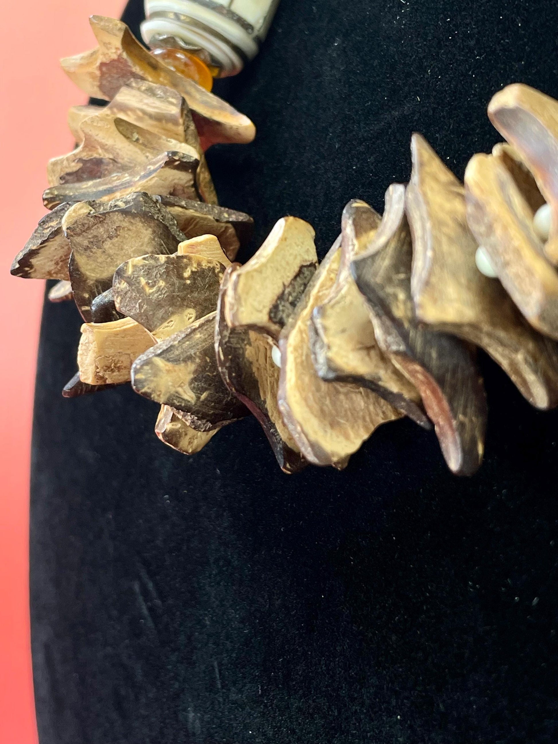 Gorgeous asymmetrical handcrafted, 21 inch necklace featuring interesting wooden chip beads.