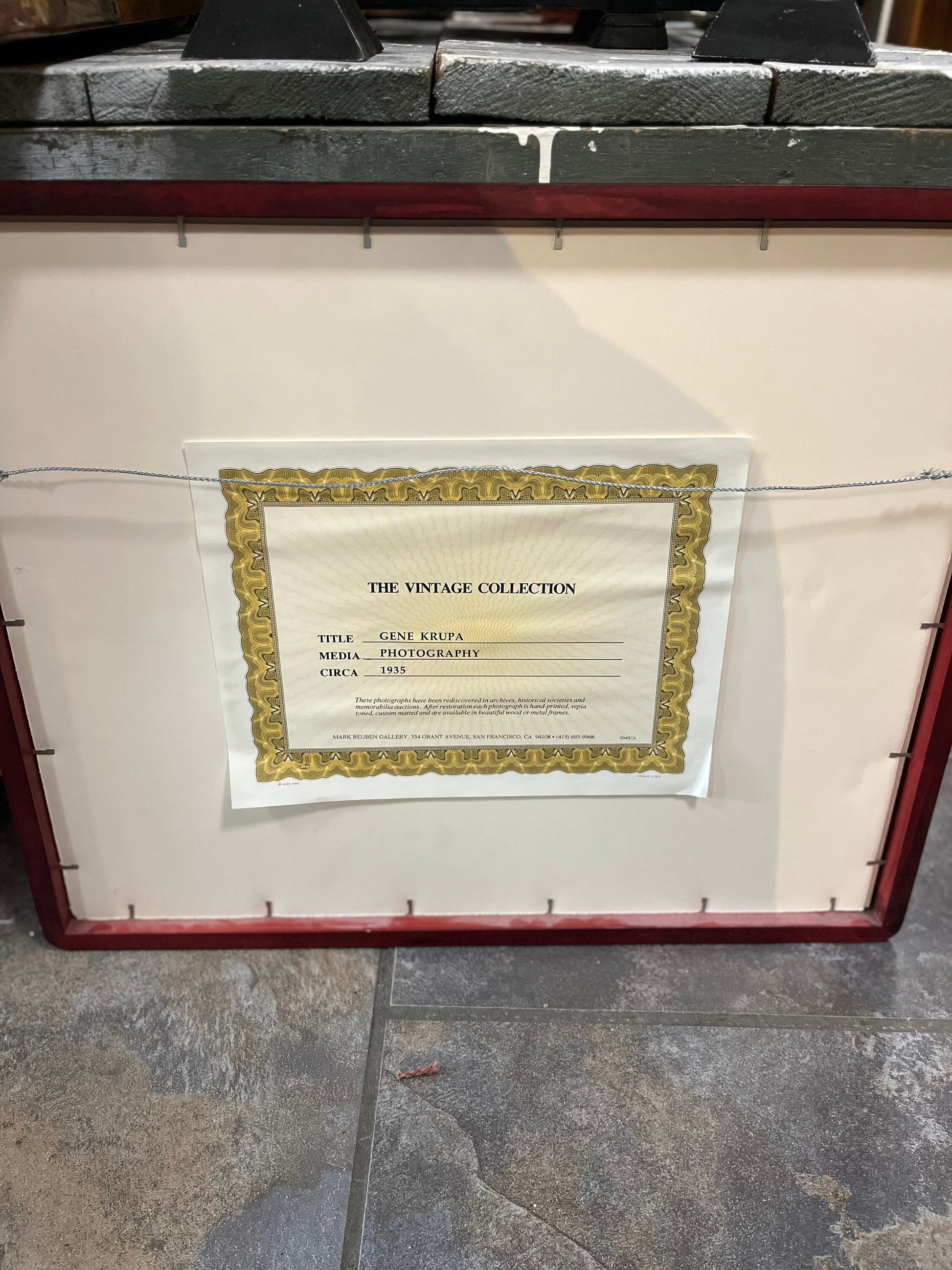 21 x 17 inch 1935 Gene Krupa photo in great wooden frame wonderful jazz imagery great gift with authenticity info on back
