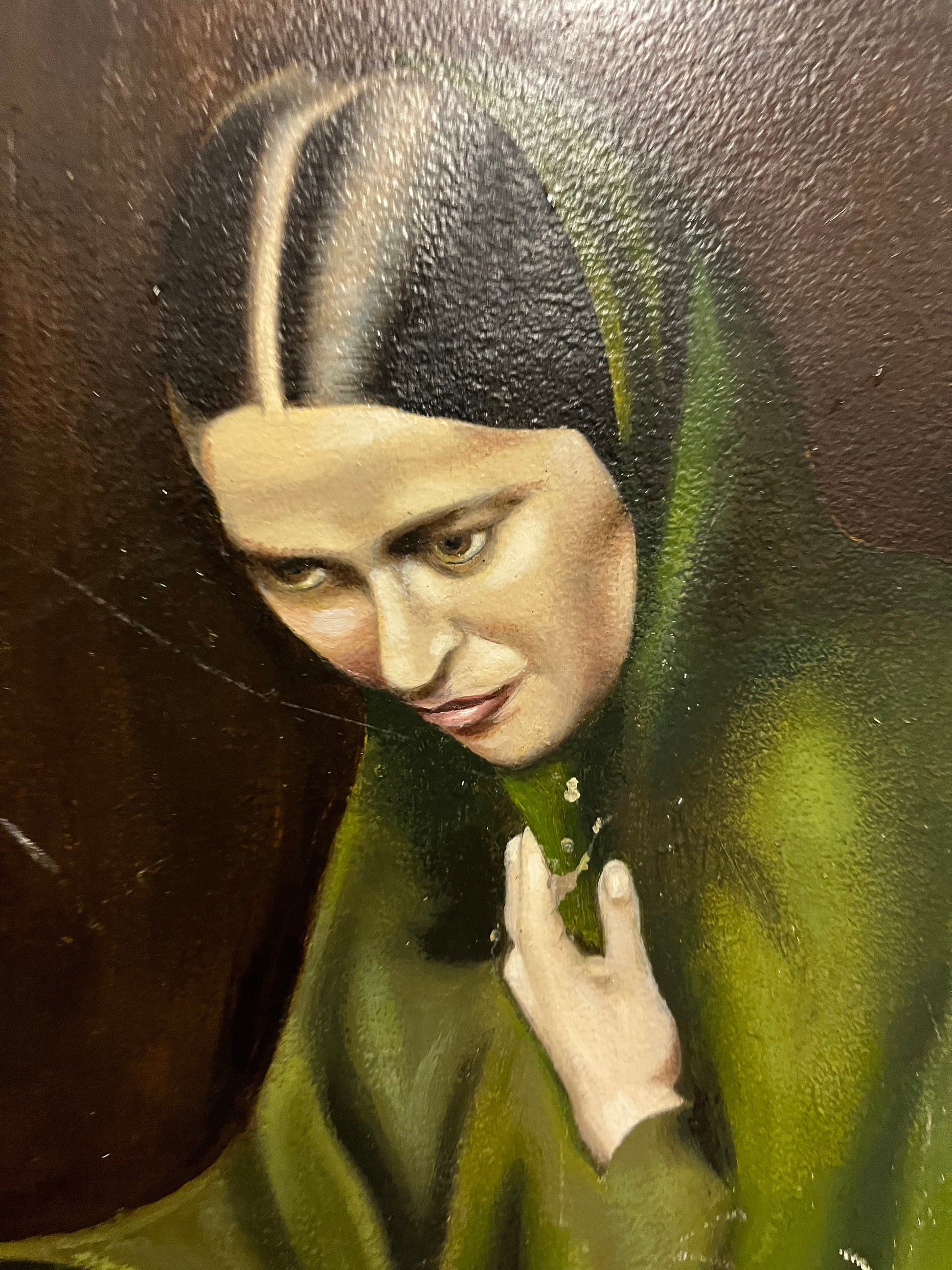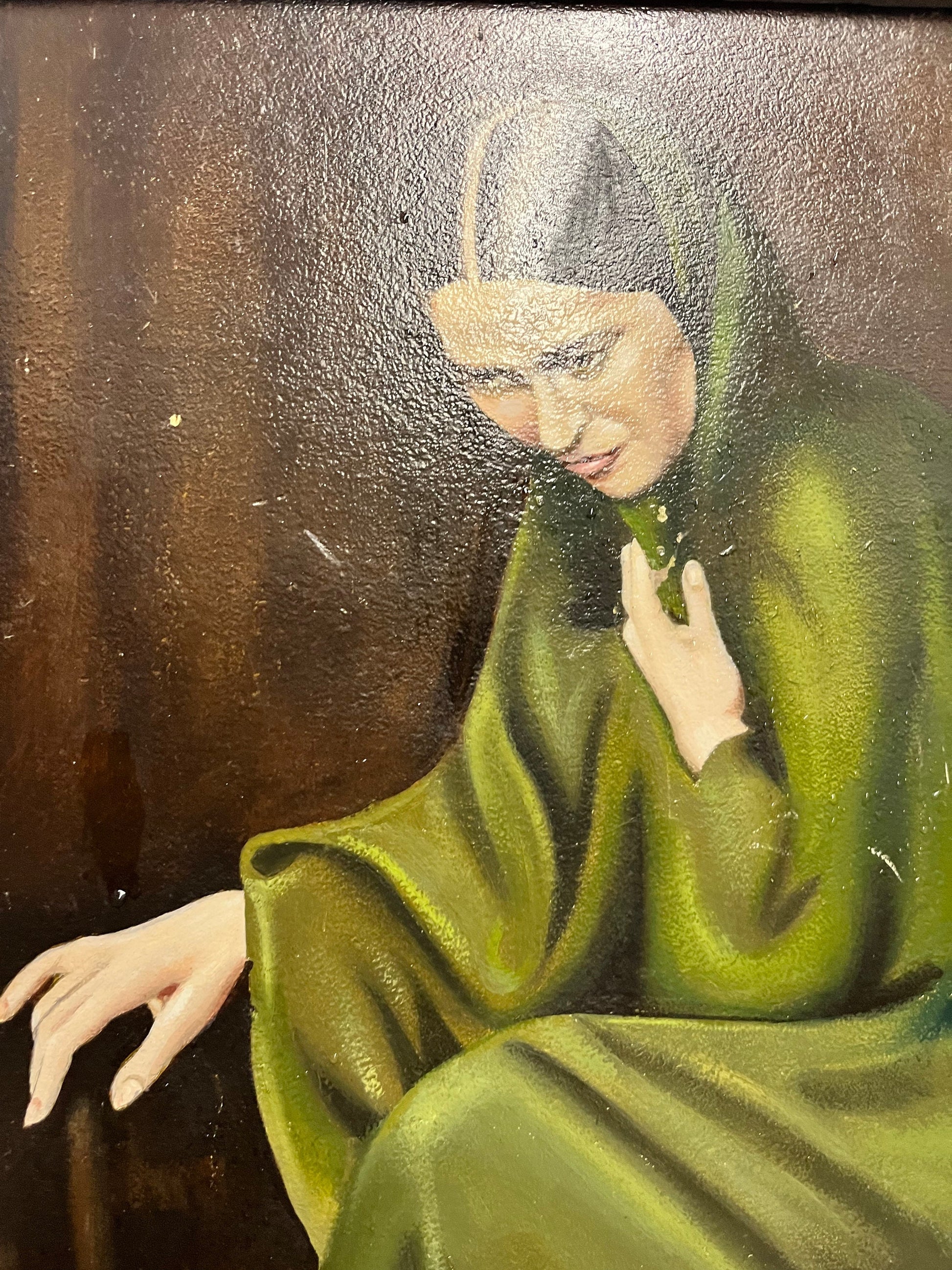 A few minor scratches on the canvas, but nothing serious, and kind of adds to its charm and the detail in the hands and the chair and the robes and the face are all stunning