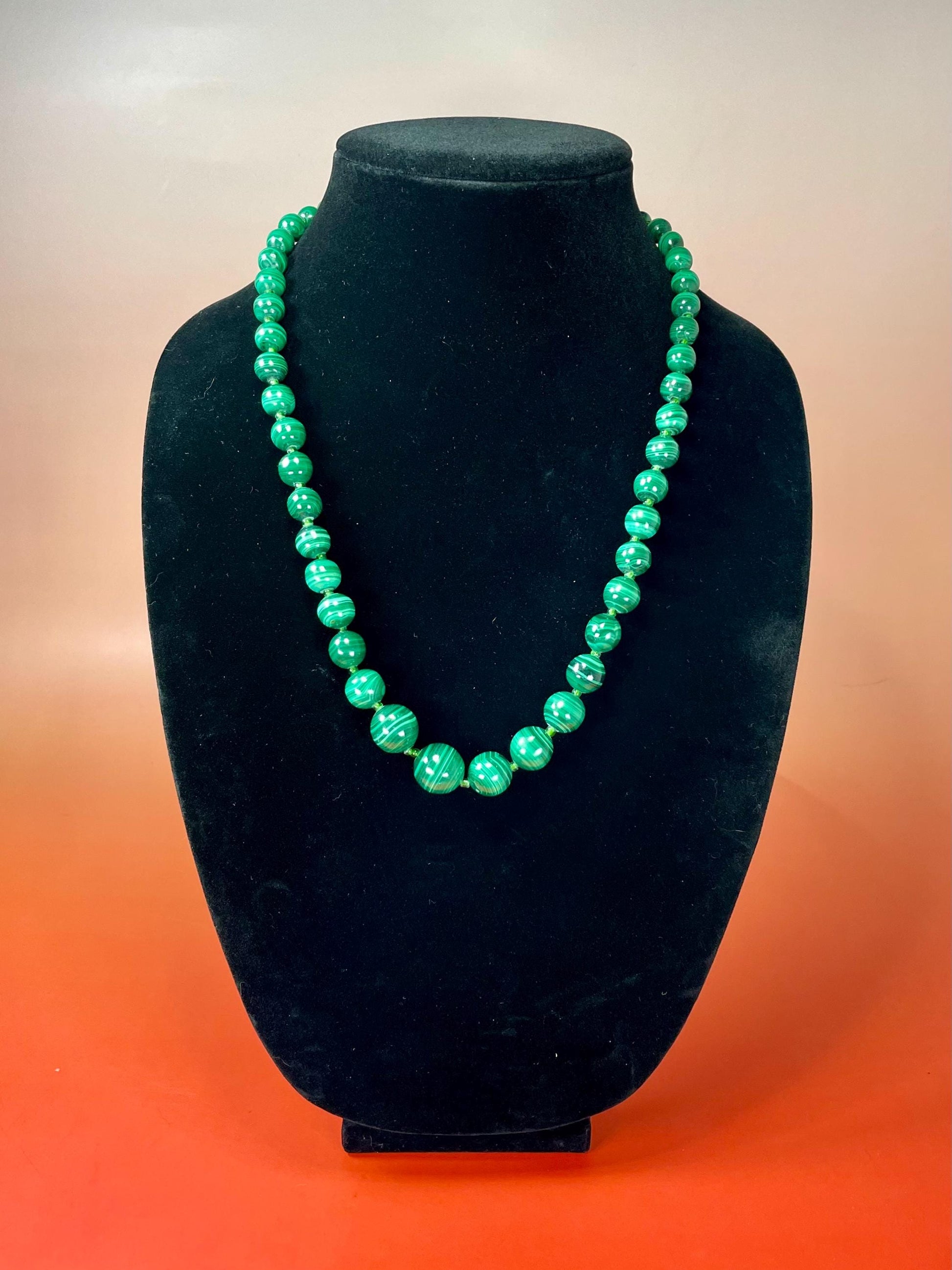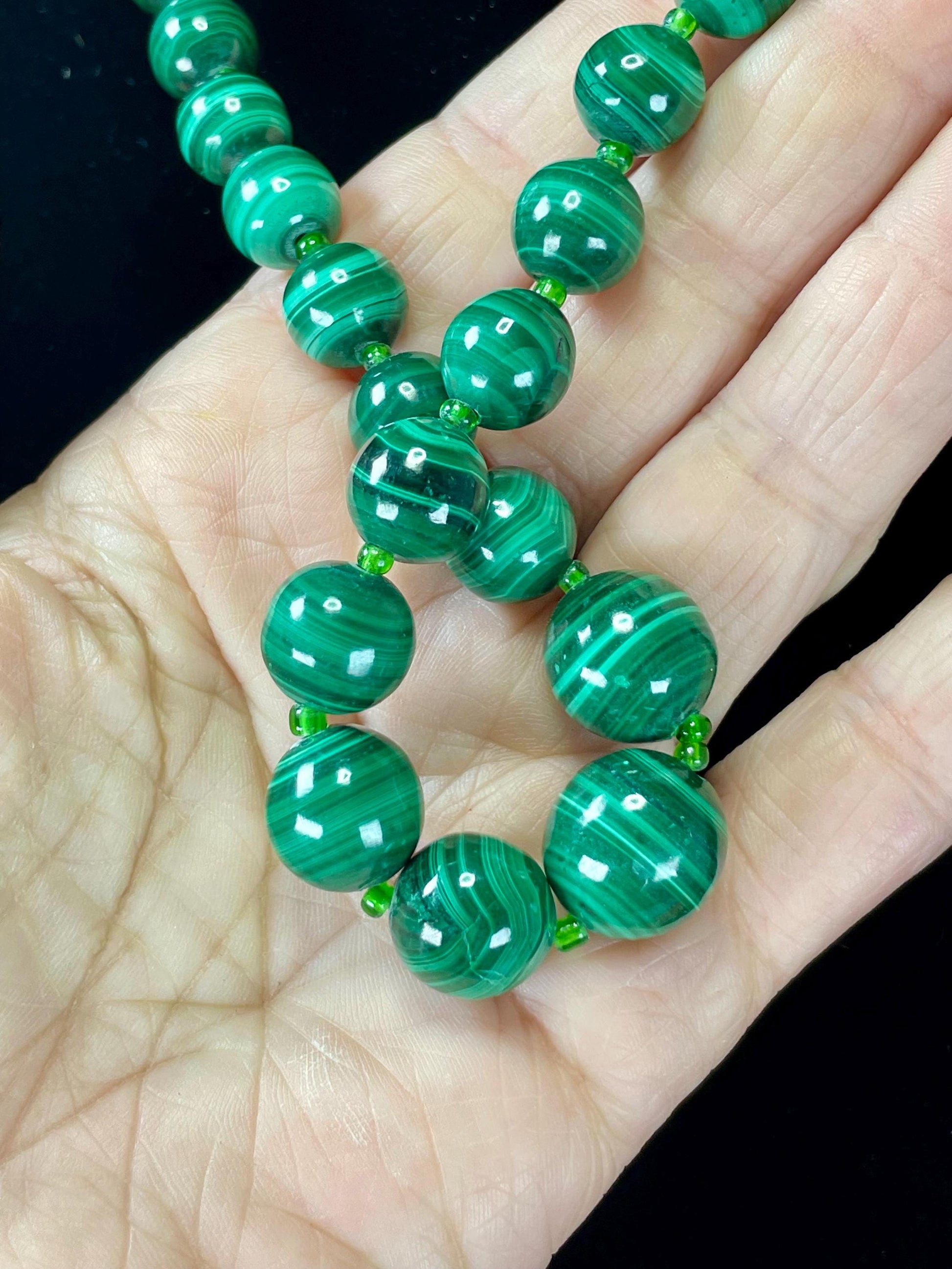 Striking 23-inch necklace made of deep green glass beads with beautiful swirled patterns, separated by small translucent green spacers.