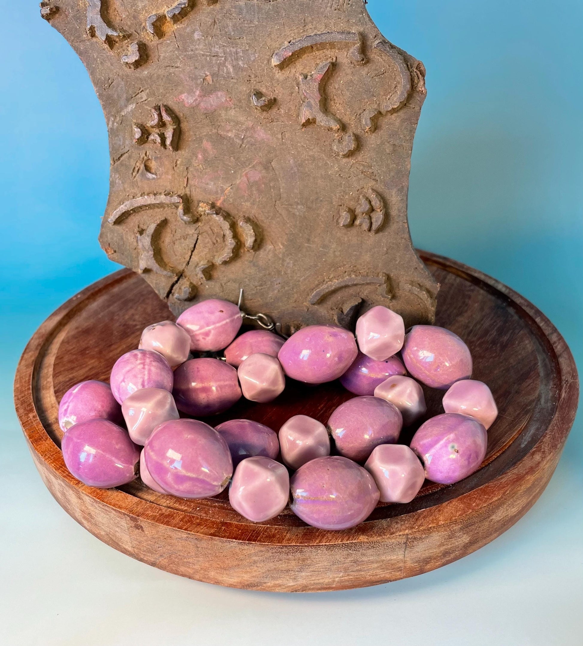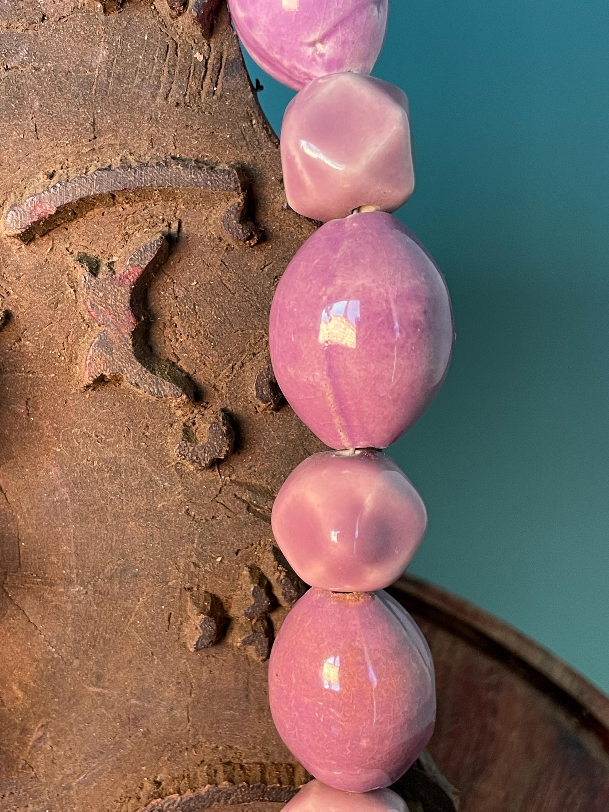 This unique 25.5-inch necklace showcases bold pottery beads in a rare and unique color palette of soft and vibrant purples.