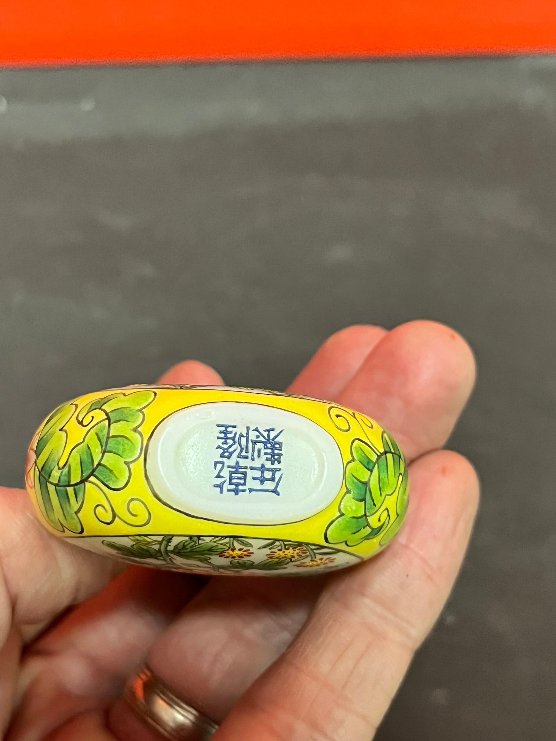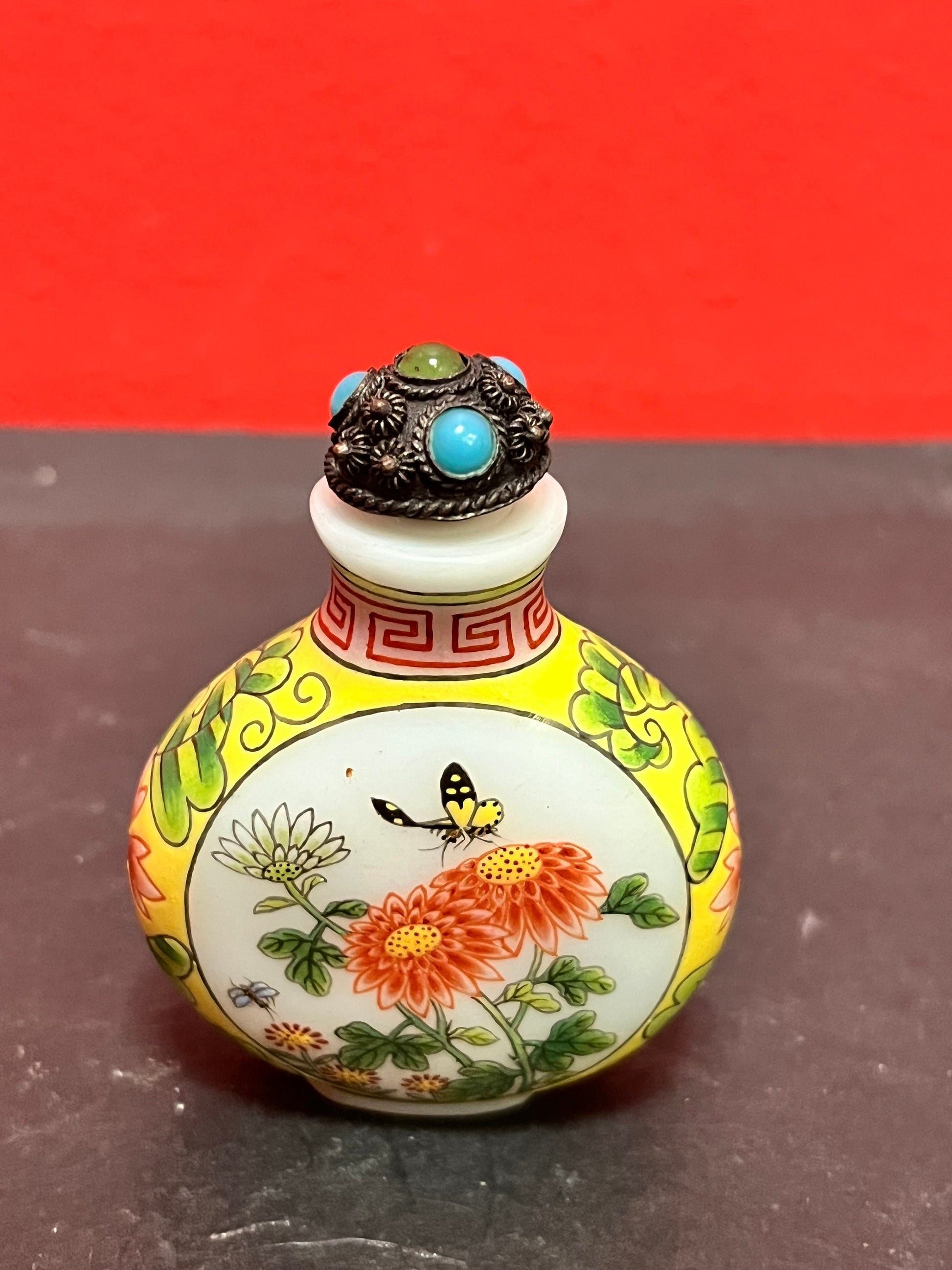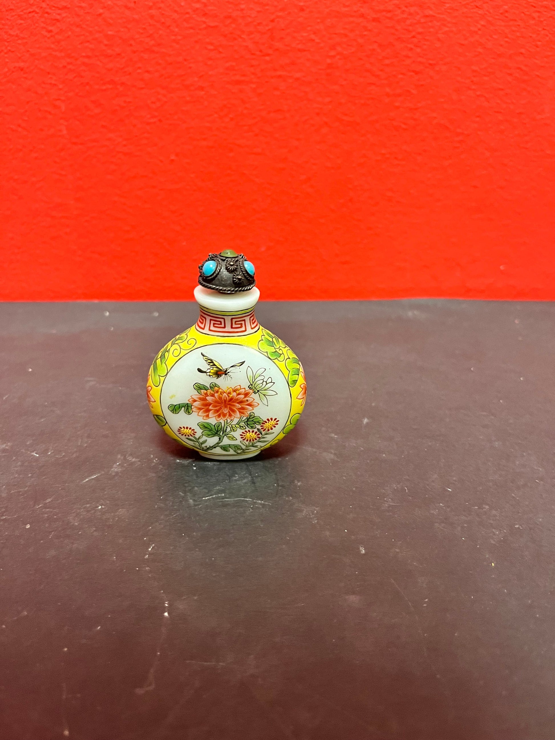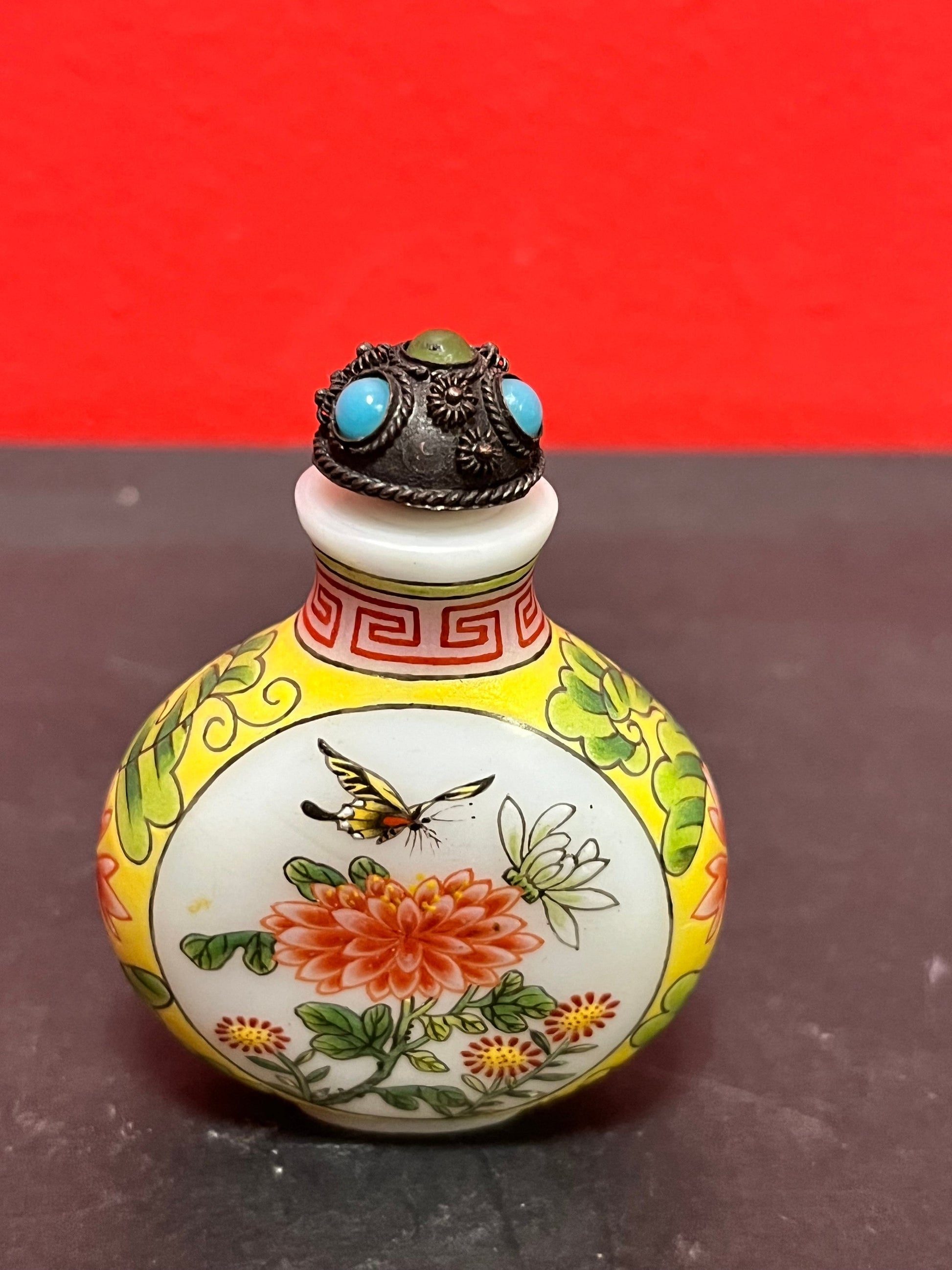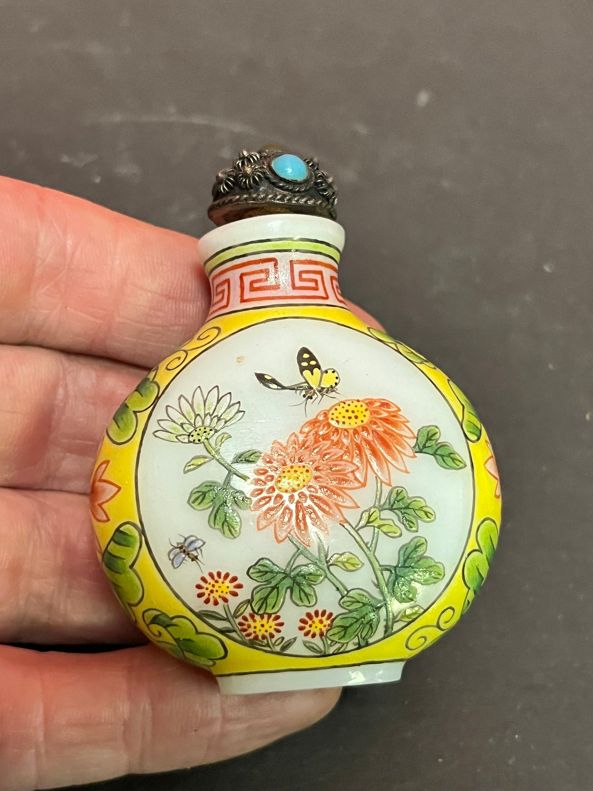 3 inch tall antique signed Chinese enamel and porcelain snuff bottle with decorated lid real beauty wow
