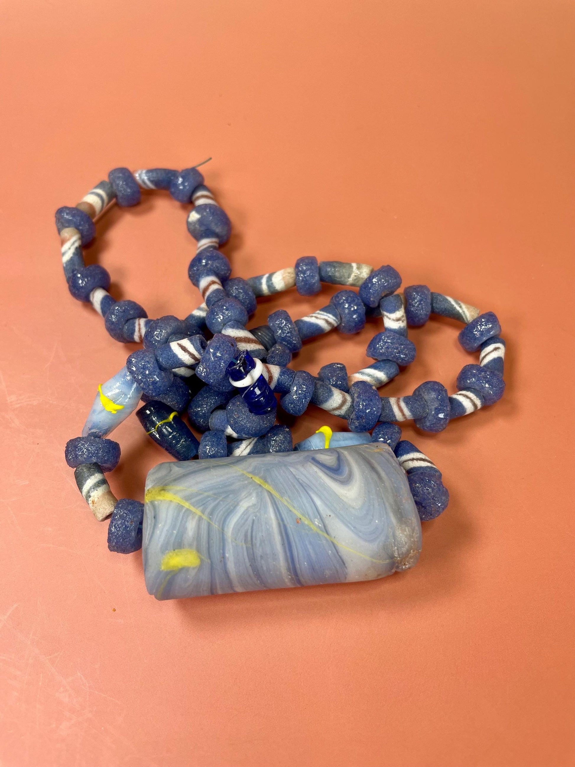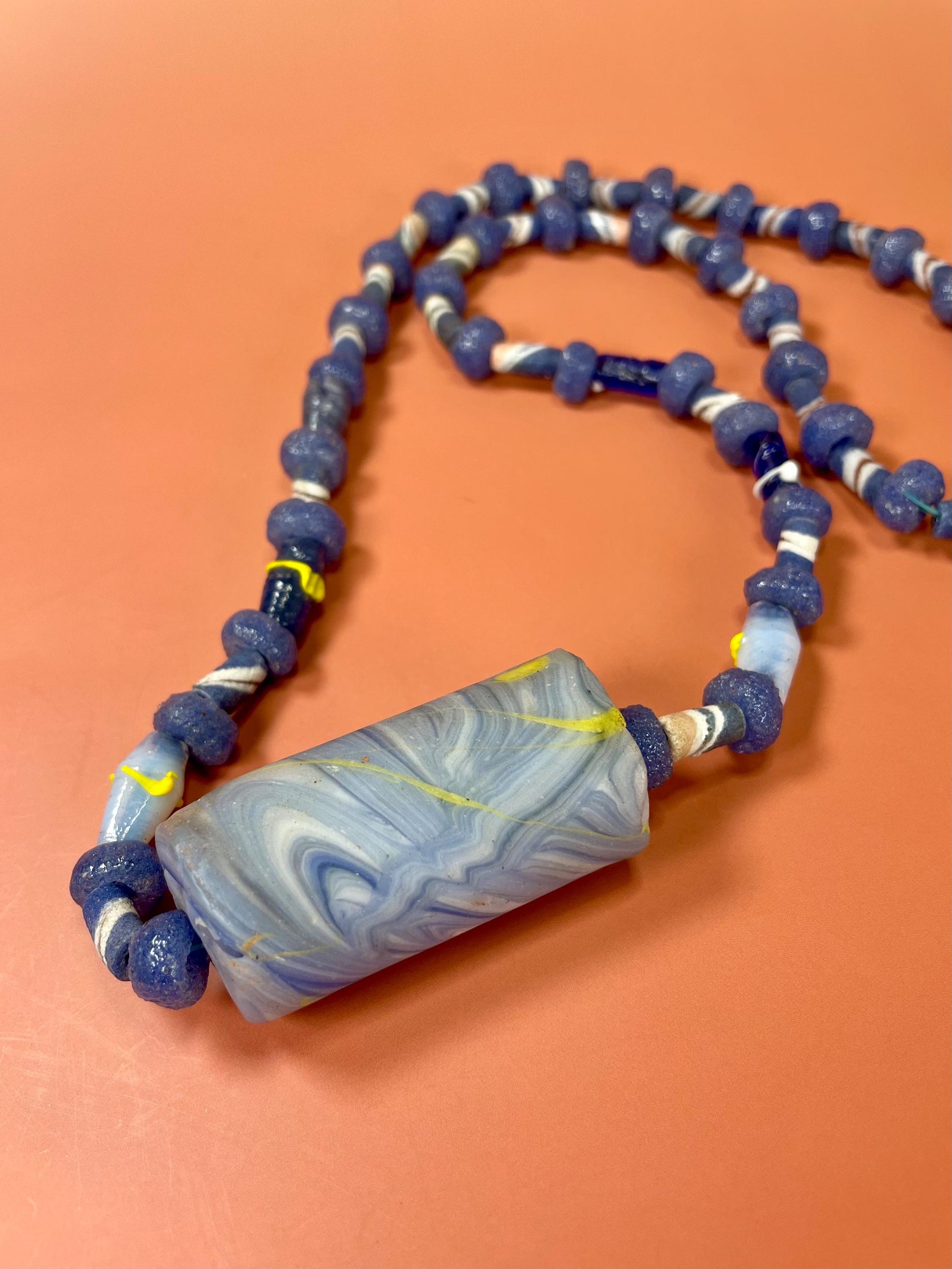 This heavy 30 inch necklace showcases vibrant Venetian glass beads in a stunning blue colour with yellow accents for a striking, artisanal look.