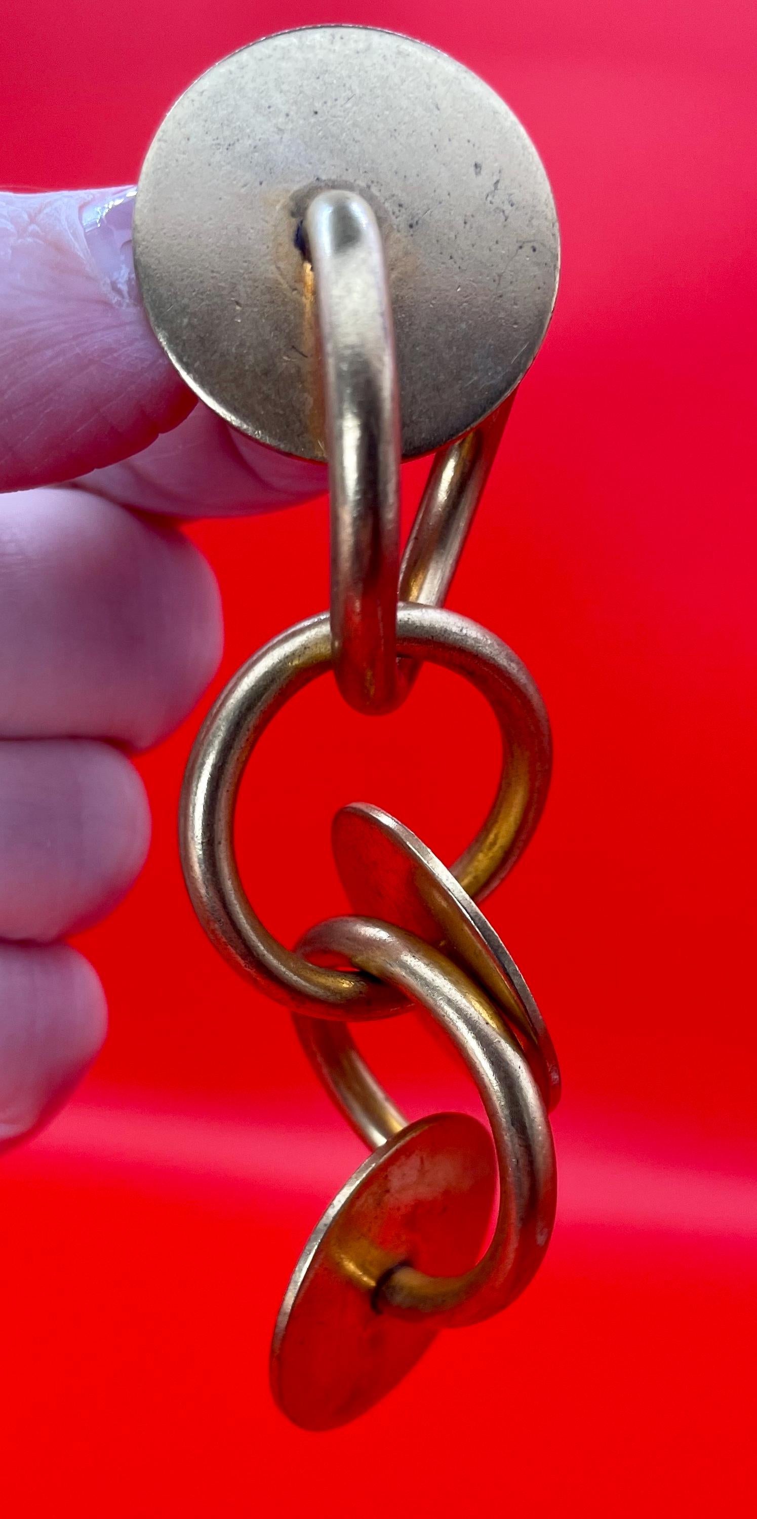 These 4 inch mid-century modern gold metal chain clip-on earrings feature a sleek, stylish design. One clip is weak, and the earrings are sold as is, offering a unique vintage look with room for restoration.