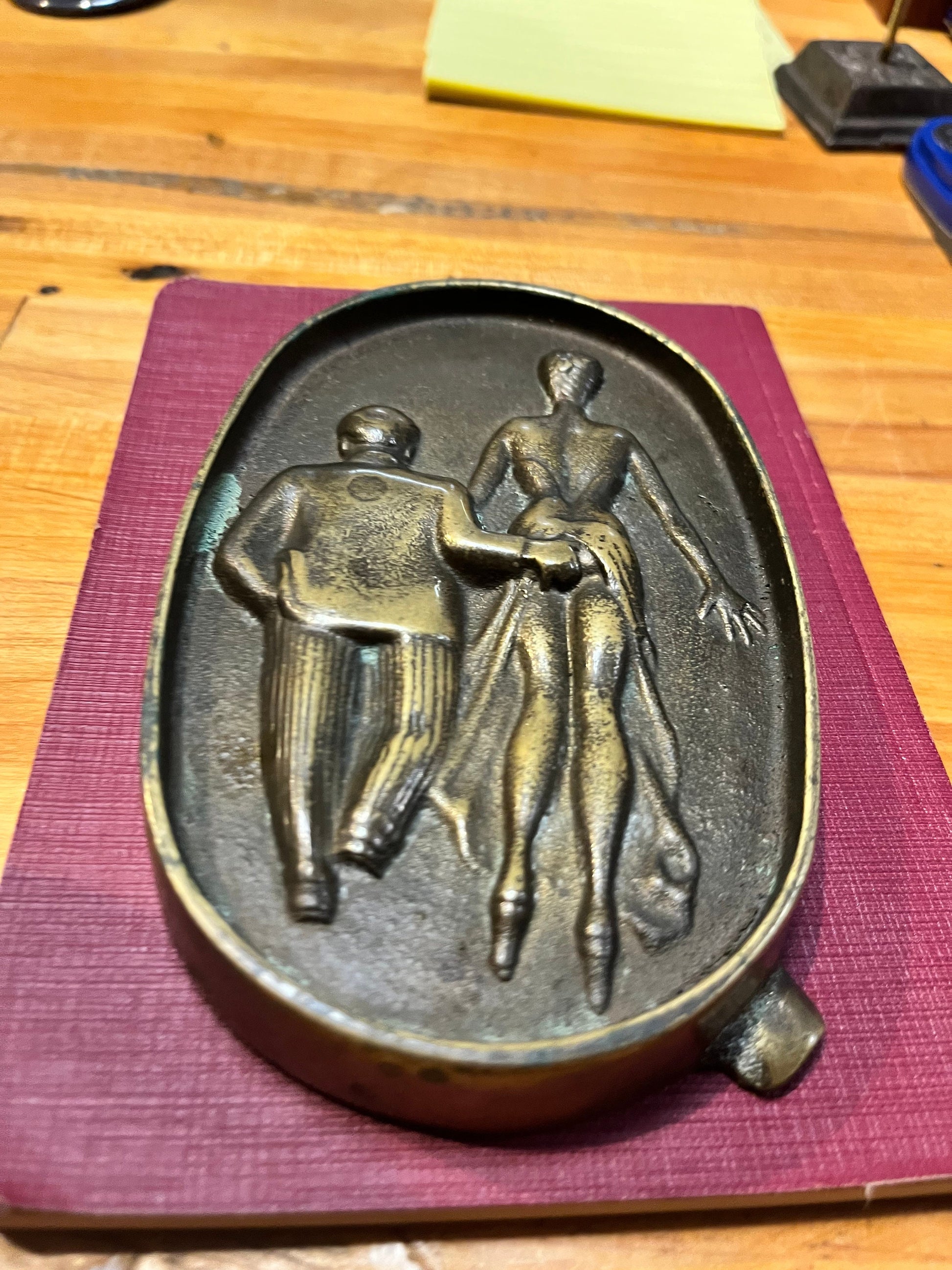 5.5 inch long antique naughty bronze ashtray amazing patina and such a cool piece.