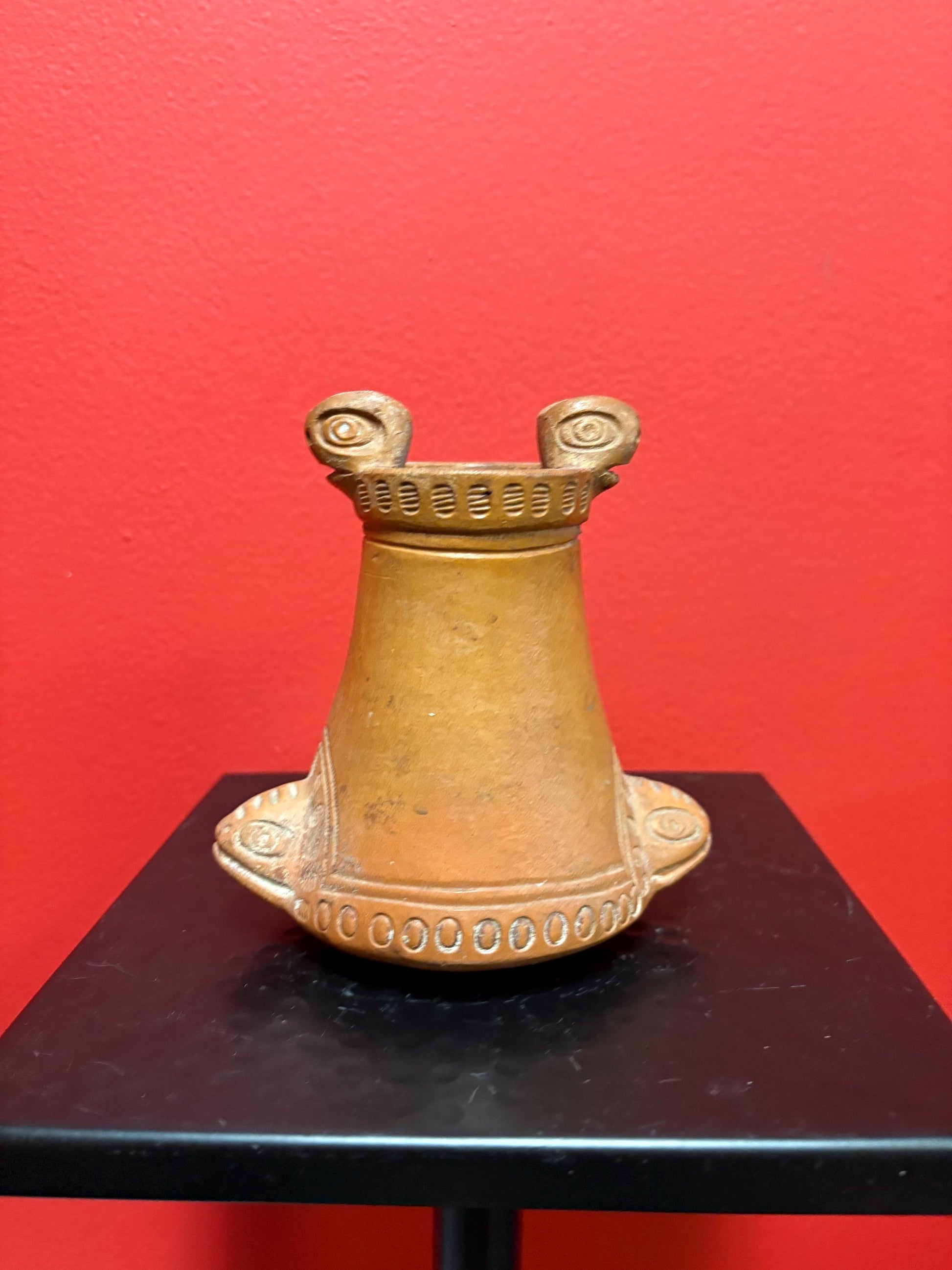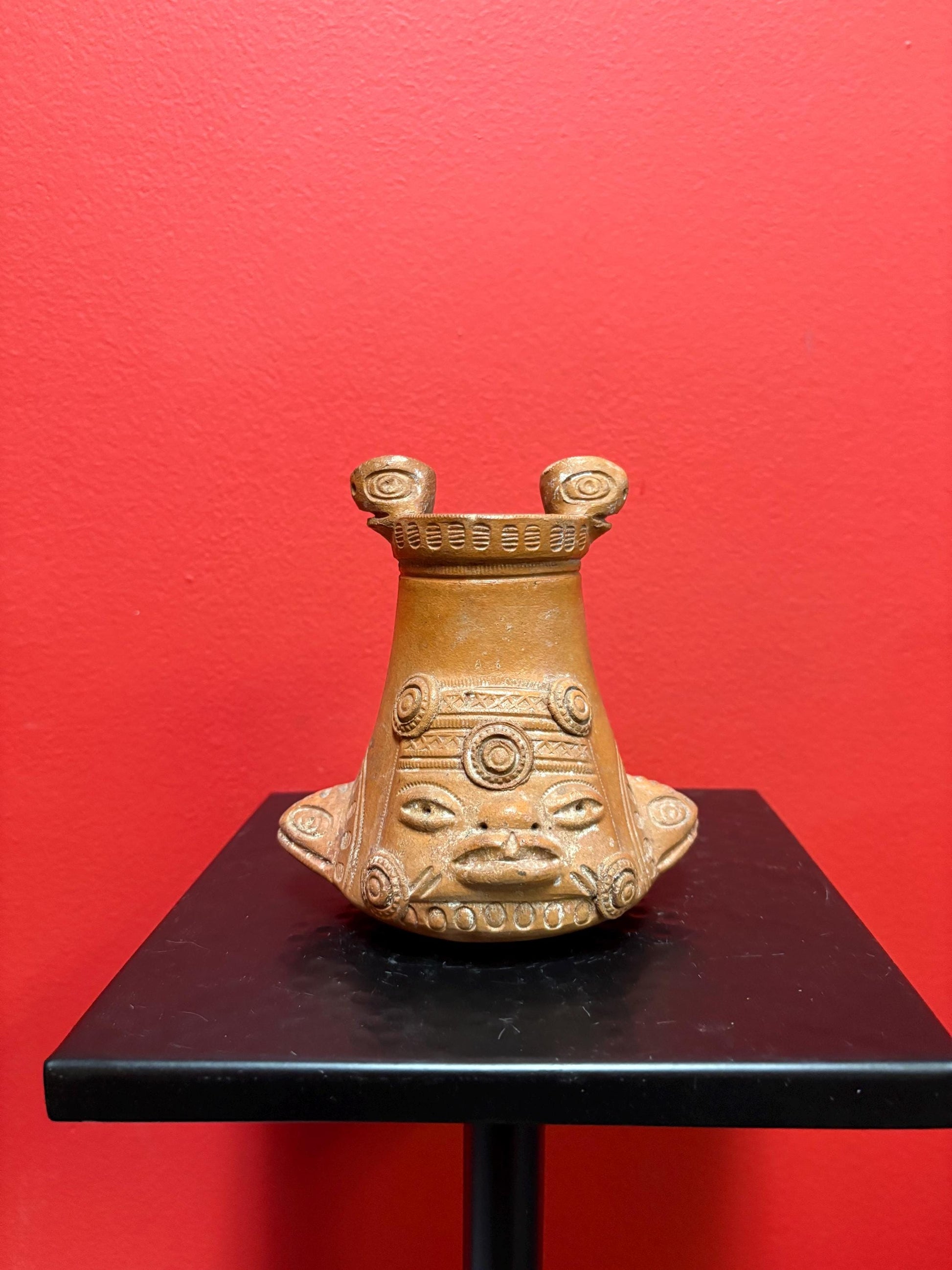 6 inch cool columbian clay ashtray pot — great imagery — older piece — no provenance — great price