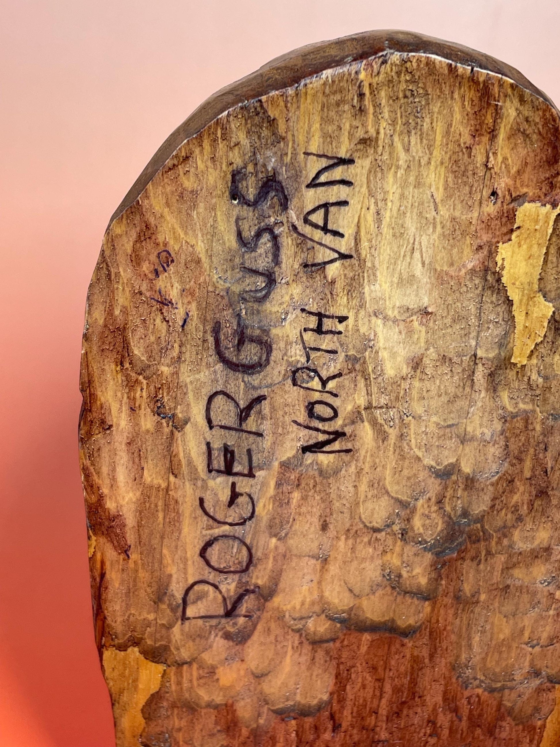 Approximately 6 inches tall hand carved head. Signed by Vancouver BC artist Roger Guss. Skillfully carved from a single piece of wood. Can stand on its own, or could be hung.