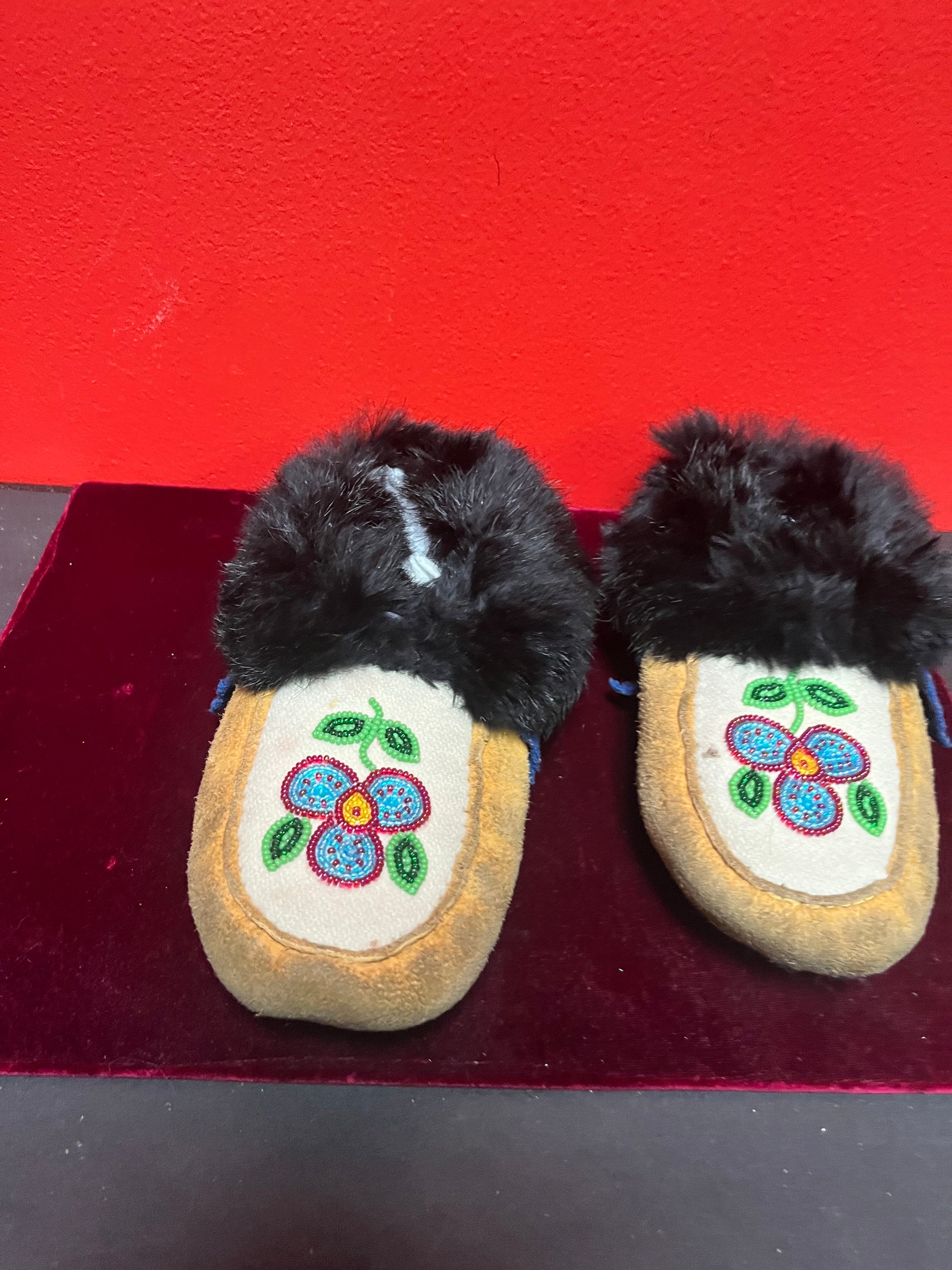 7 1/2 inch long indigenous First Nations Pacific Northwest coast beaded and leather and fur moccasin shoes good condition