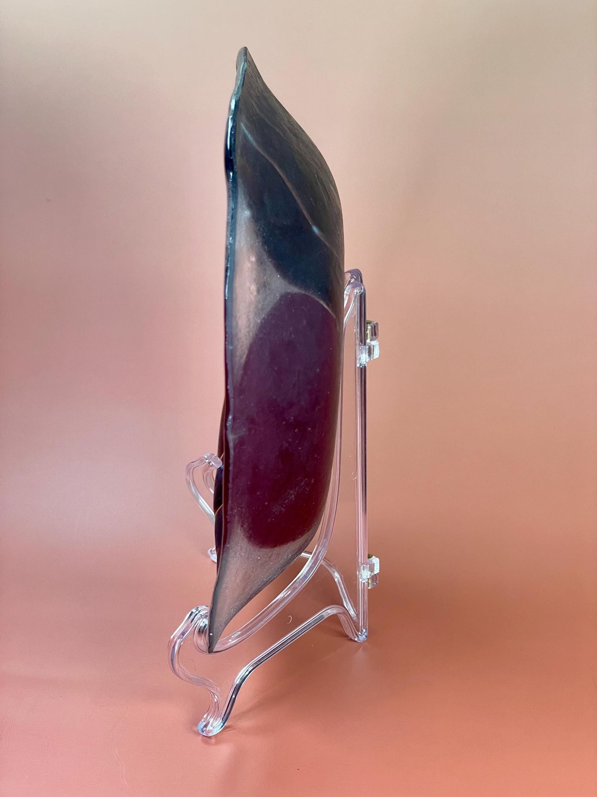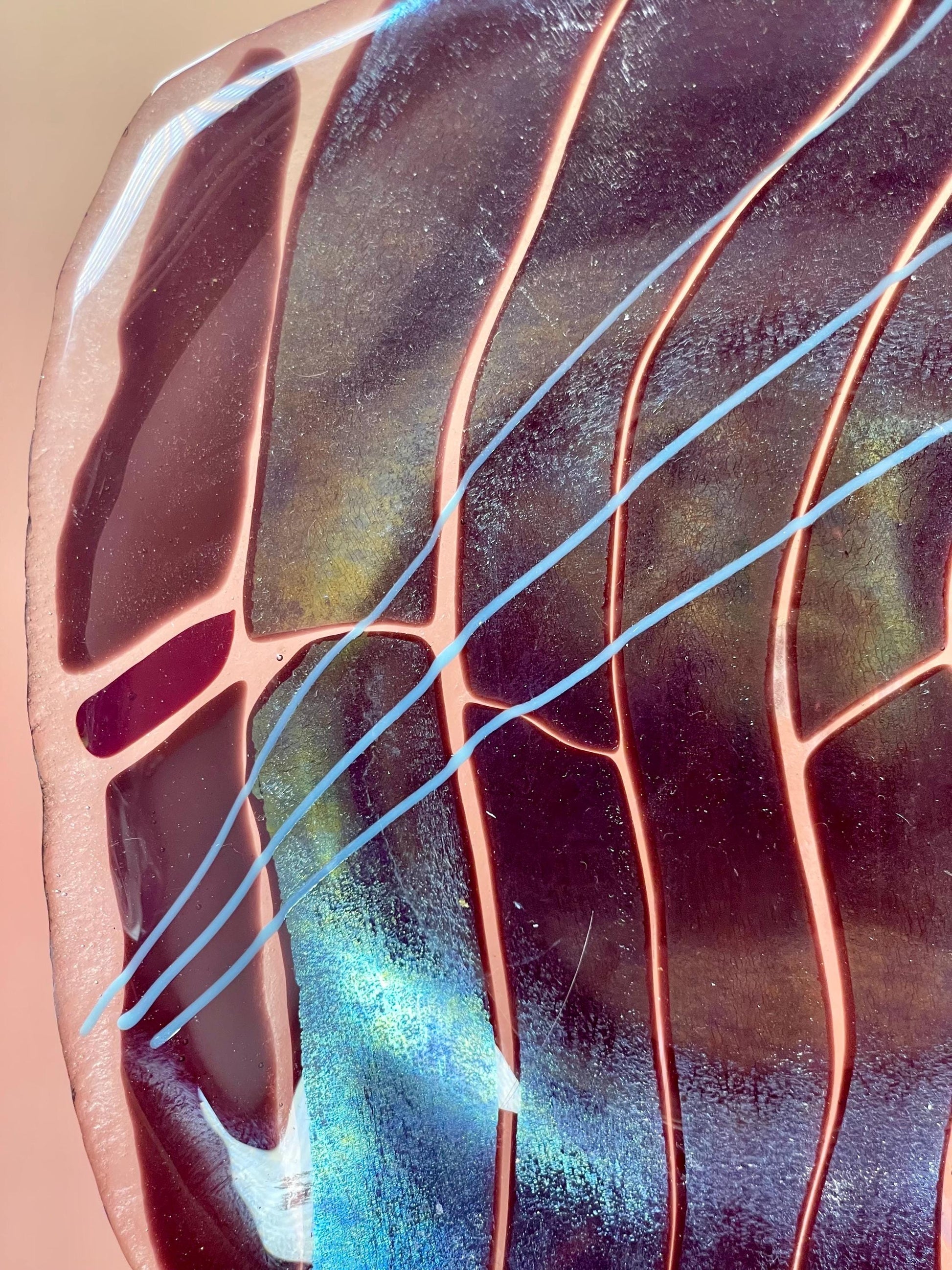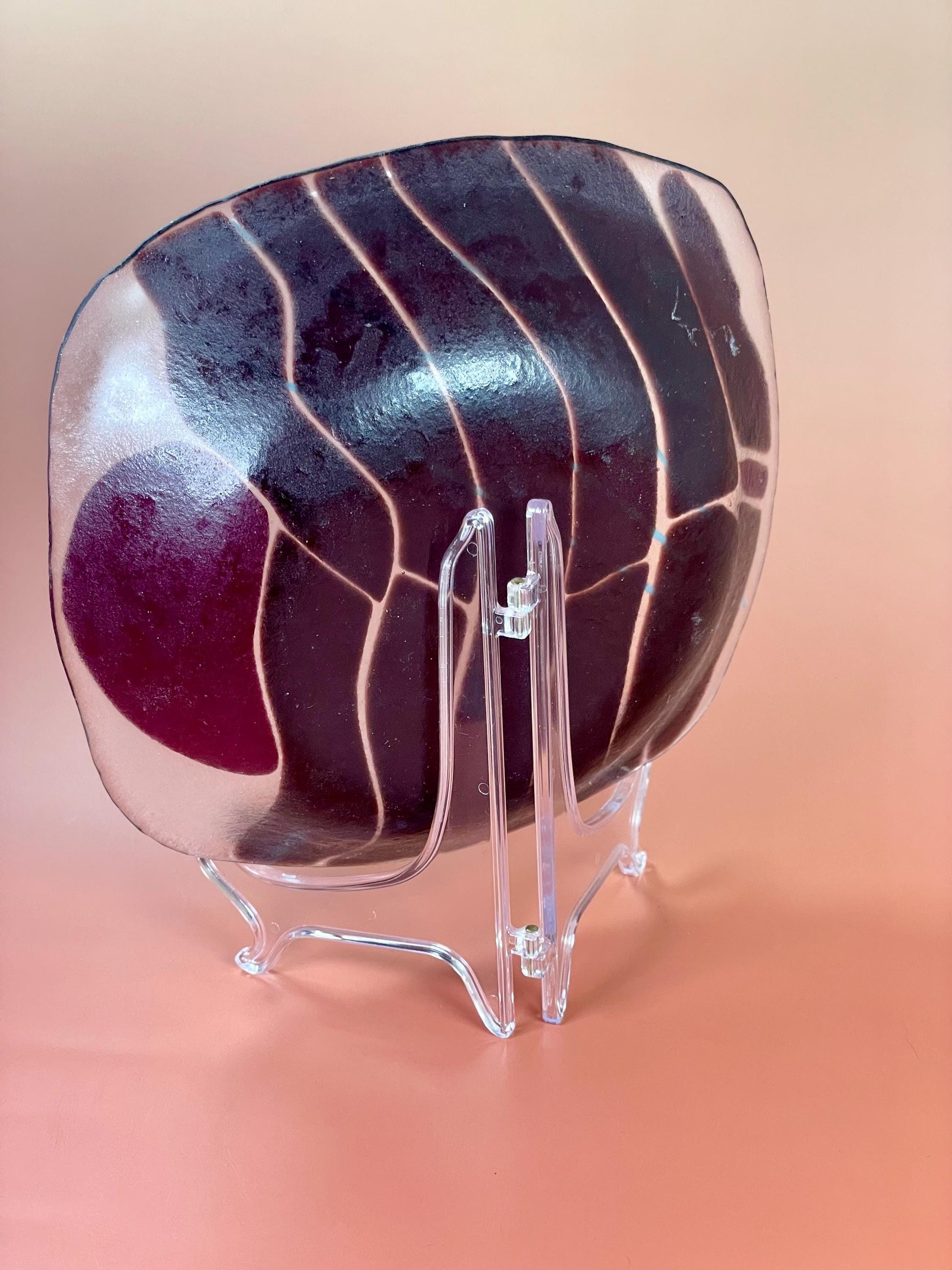 This handmade artisan glass plate features vibrant red base colours with striking blue stripes, adding a bold and artistic touch to your tableware. Perfect for those who appreciate unique, handcrafted pieces.