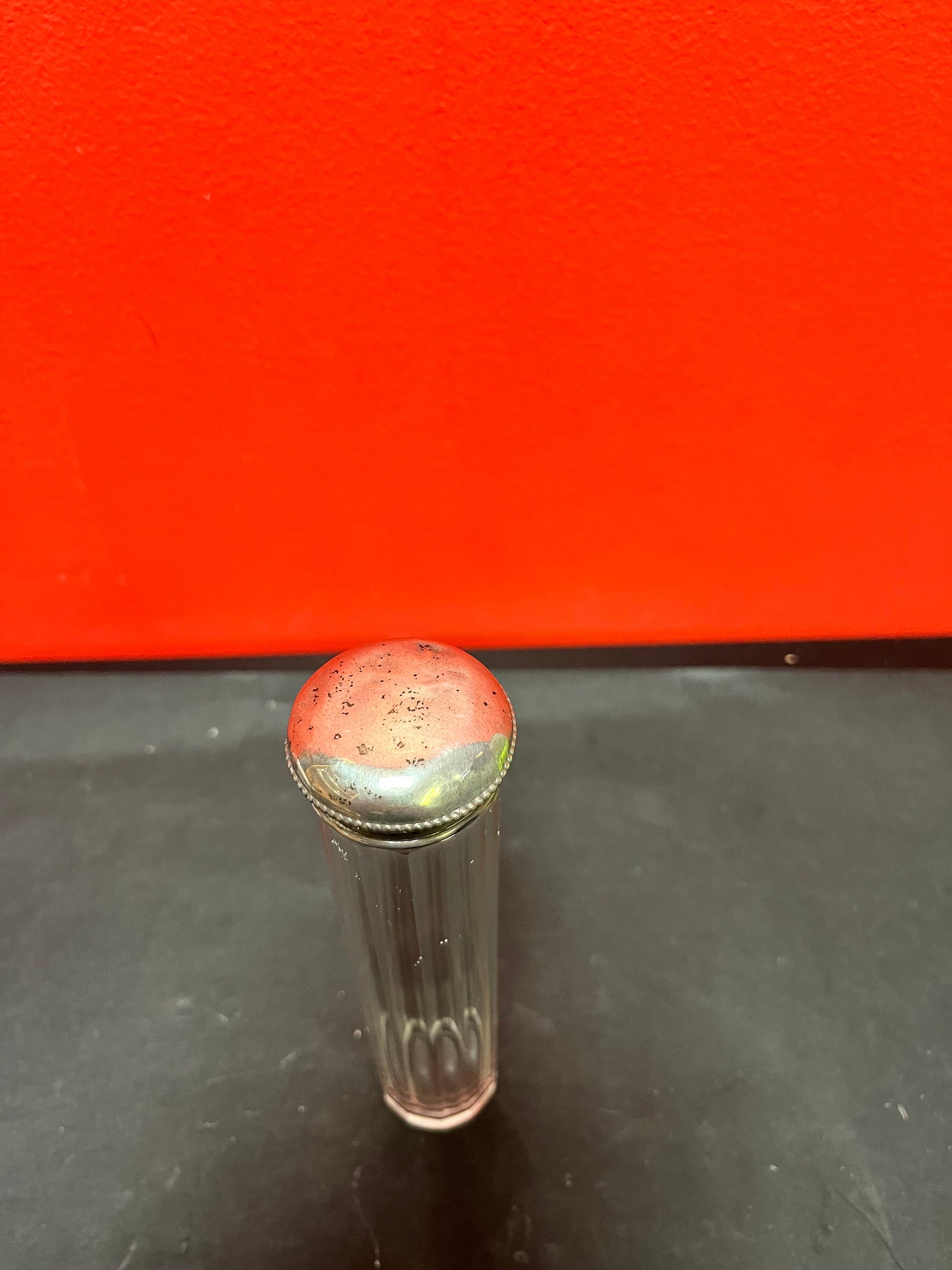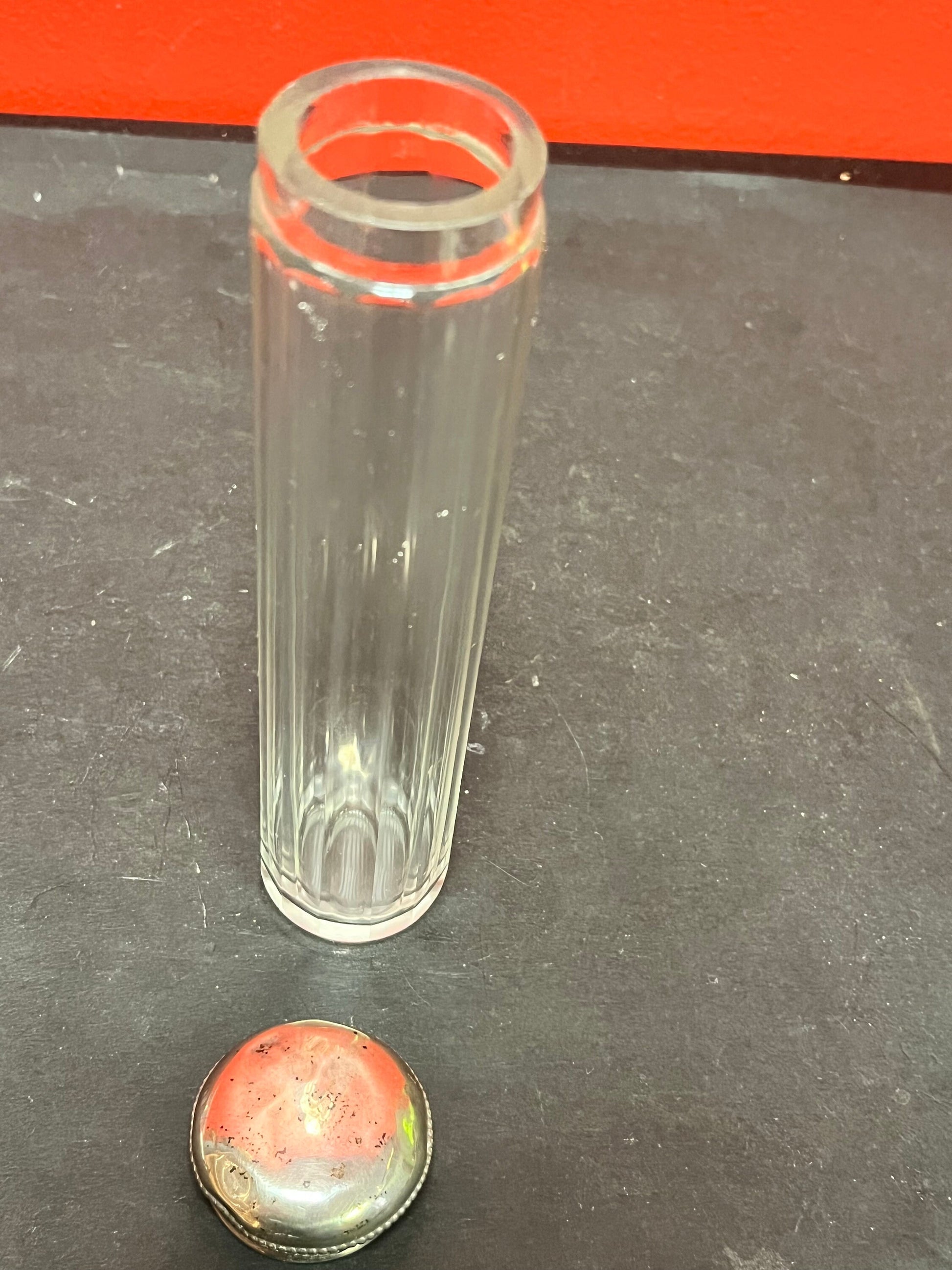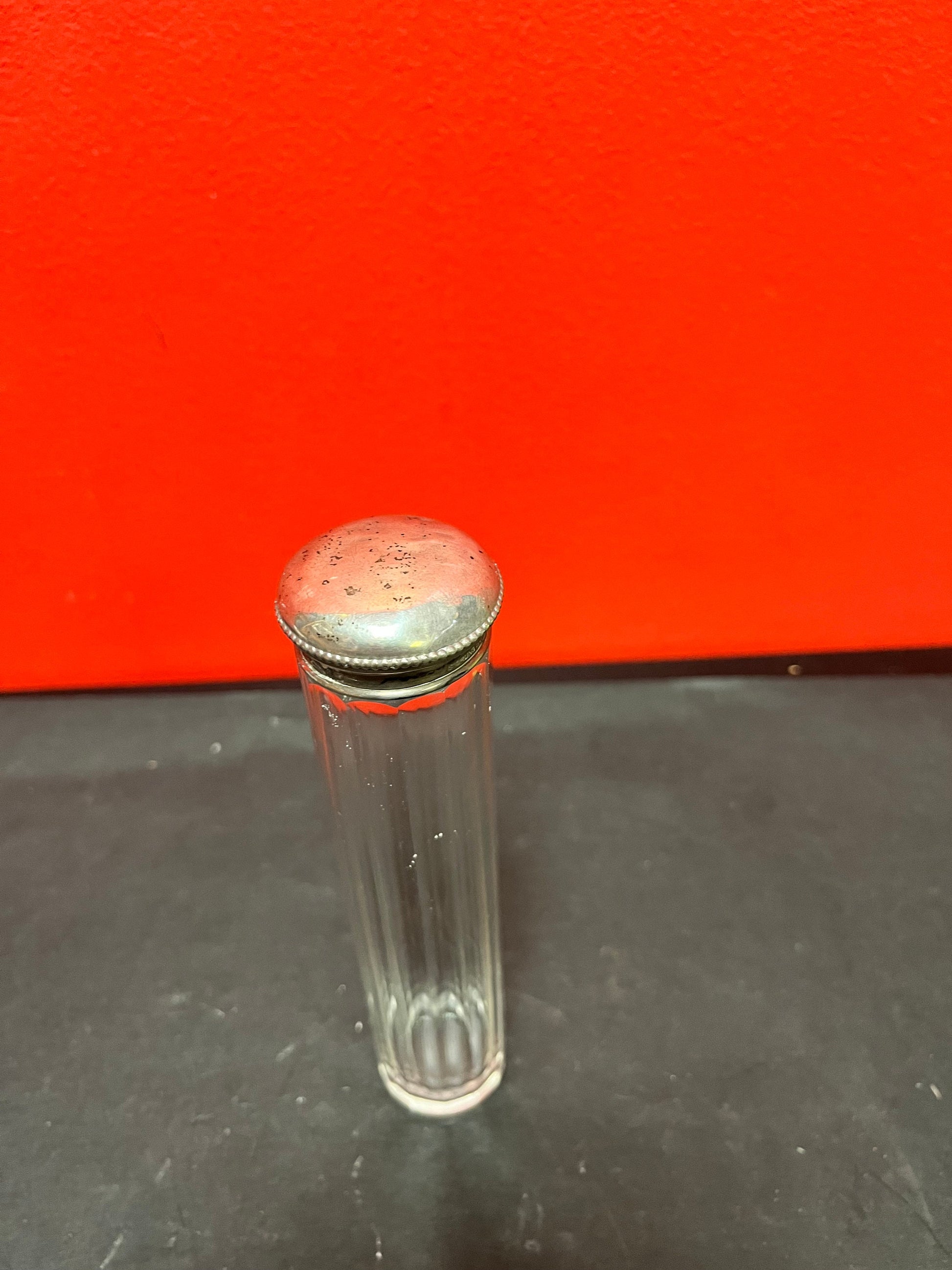7 inch tall crystal and English sterling silver lid powder jar minor dents