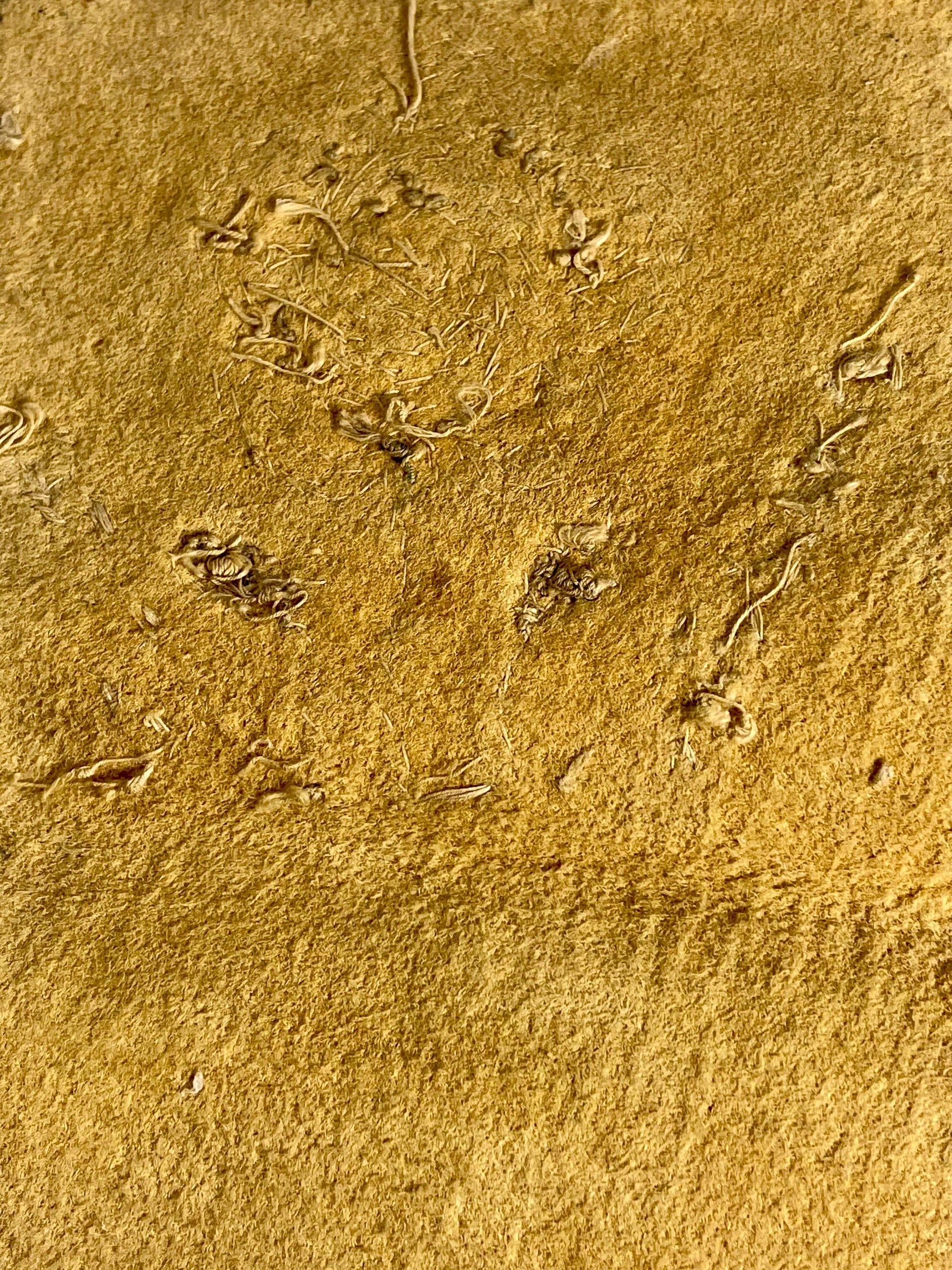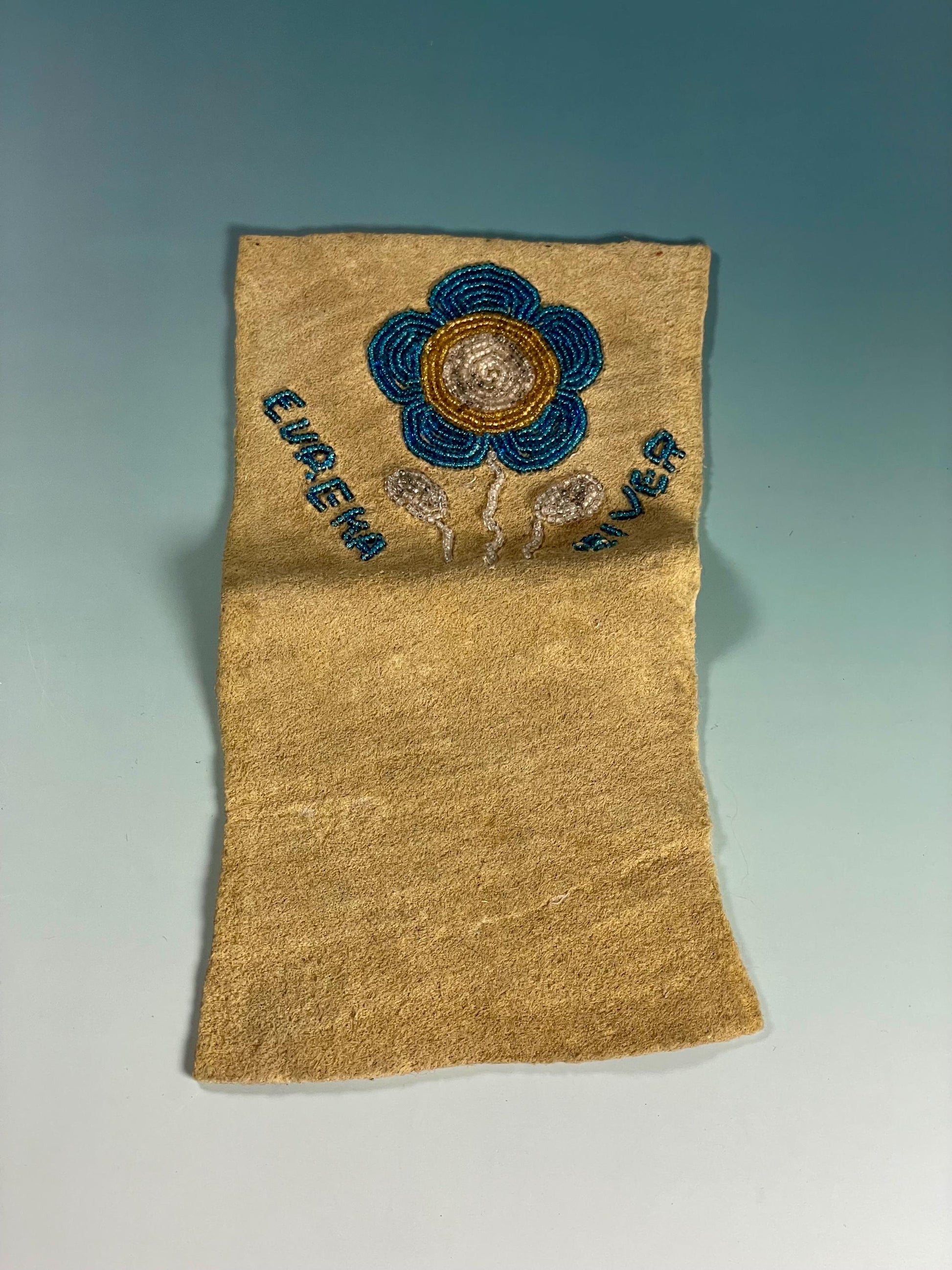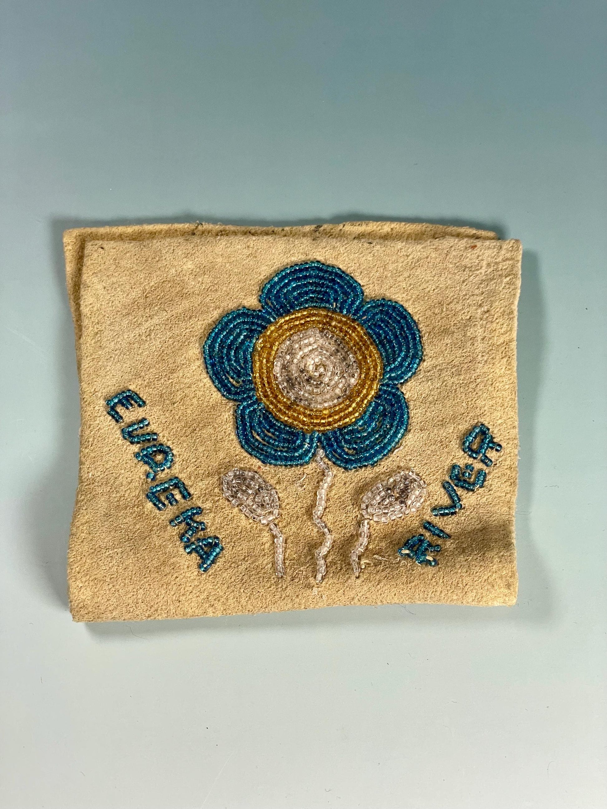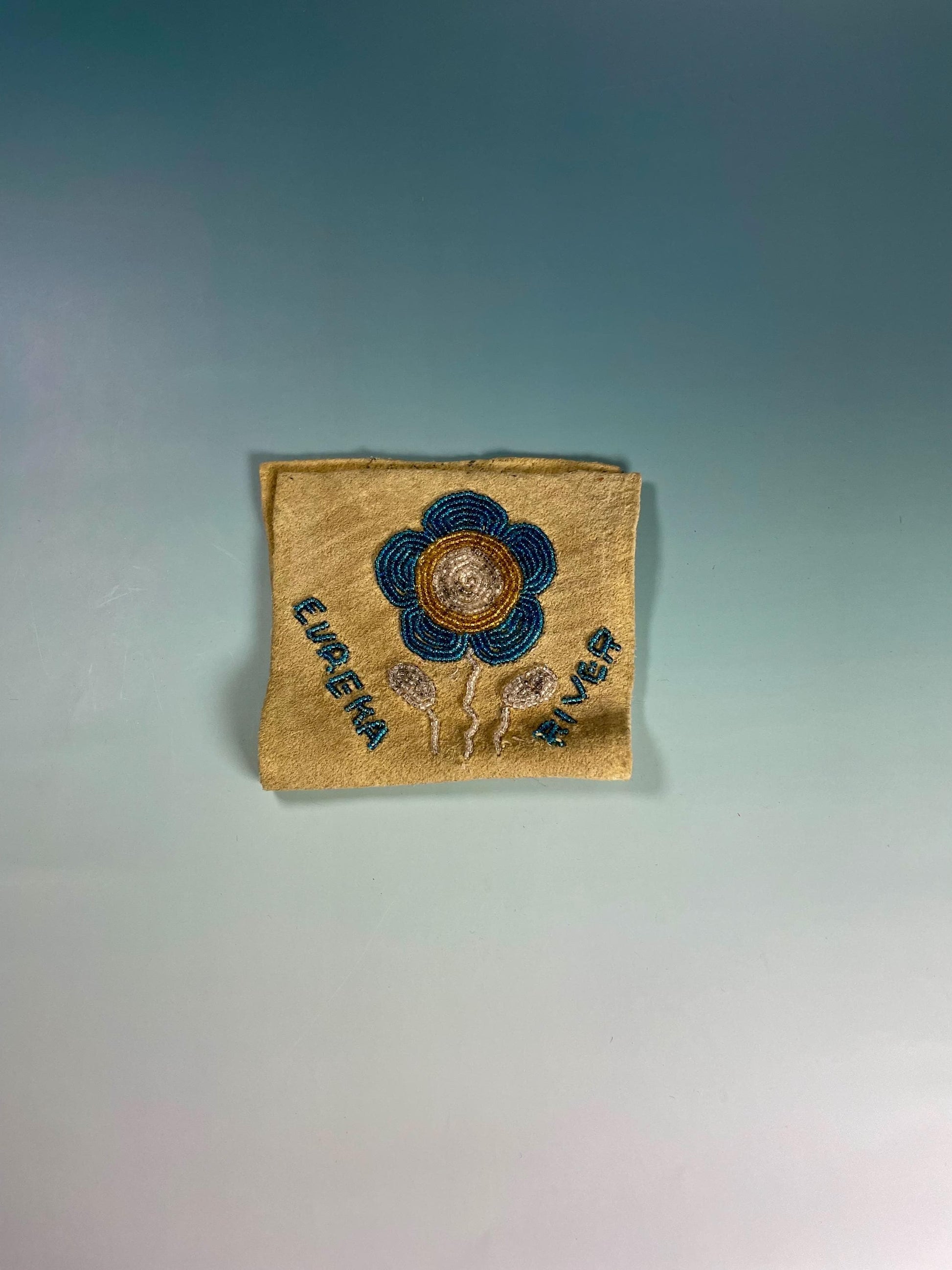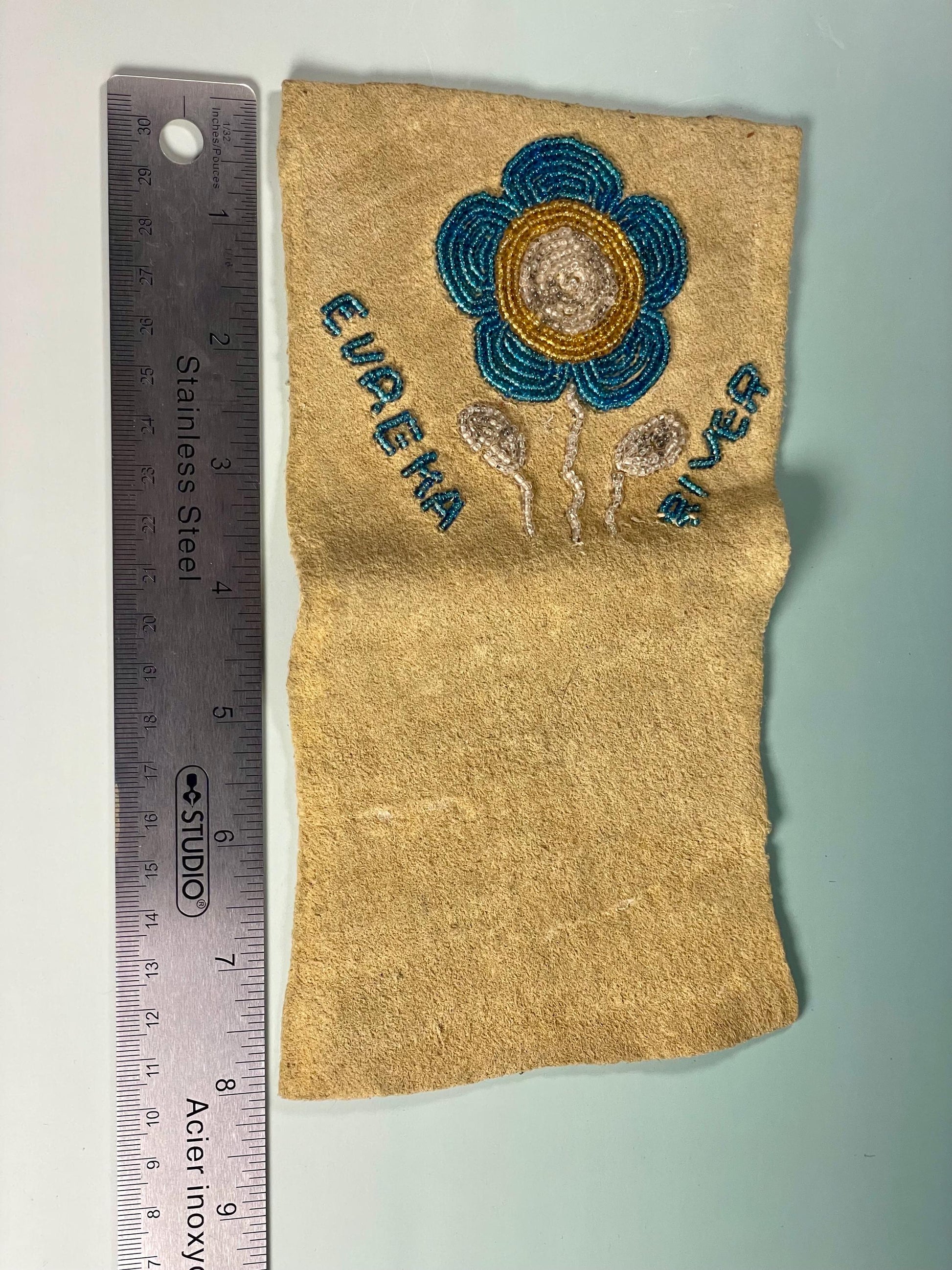 8 x 4.5 inch thick leather piece with a hand beaded design featuring a flower, and the words “Eureka River.