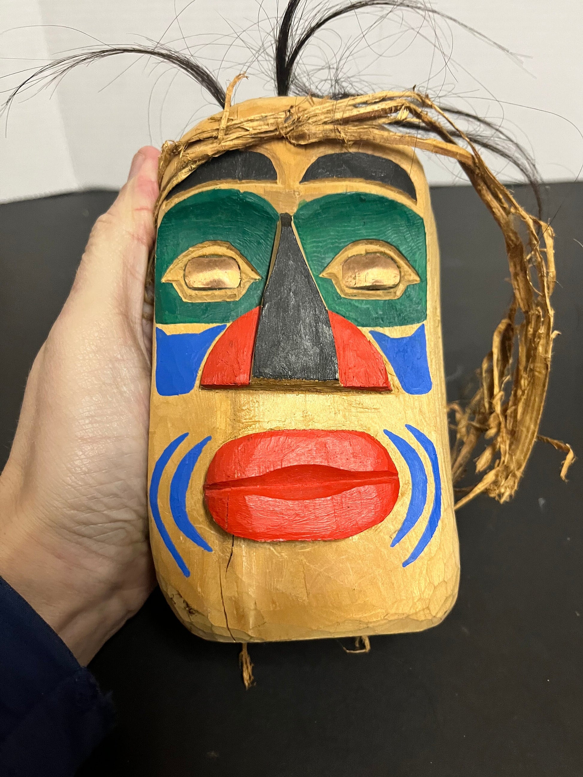 8 x 4 signed authentic stunning, indigenous, first Nations Pacific Northwest coast painted mask with copper eyes really beautiful gift