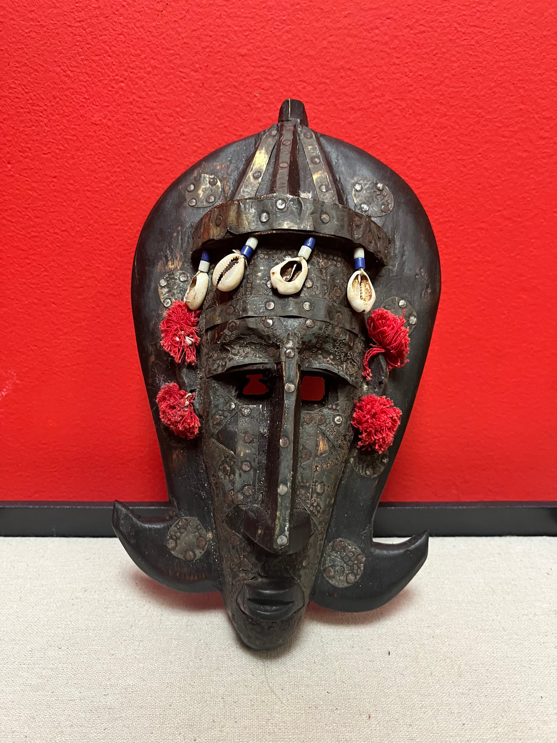 A 10 inch African mask with metal and puka shells very decorative and old