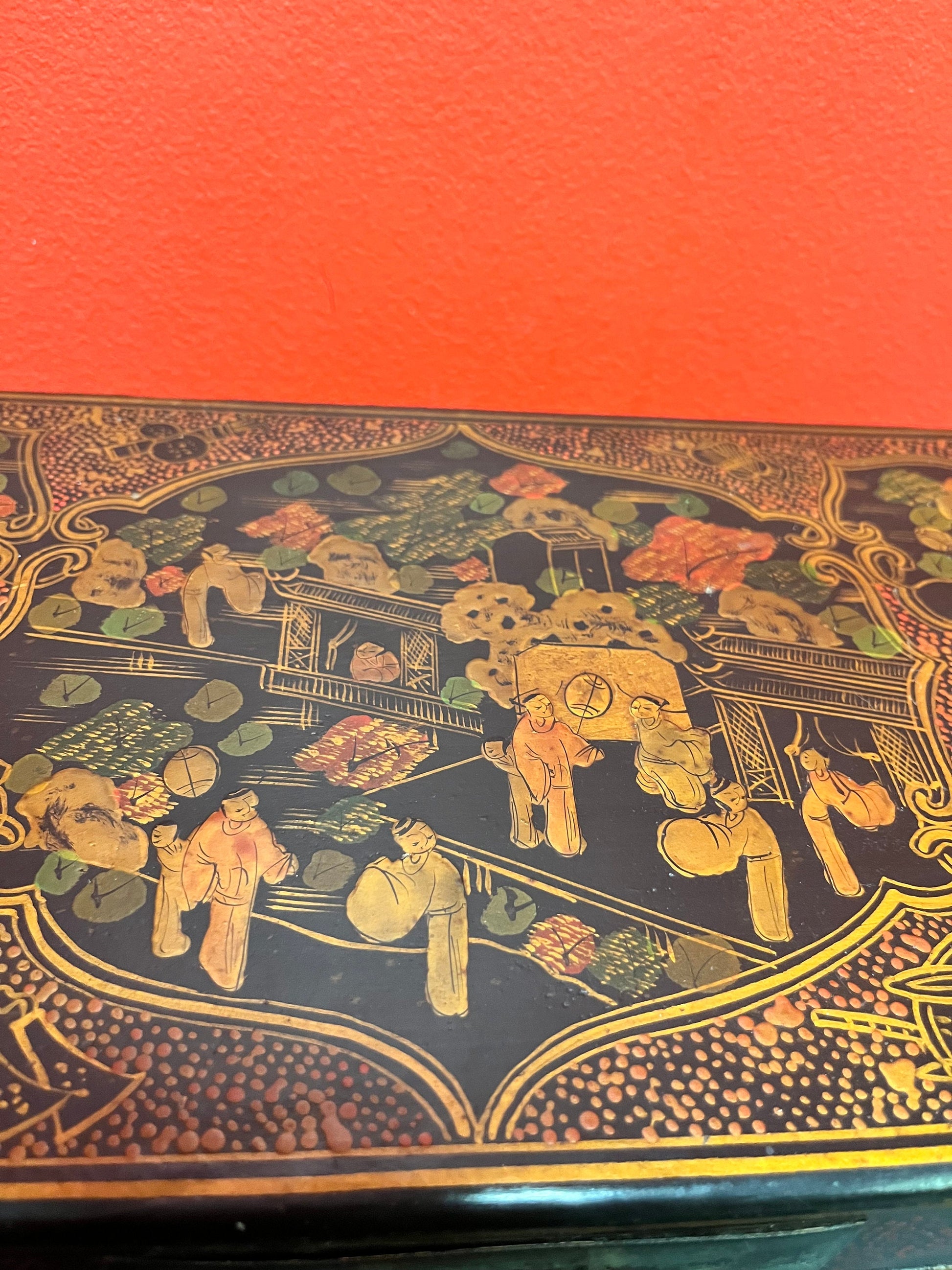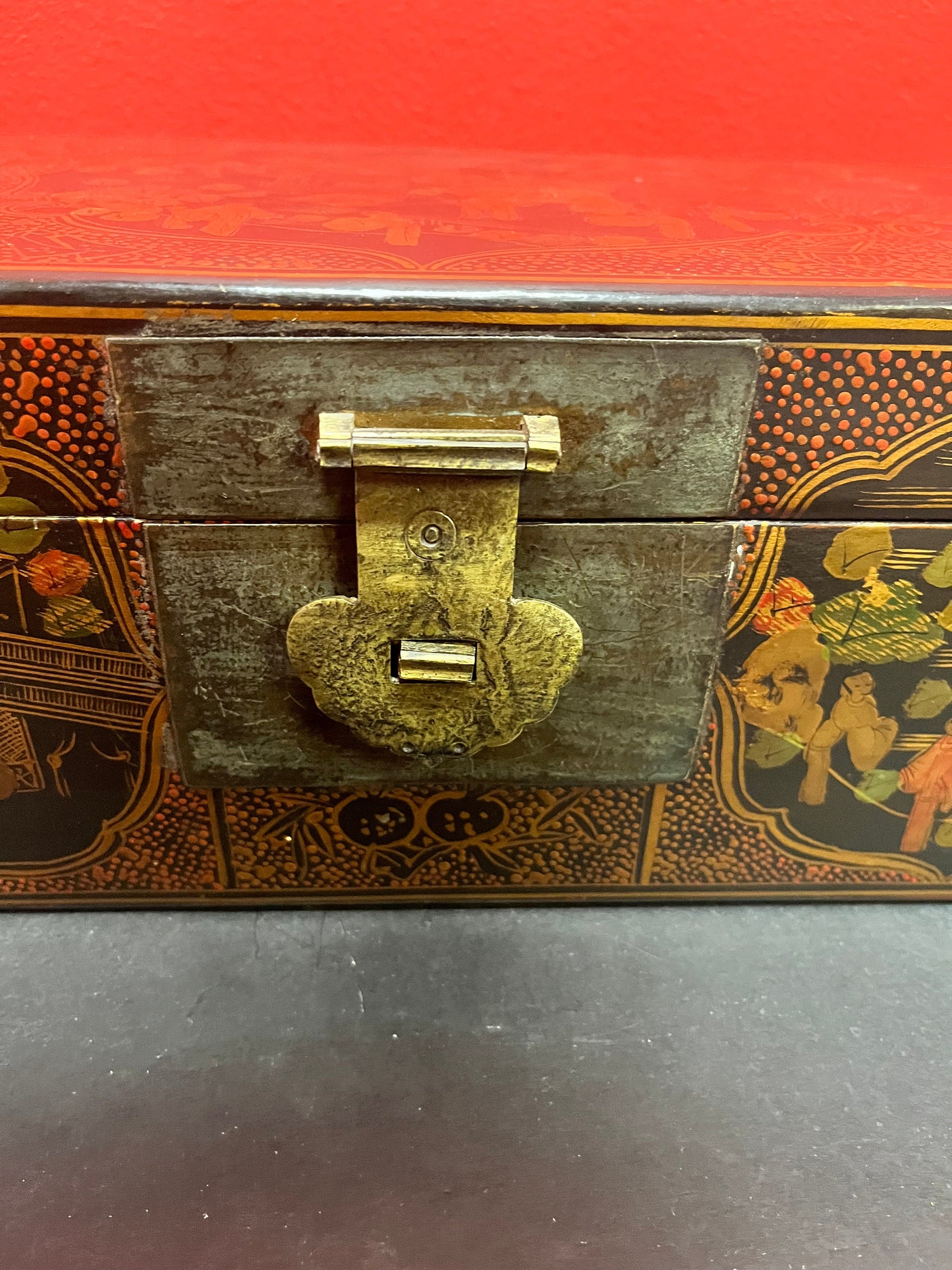 A 14 x 7 x 4 inch high Japanese signed lacquer antique box with bronze latch immaculate condition and detail