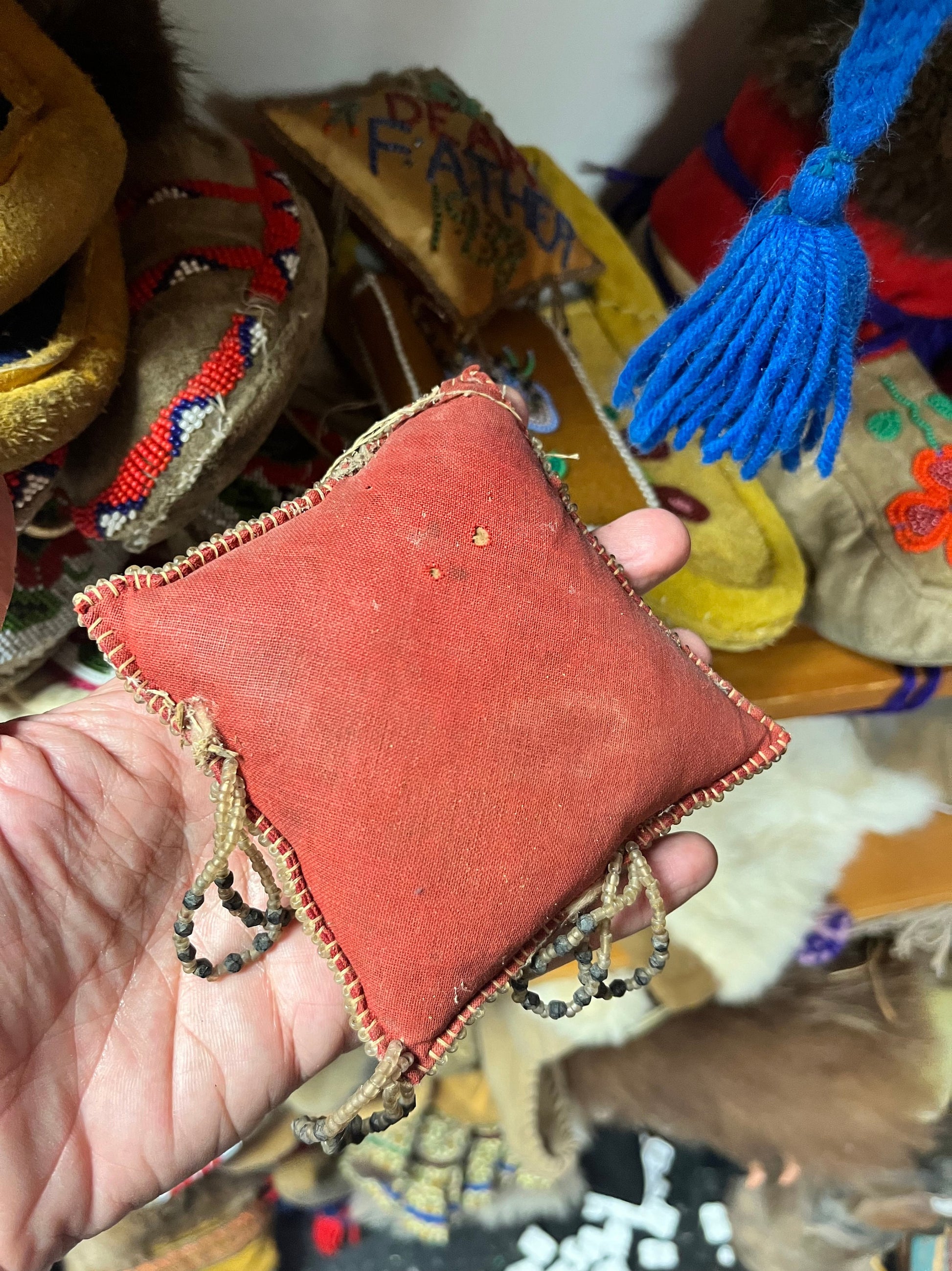 A 4 inch indigenous First Nations pacific northwest coast 1938 beaded cushion mother spectacular as is