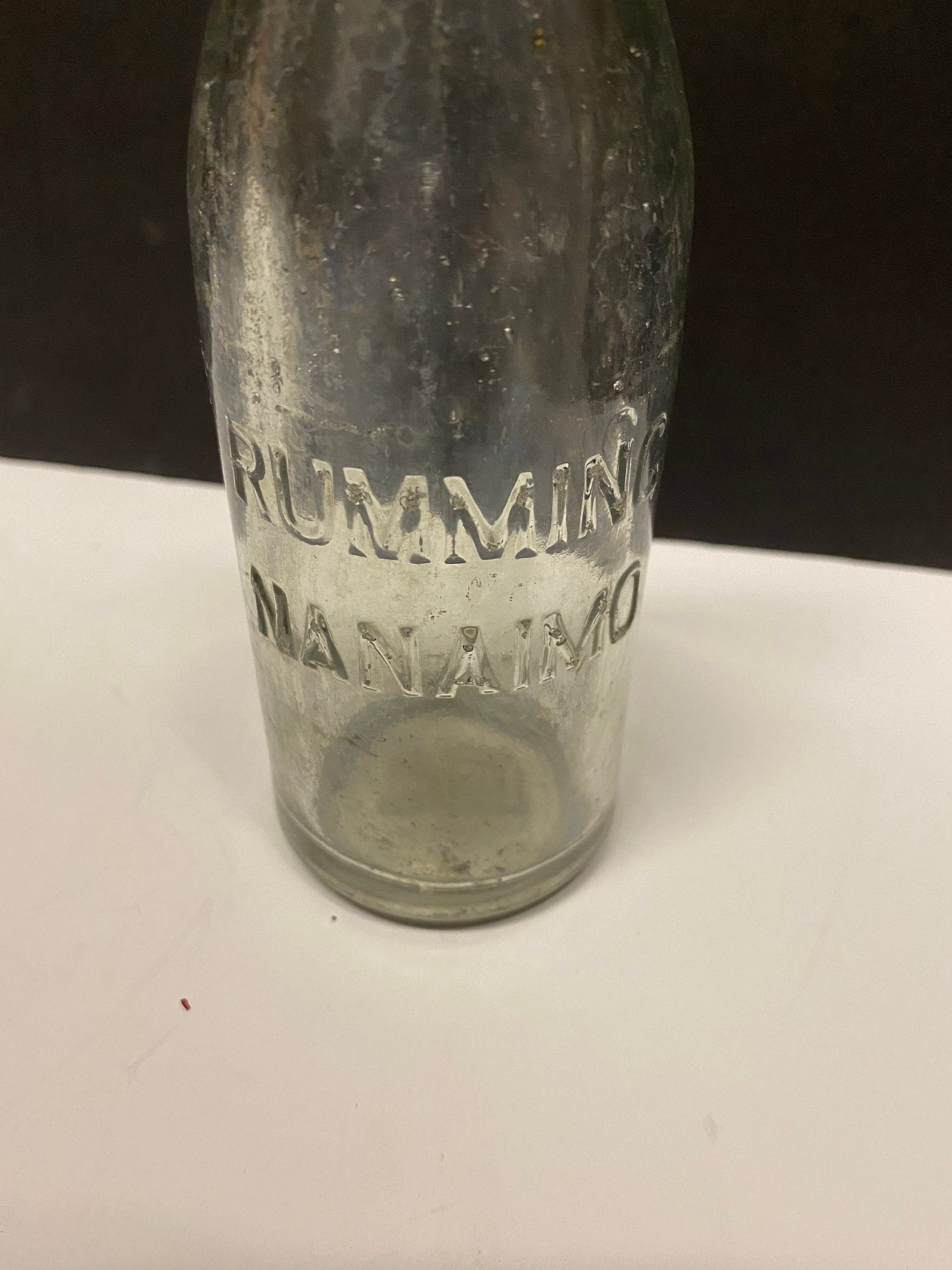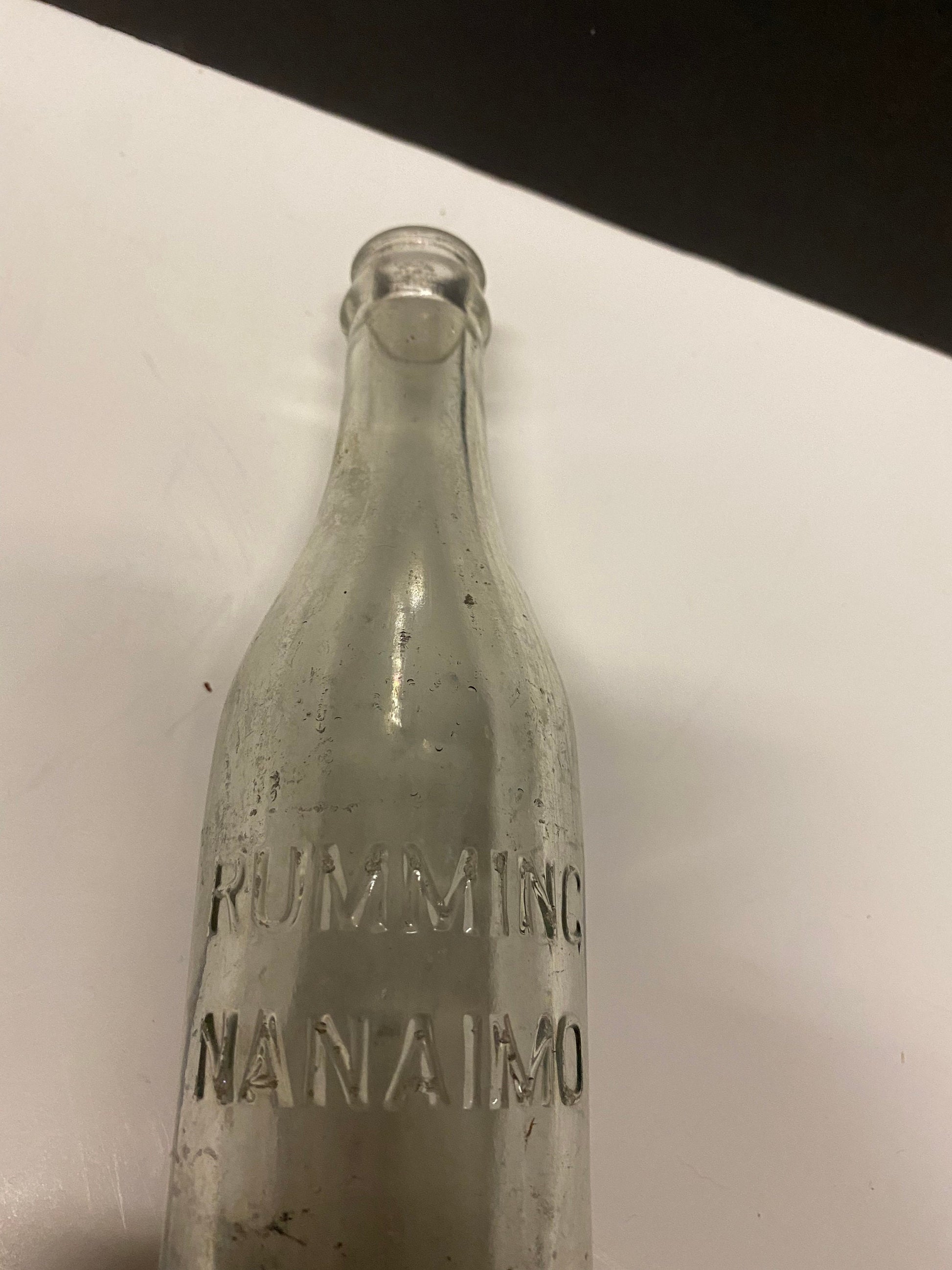 8 inch rumming nanaimo clear bottle Canadian island bottle history Dirty but good condition