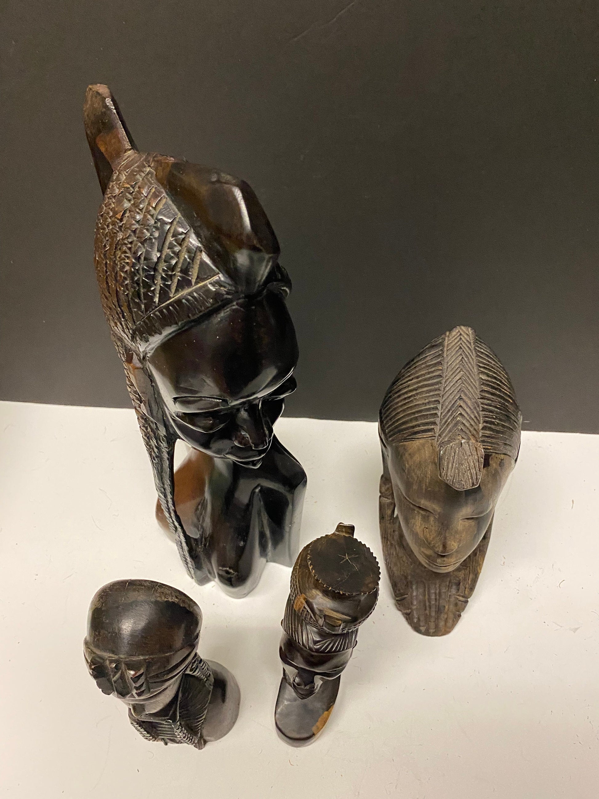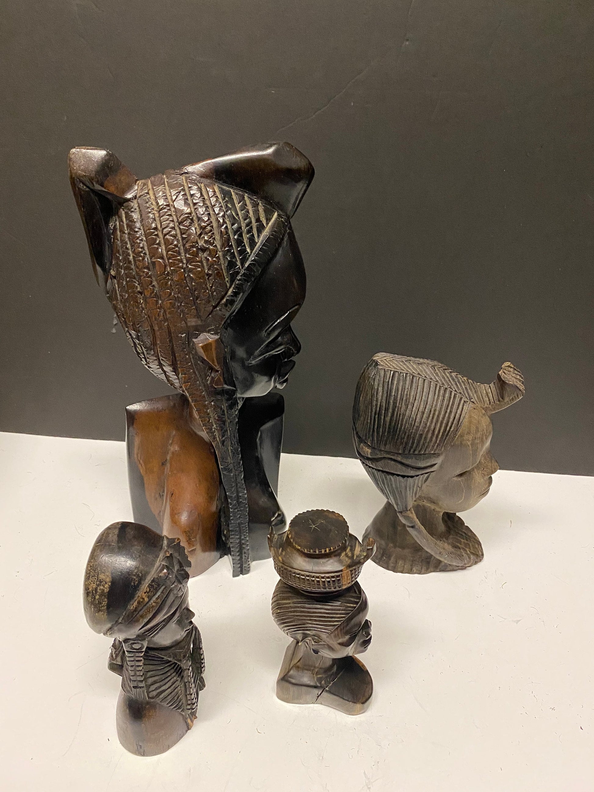 Collection of four wonderful hardwood ebony African female busts 6 to 13 inches 1500g of carved wood wow wow wow