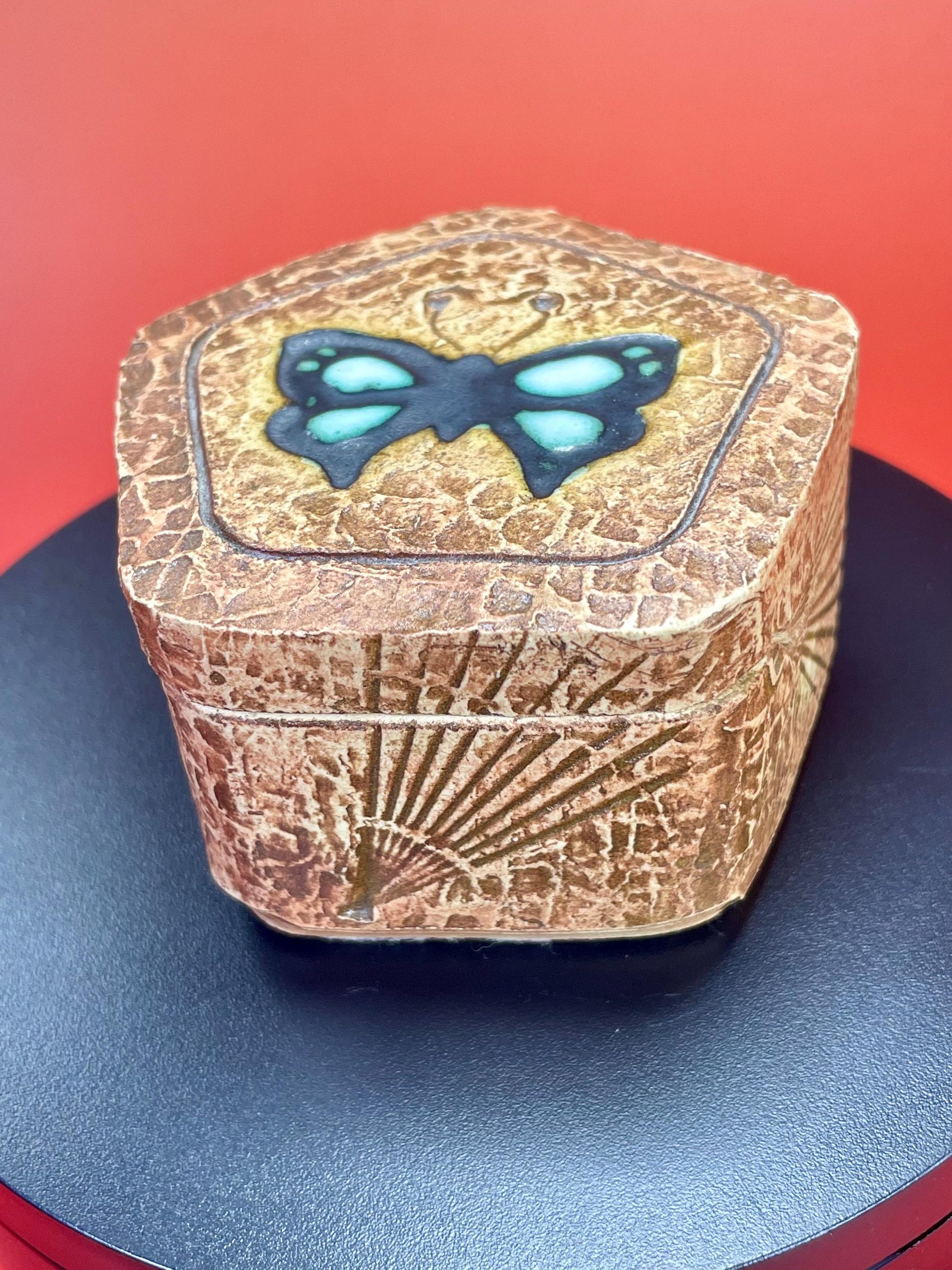 A Fabulous 3 inch wide lidded pottery dish Butterfly design perfect condition
