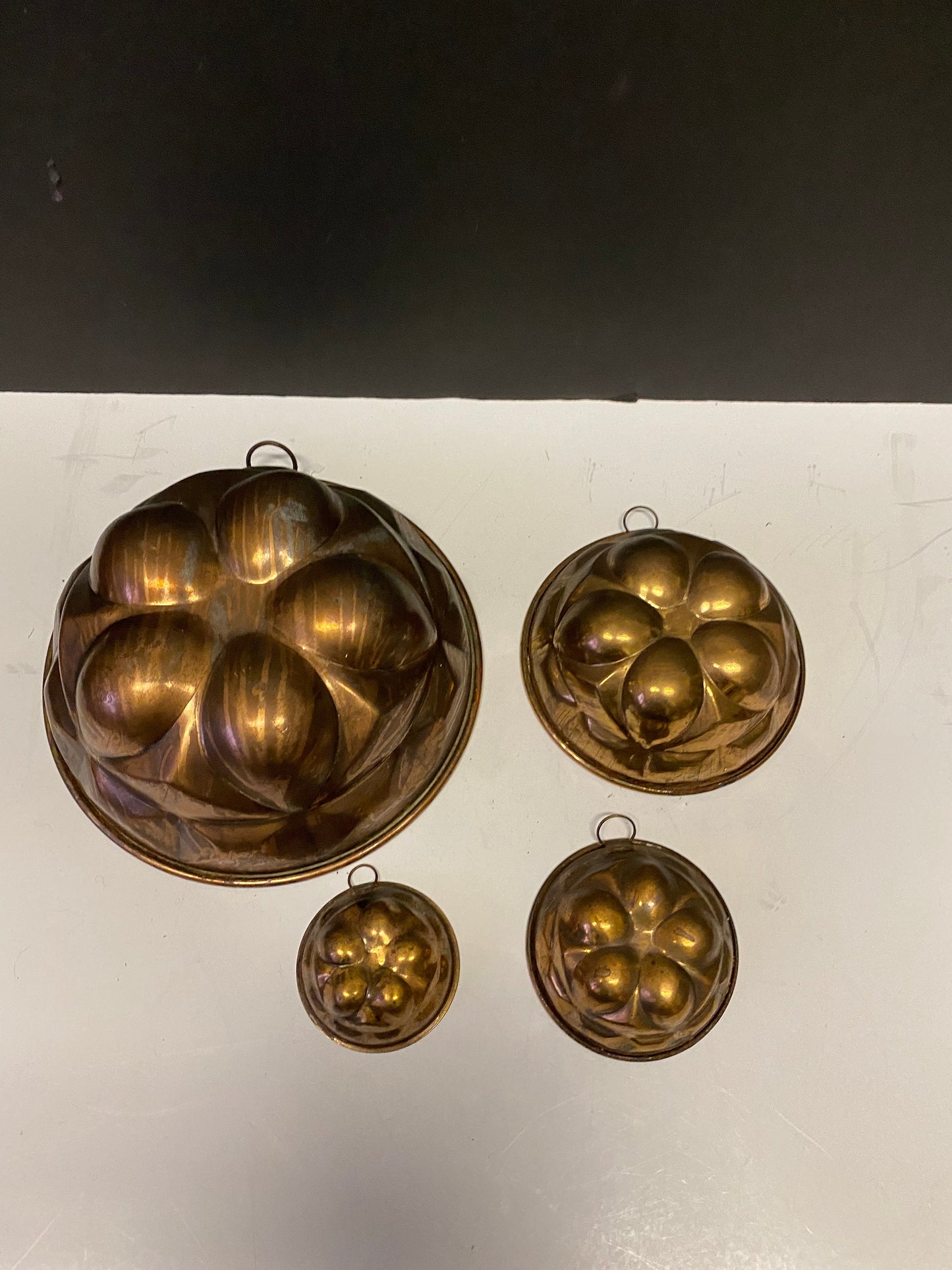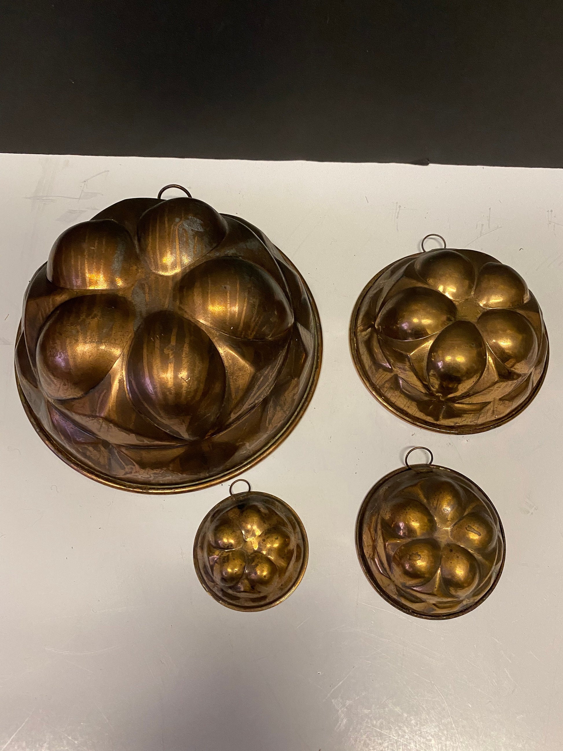 A Fabulous Antique set copper hanging jelly moulds - Great patina and condition
