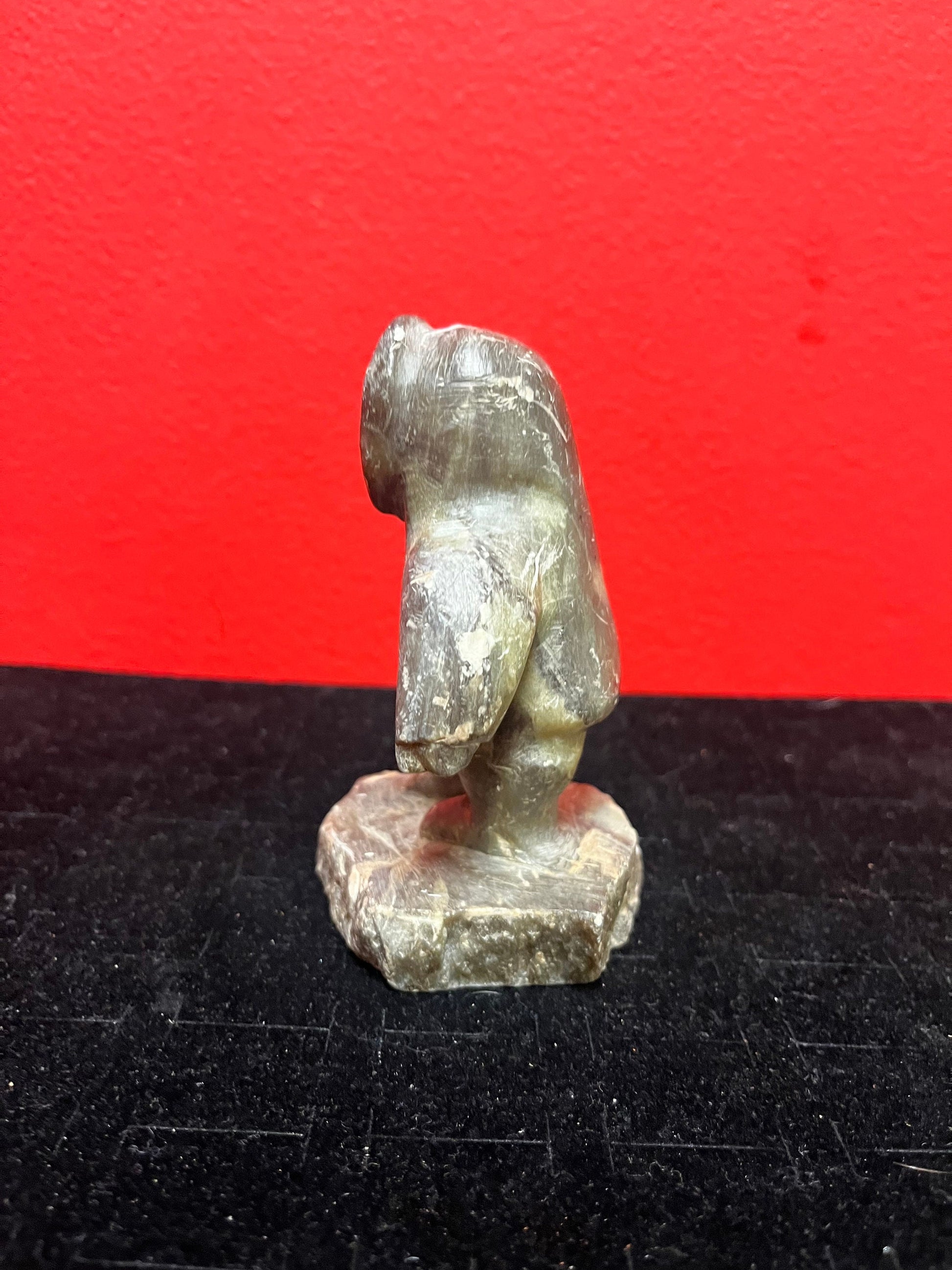 A lovely, 4.5 inch tall, antique indigenous Inuit soapstone statue of a hunter some minor scratches - signed beauty