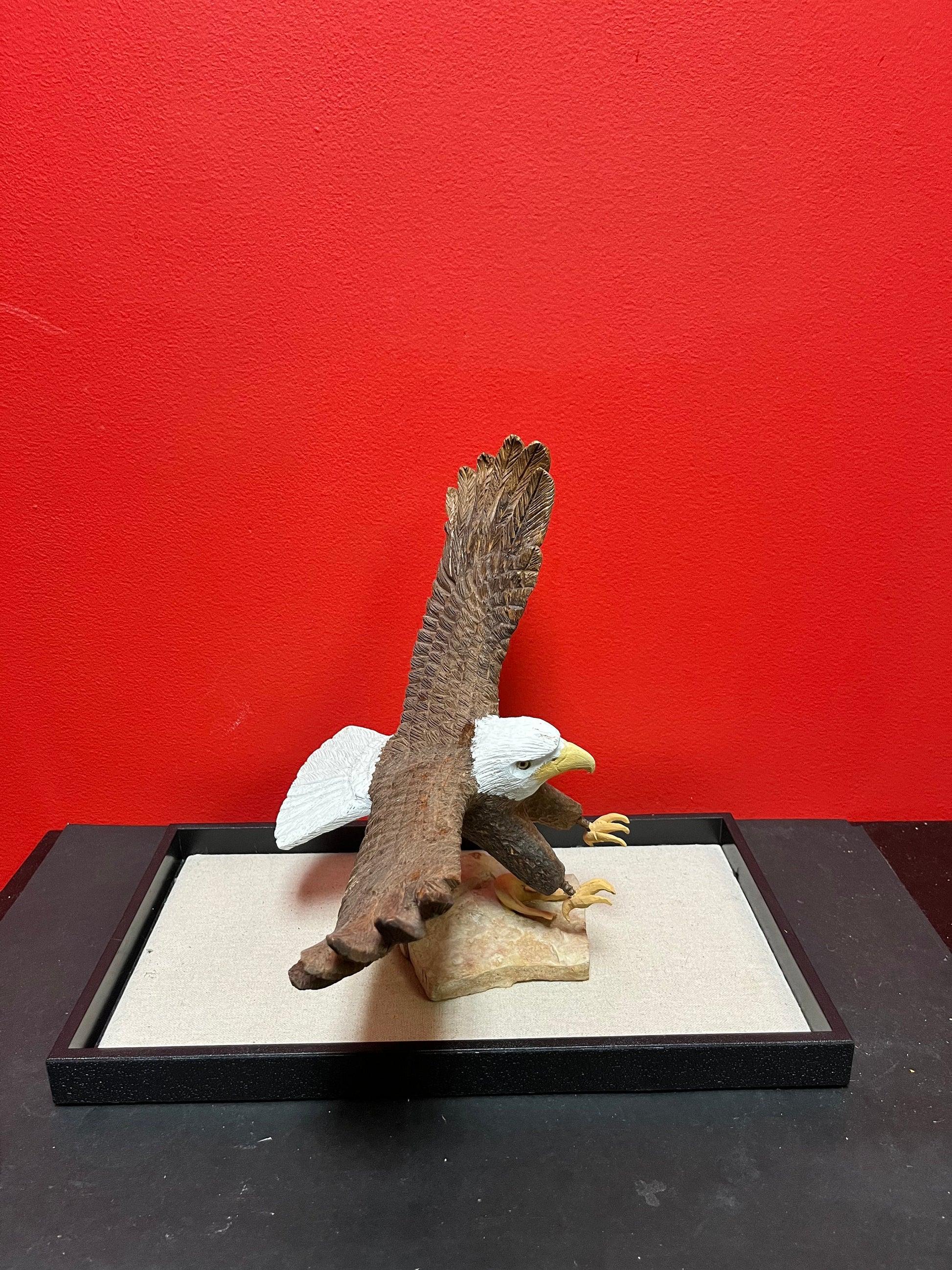 A Lovely hand carved 11 x 11“ eagle on rock stand with salmon prey