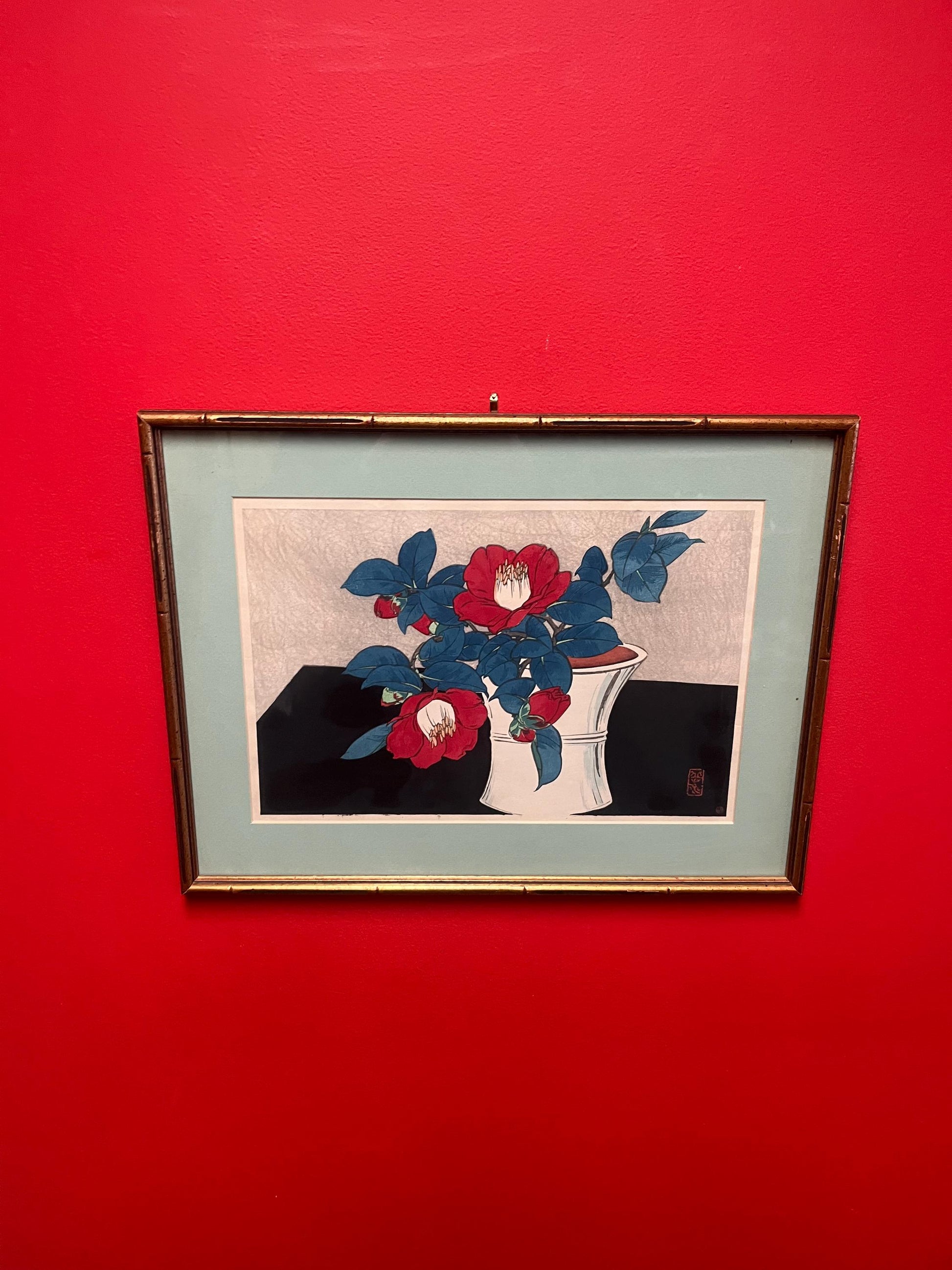 Hirokei Shotei signed antique Japanese wood block print of flowers — 19 x 15” — wonderfully framed — great value — well-known artist