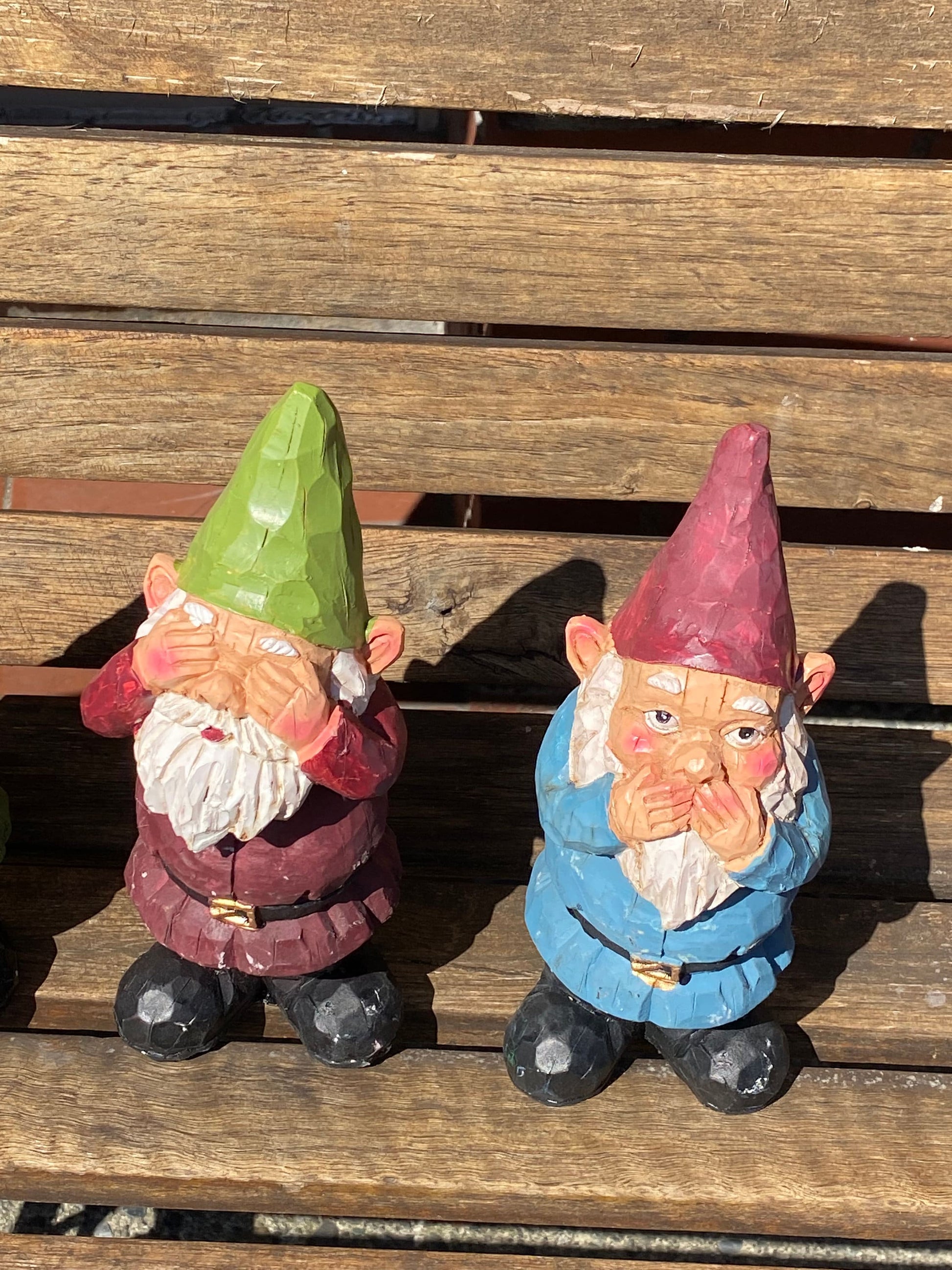 Adorable set of 3 8 inch gnomes Concrete with porcelain bobble heads see no hear no speak no evil Amazing garden gift
