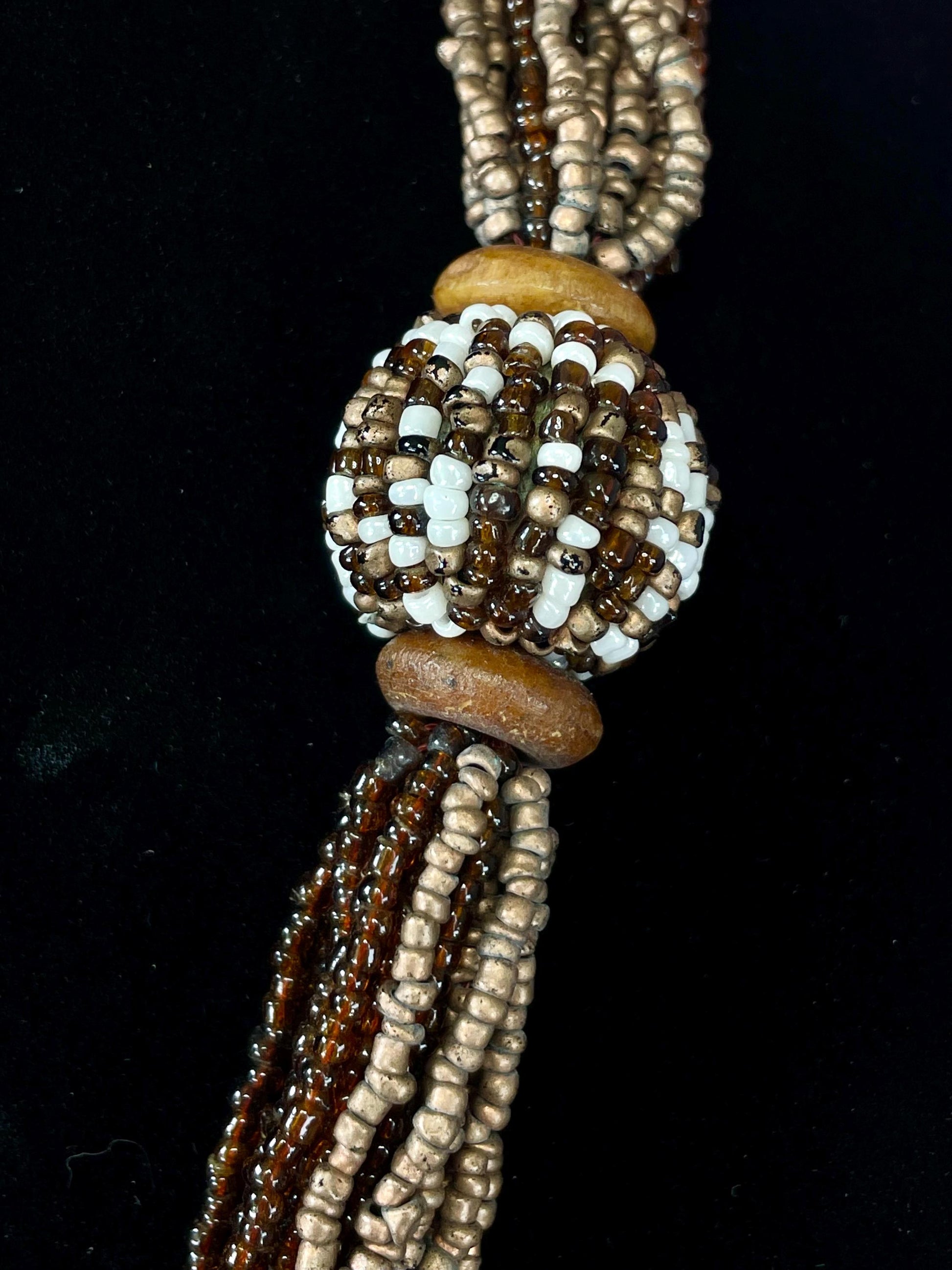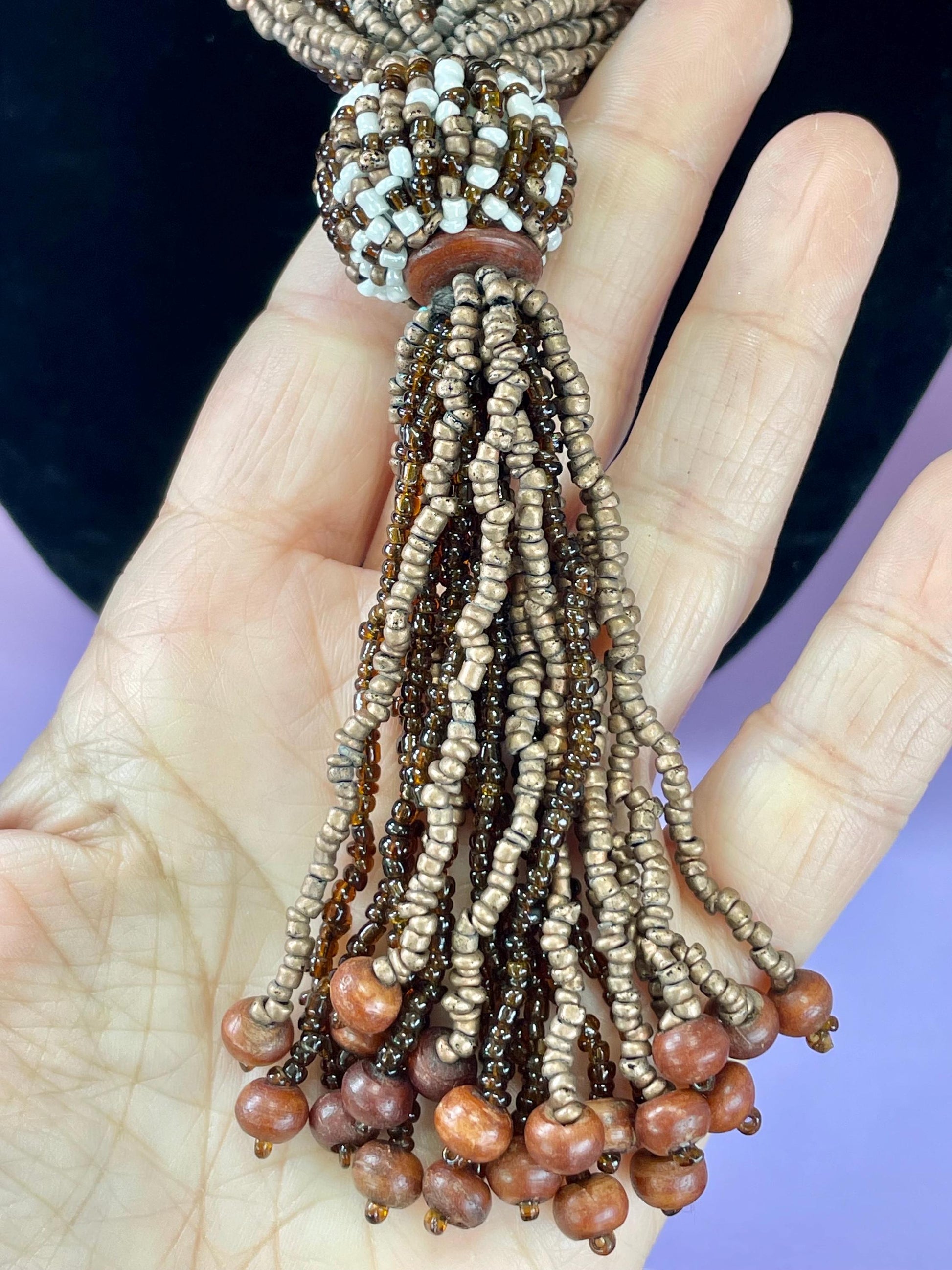 This 22 African beaded necklace features rich, earthy tones, finished with a striking 4.5 tasseled drop. A bold and elegant accessory that adds cultural flair to any outfit.