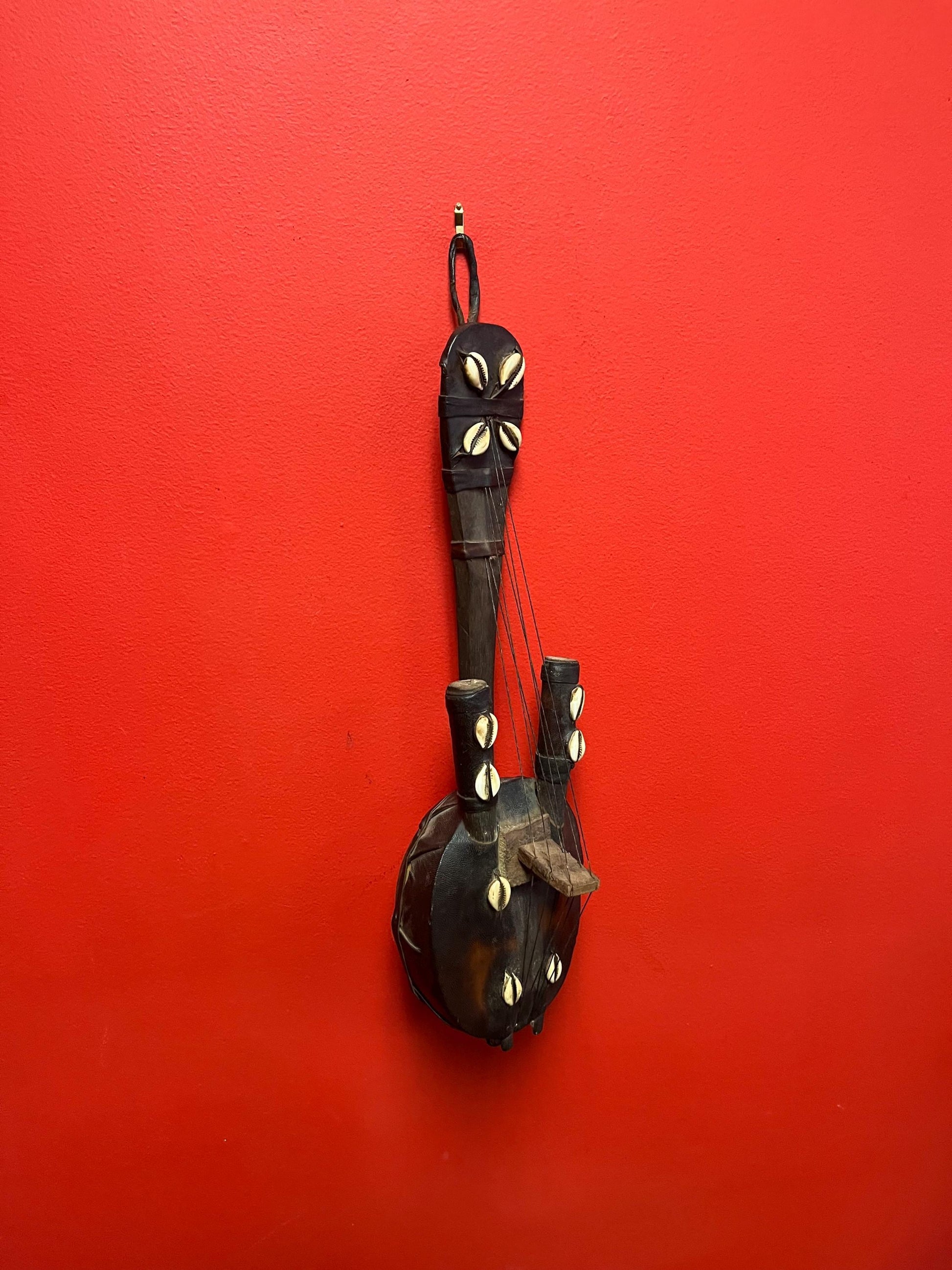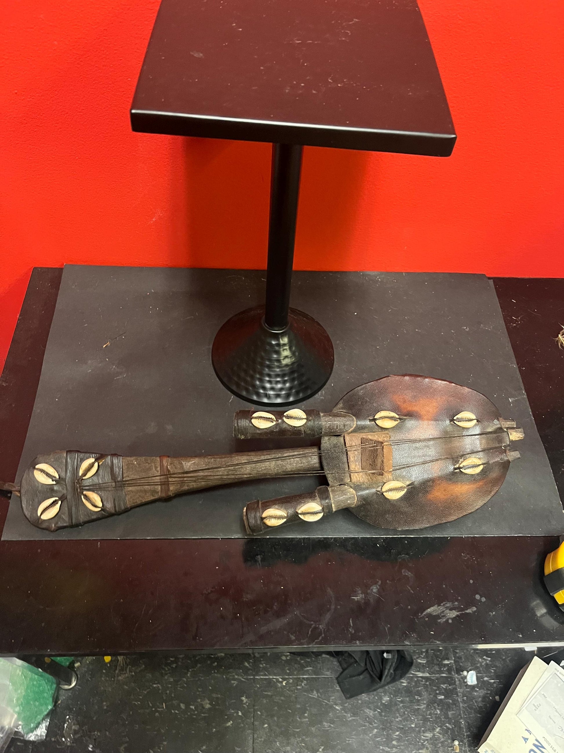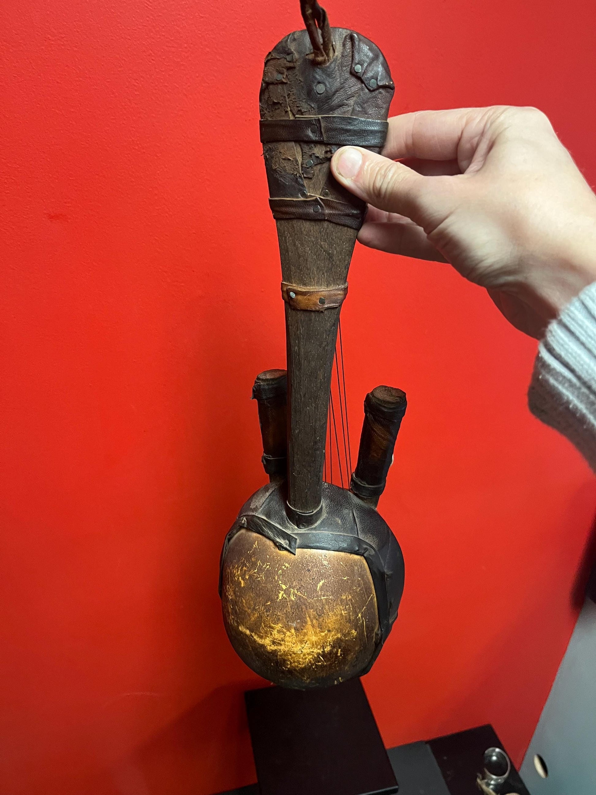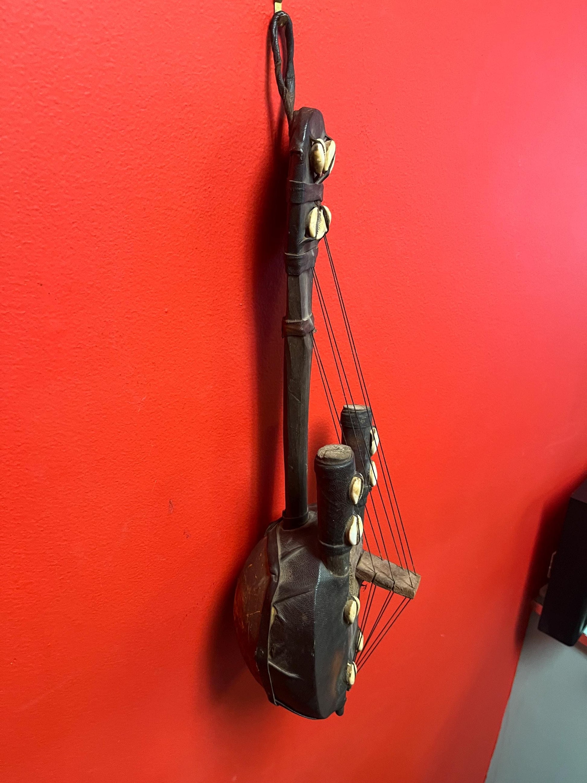 Amazing 19 x 5“ wide old oceanic coconut shell leather and shell guitar style instrument wow