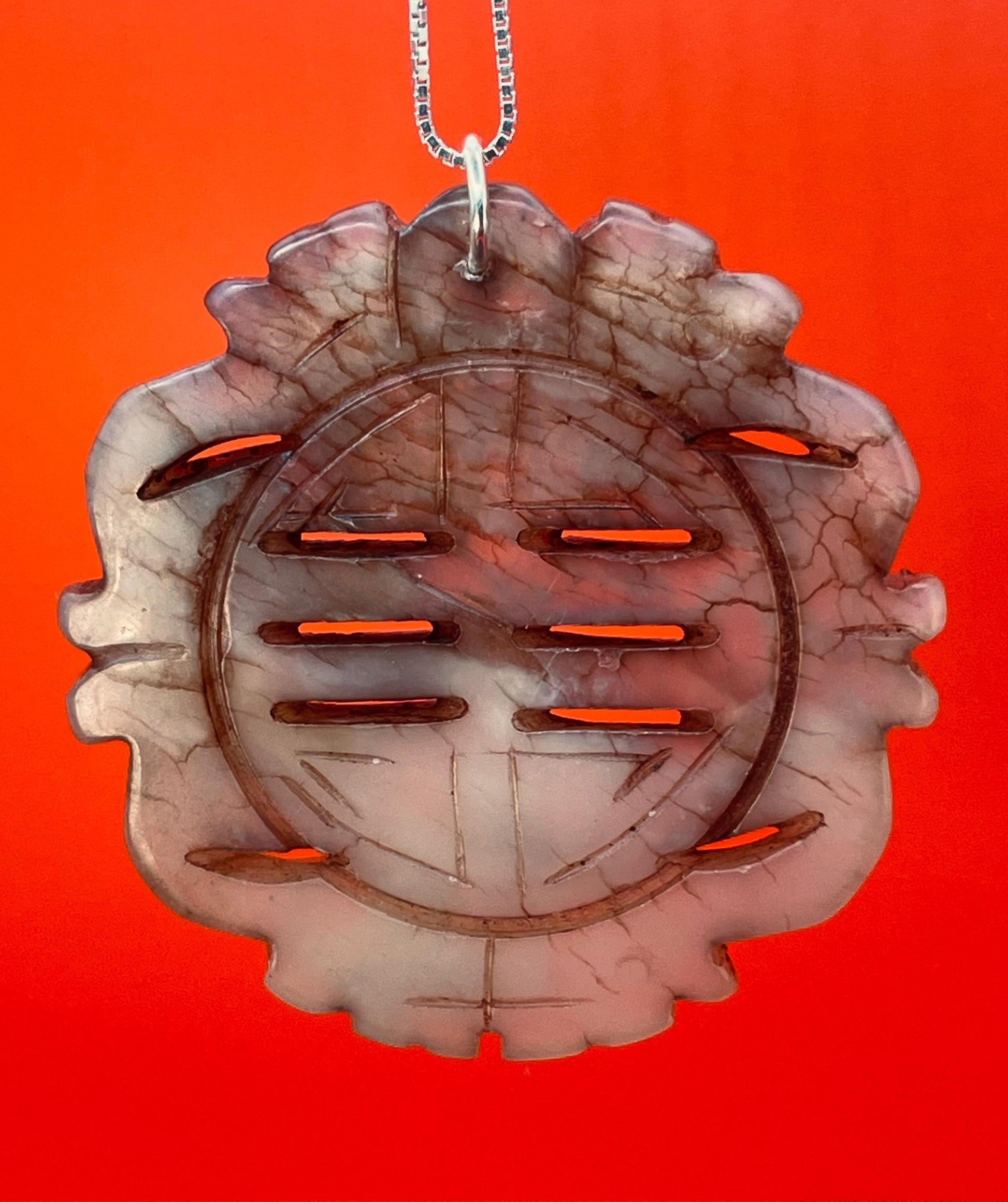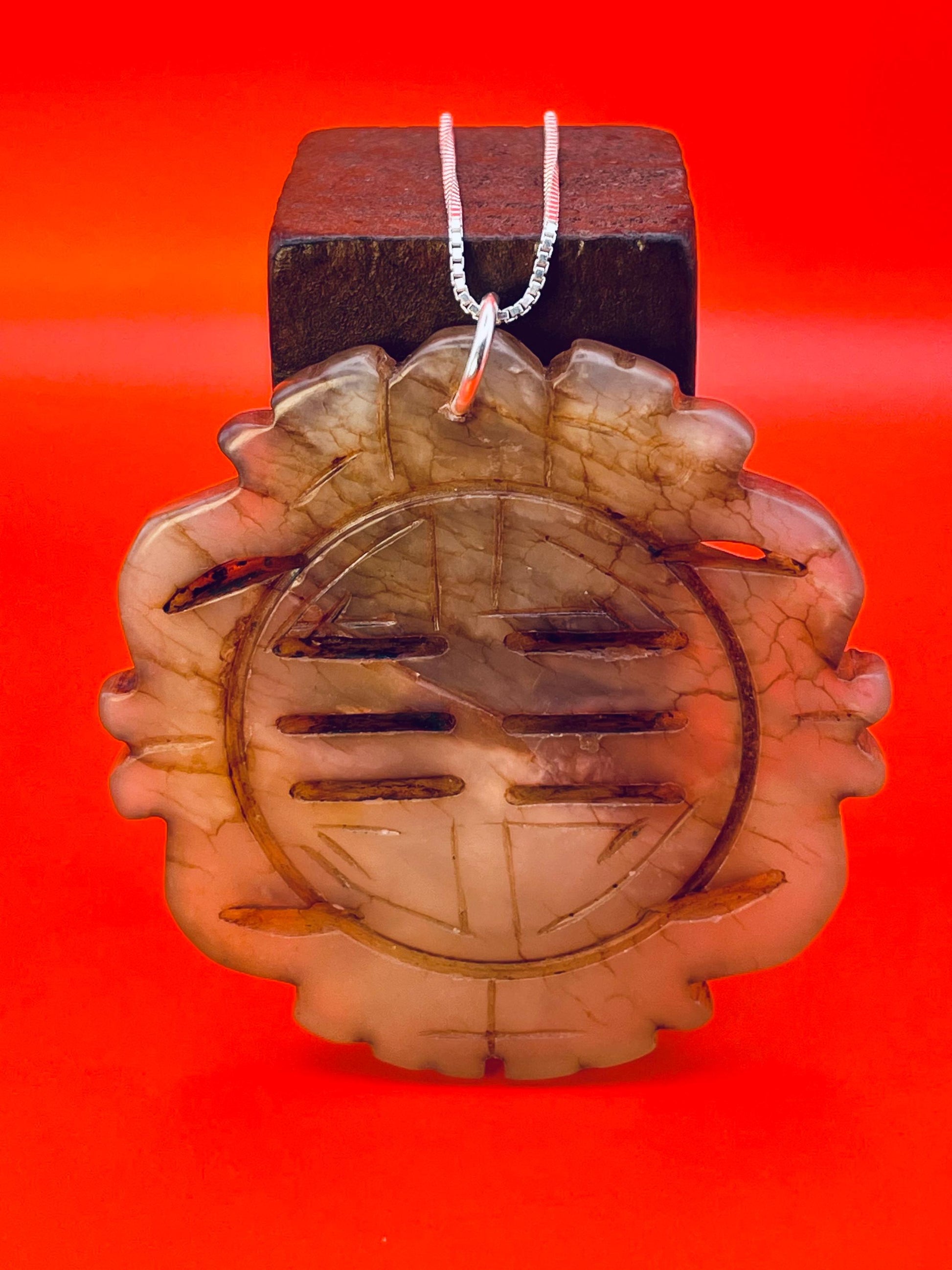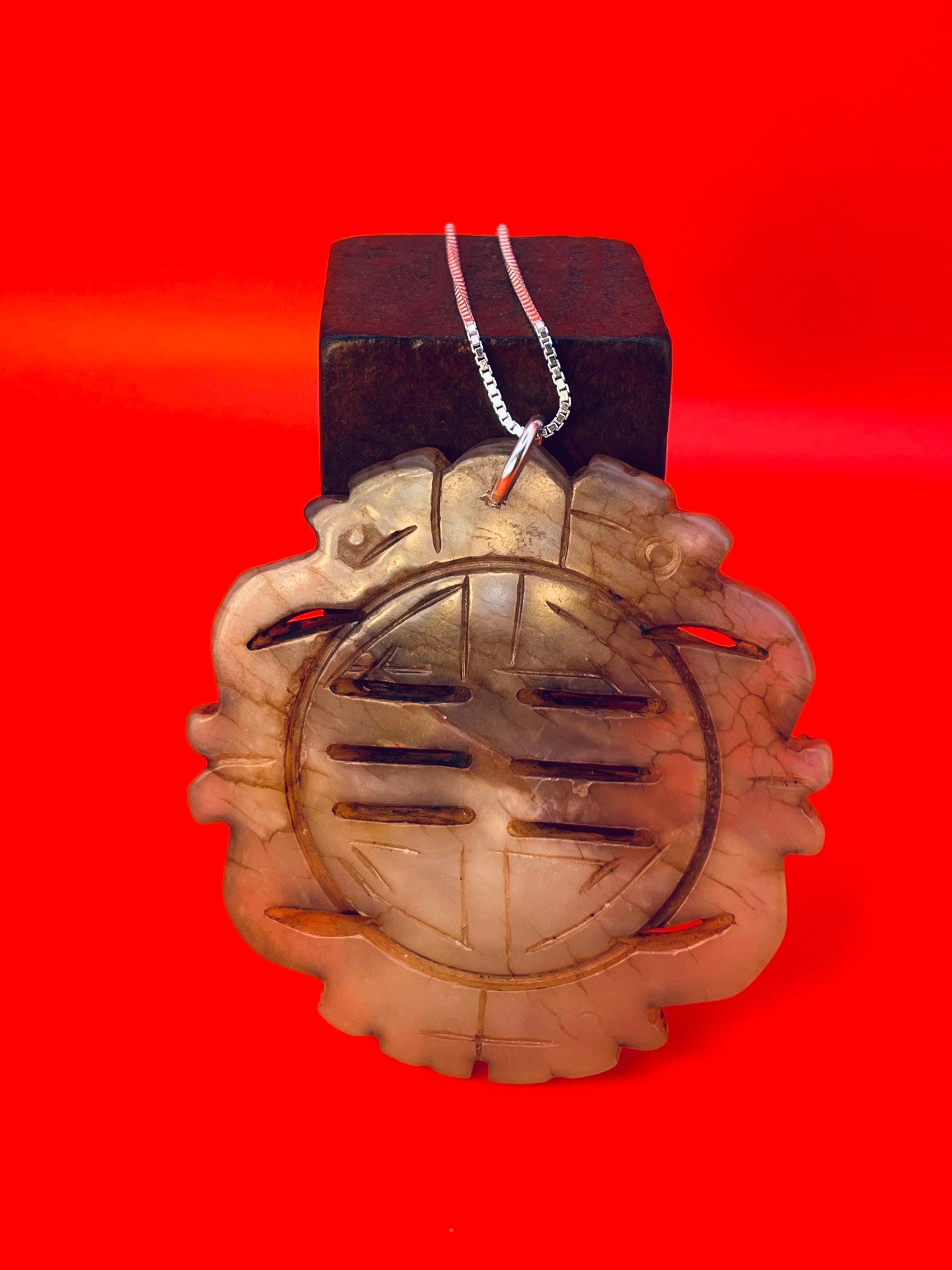 This stunning necklace features a 2.25-inch carved jade pendant, weighing 31 grams.