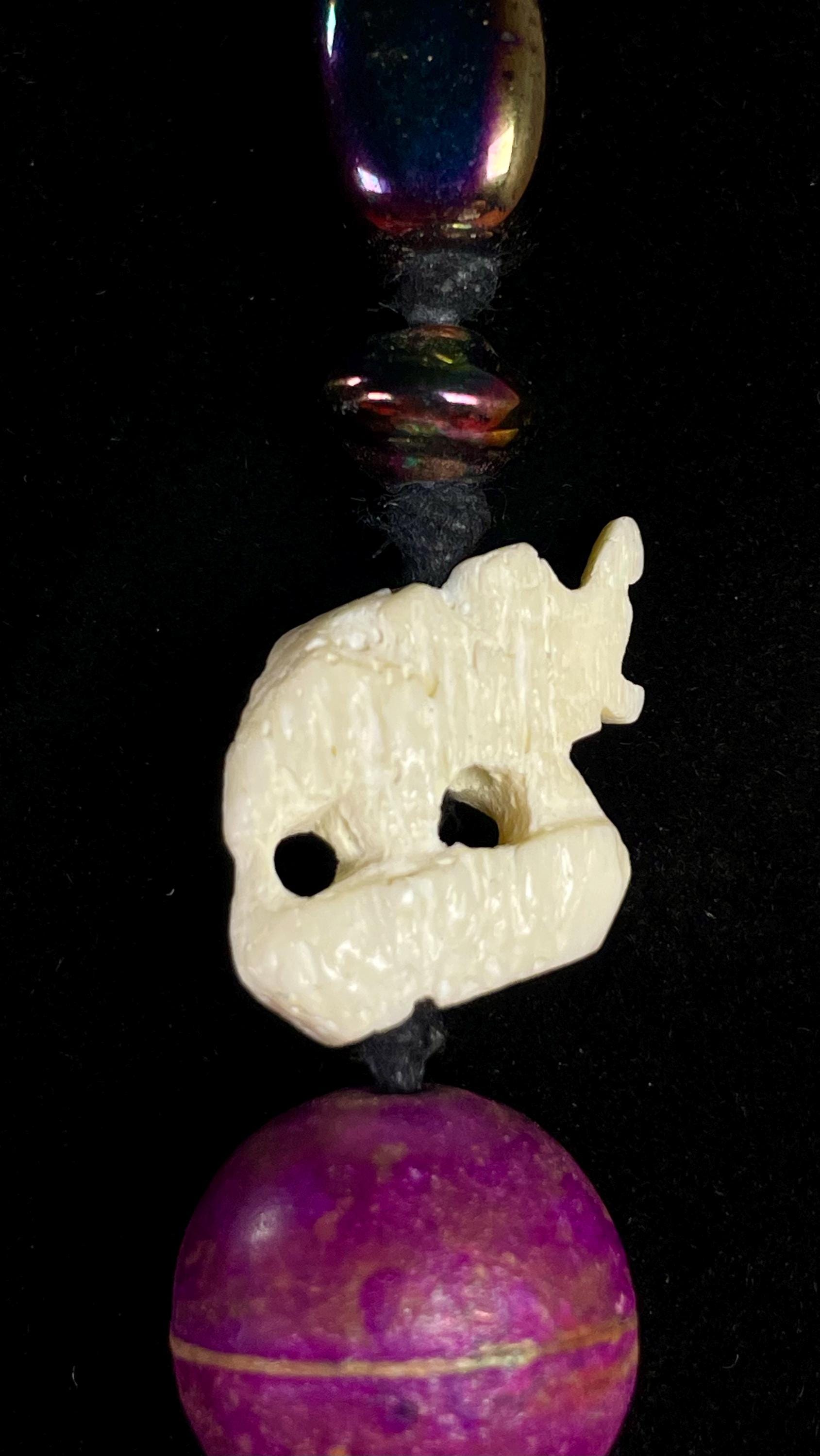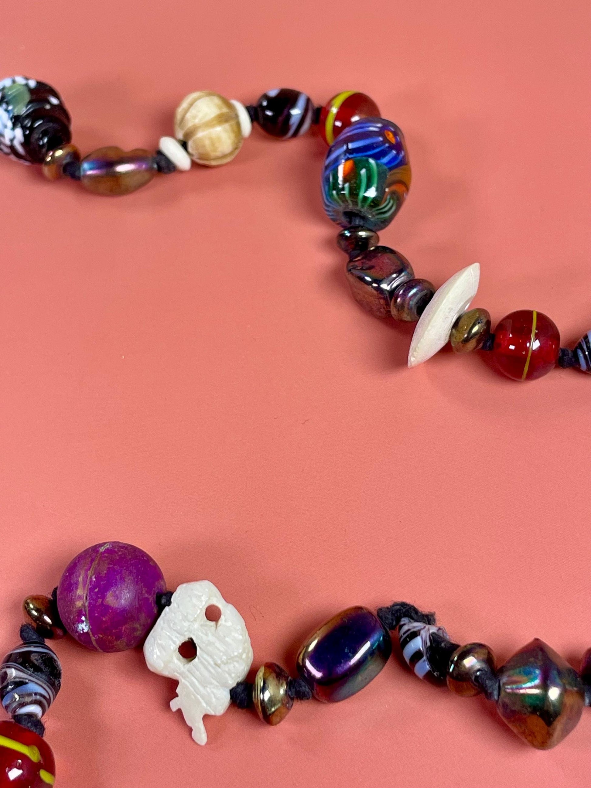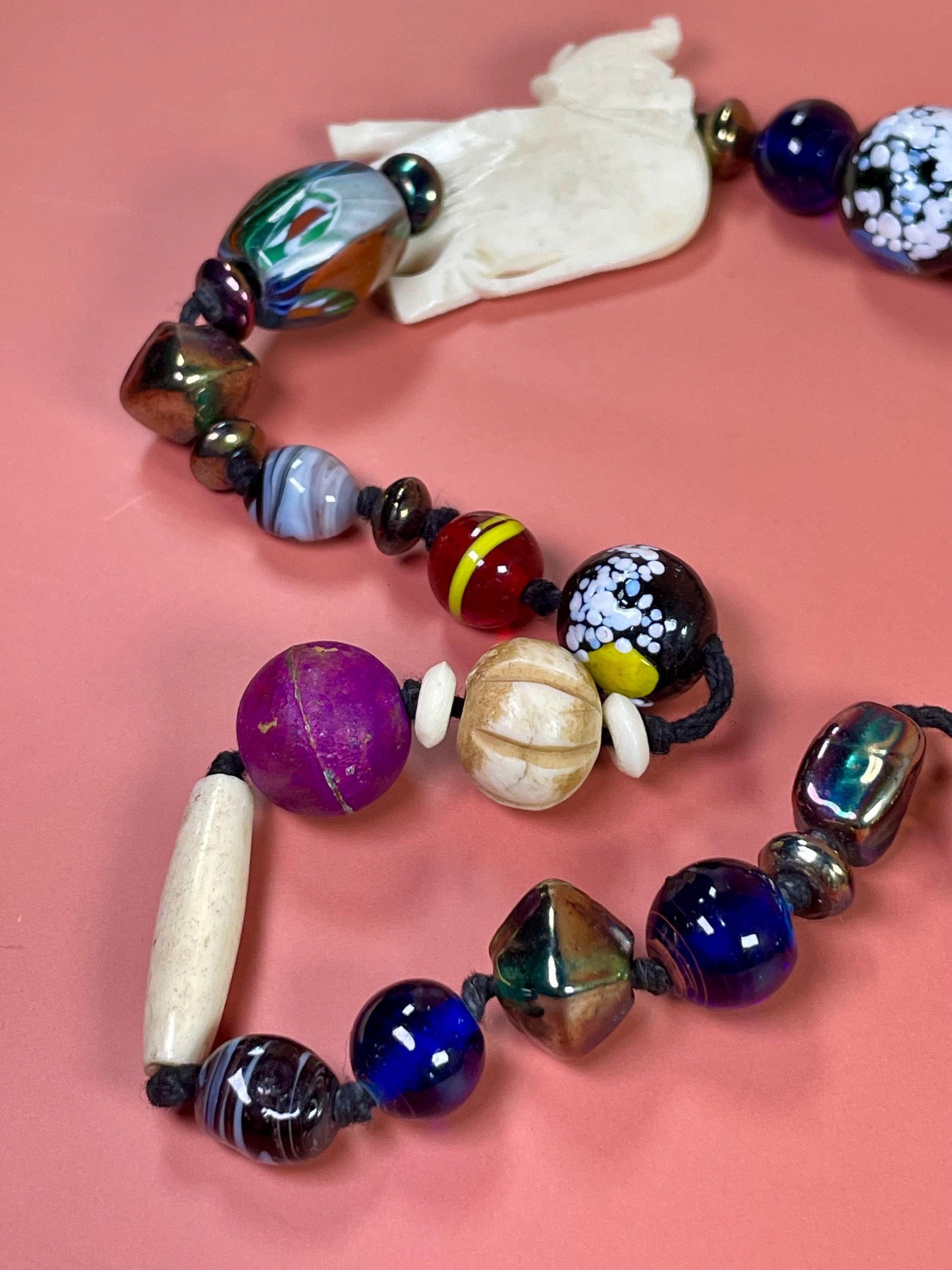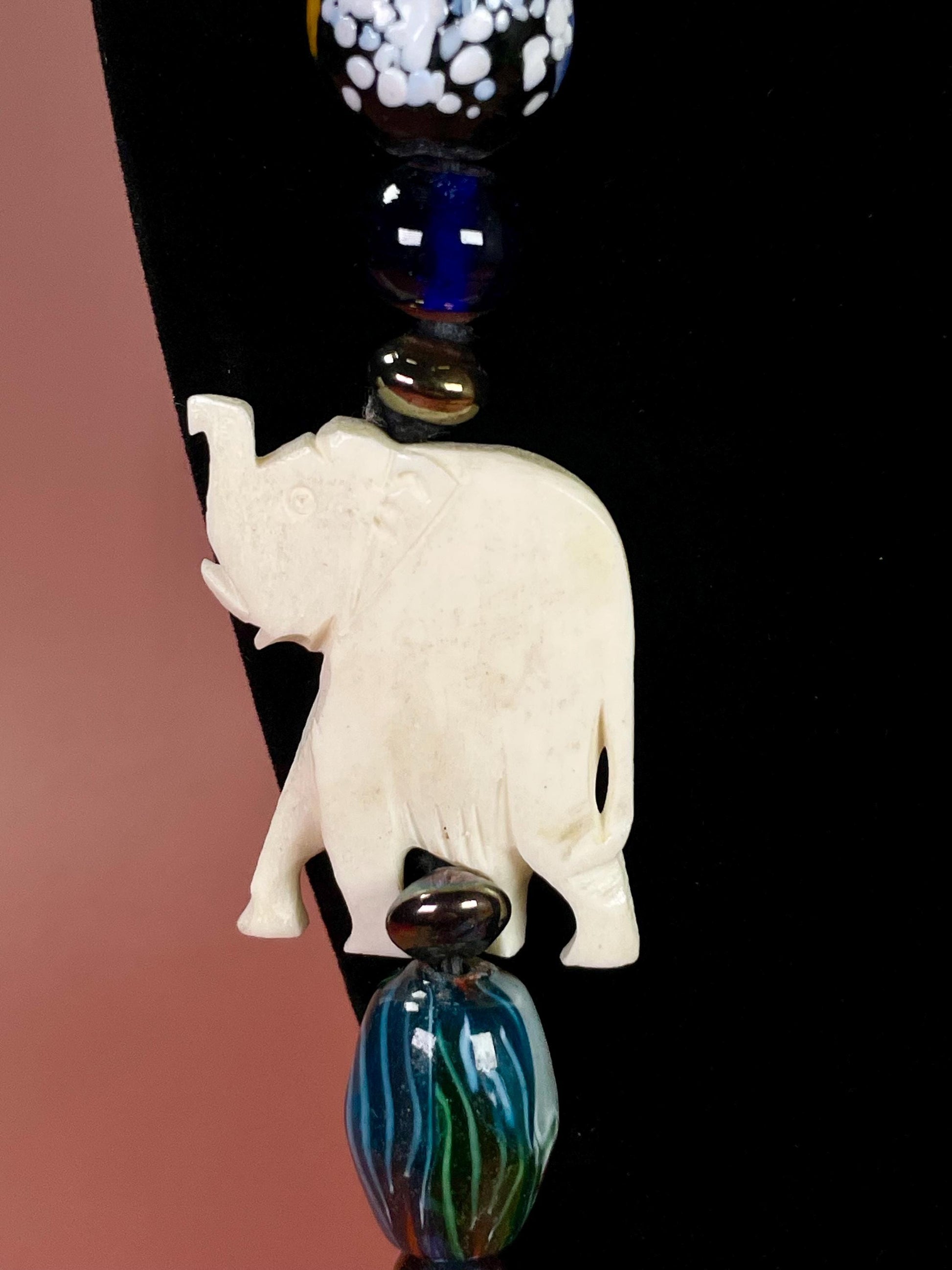 Crazy cool necklace with a variety of bead materials. Bone, blown glass, metal, resin? Great variety of shapes and colours not to mention the two adorable Elephant accents.