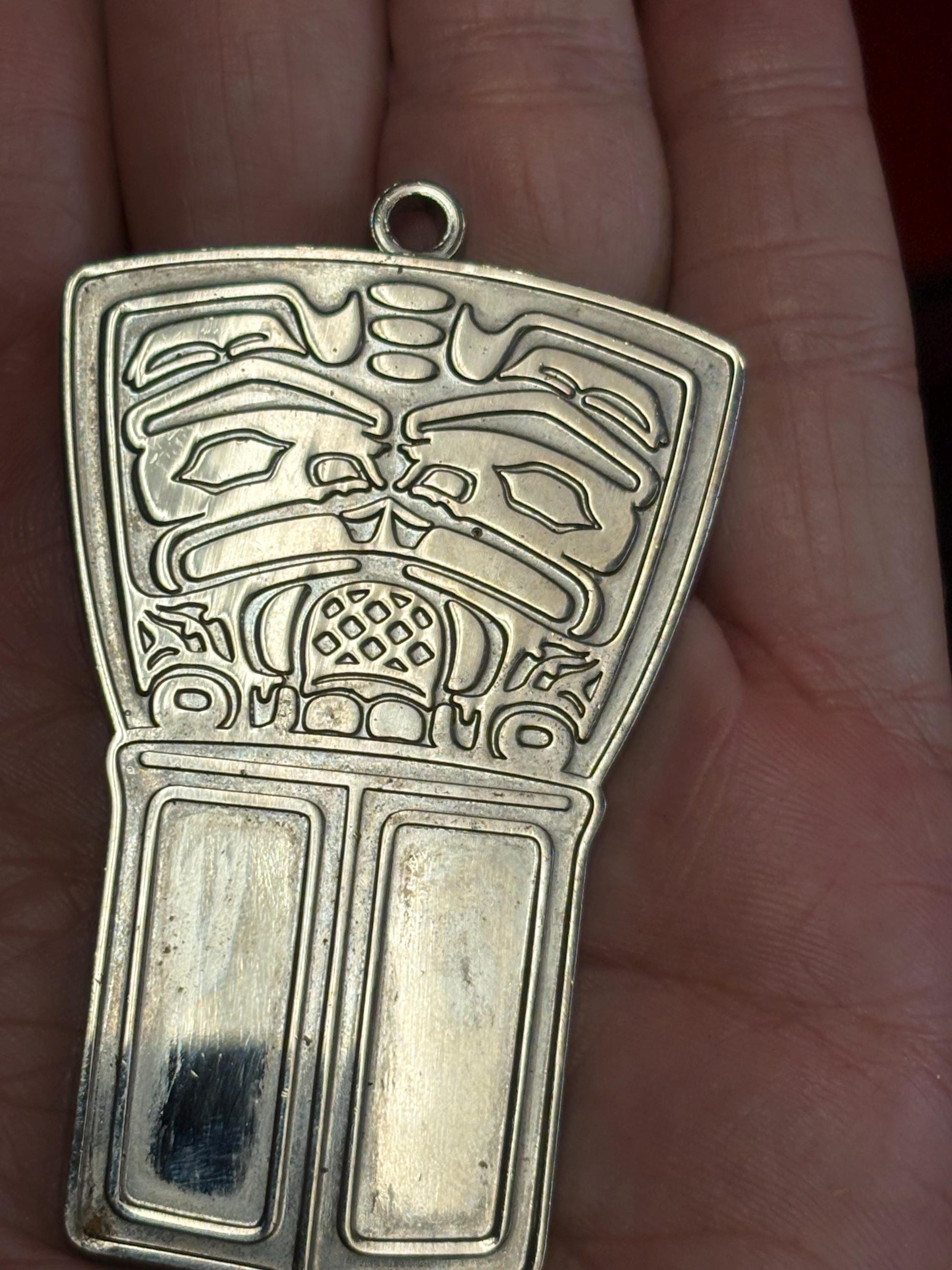 Amazing heavy unsigned, silver indigenous first nation Pacific Northwest coast “copper” pendant — great detail— 3 inches tall
