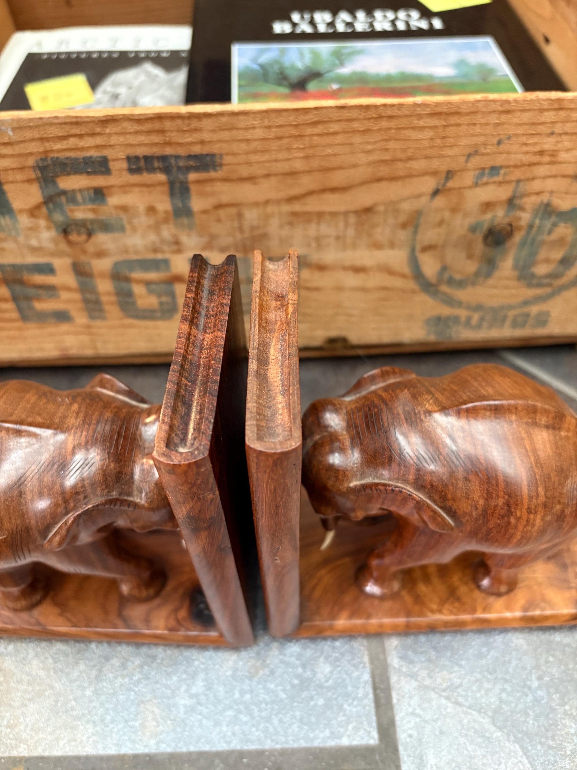 Amazing pair of Asian wood elephant bookends - each 6 x 7 inches high wonderful look and condition