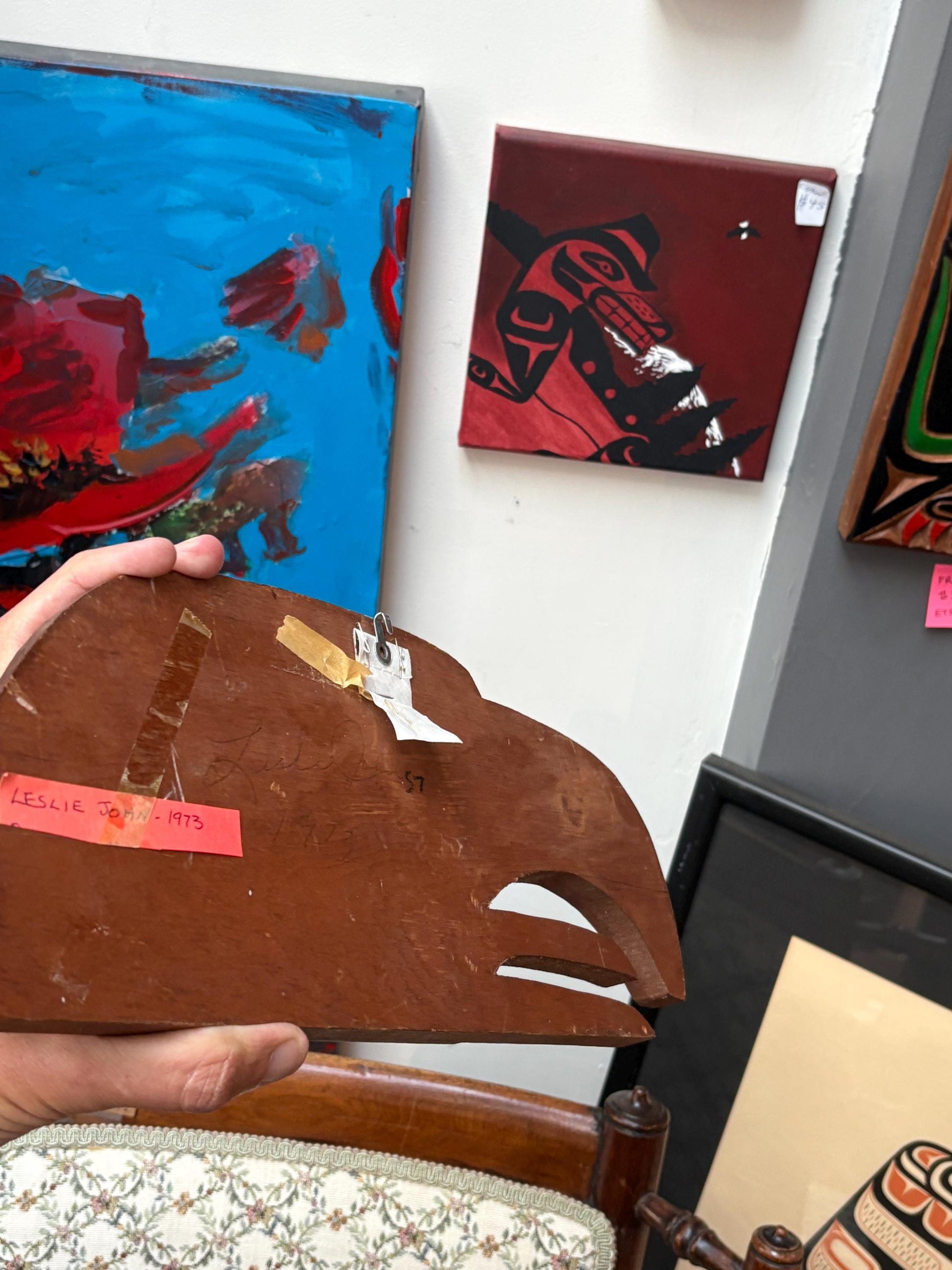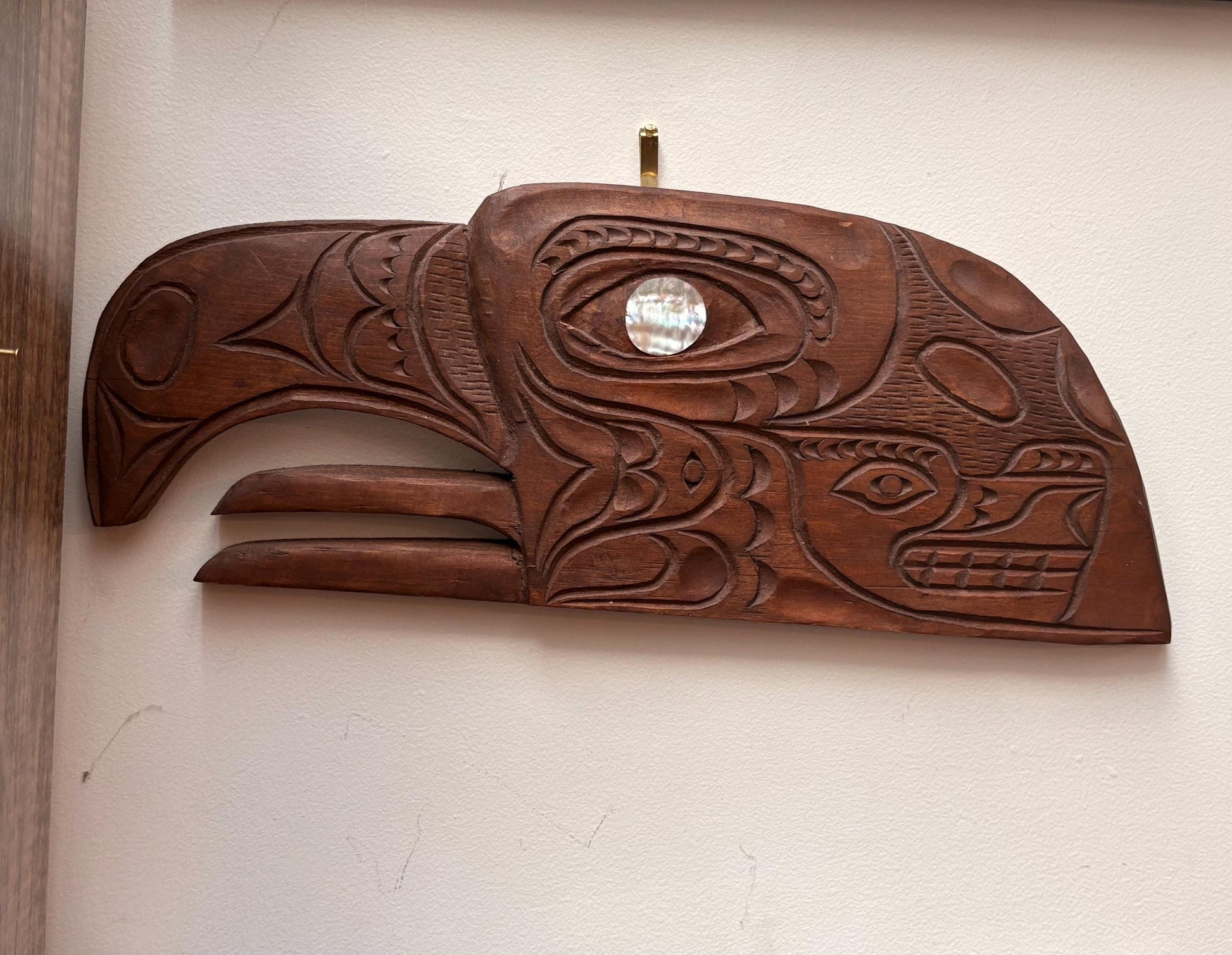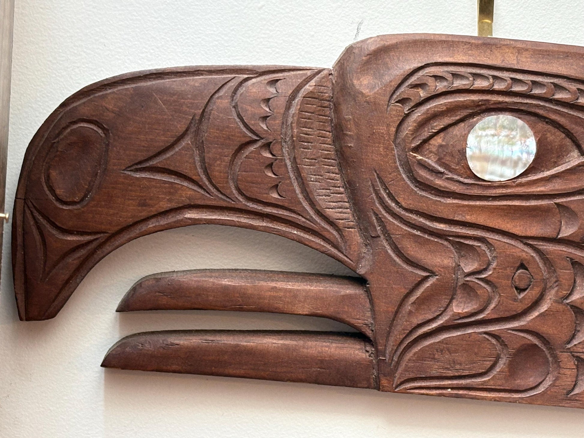 Amazing signed indigenous first Nations, Pacific Northwest Coast Raven plaque with abalone eye great detail - 16 x 6 high RS