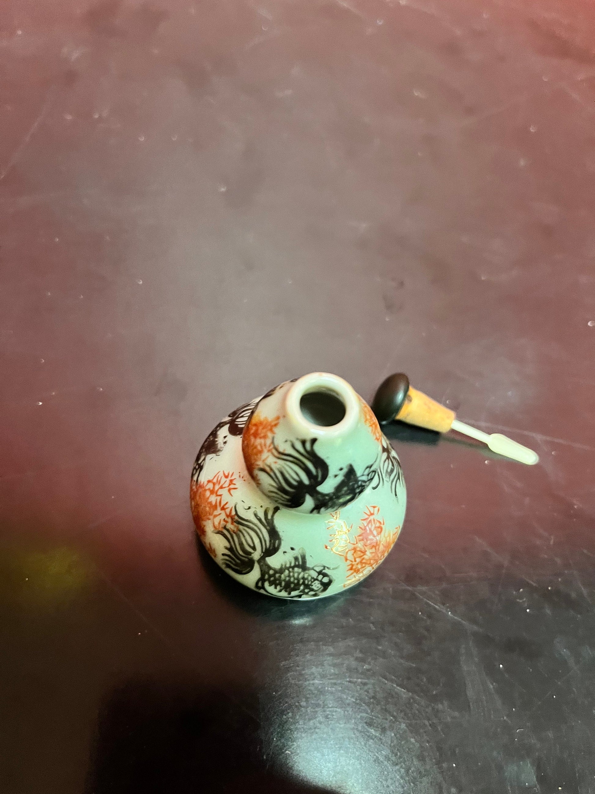 Antique Chinese 3 inch high double barrelled porcelain snuff bottle with koi fish and flowers - great value