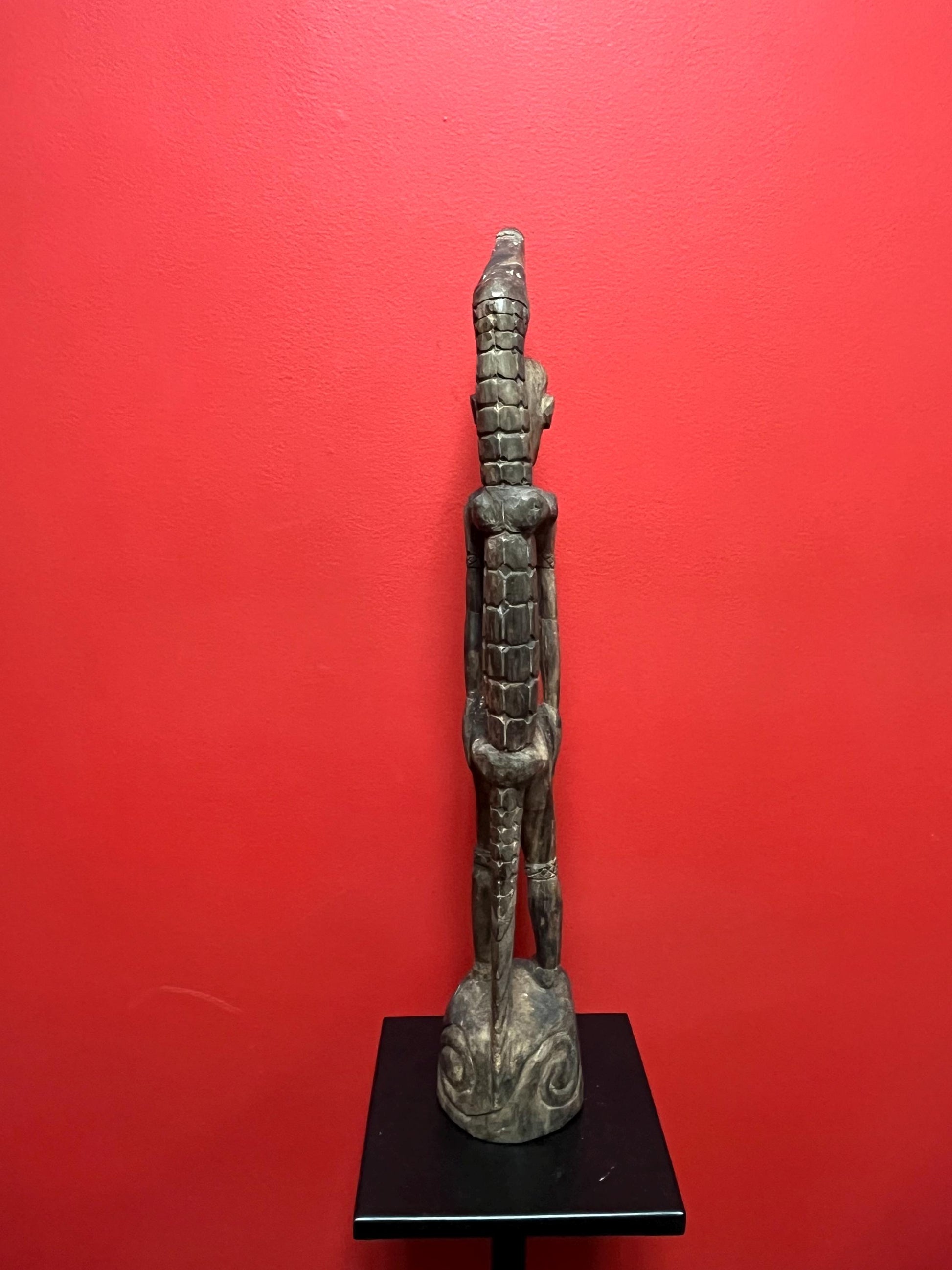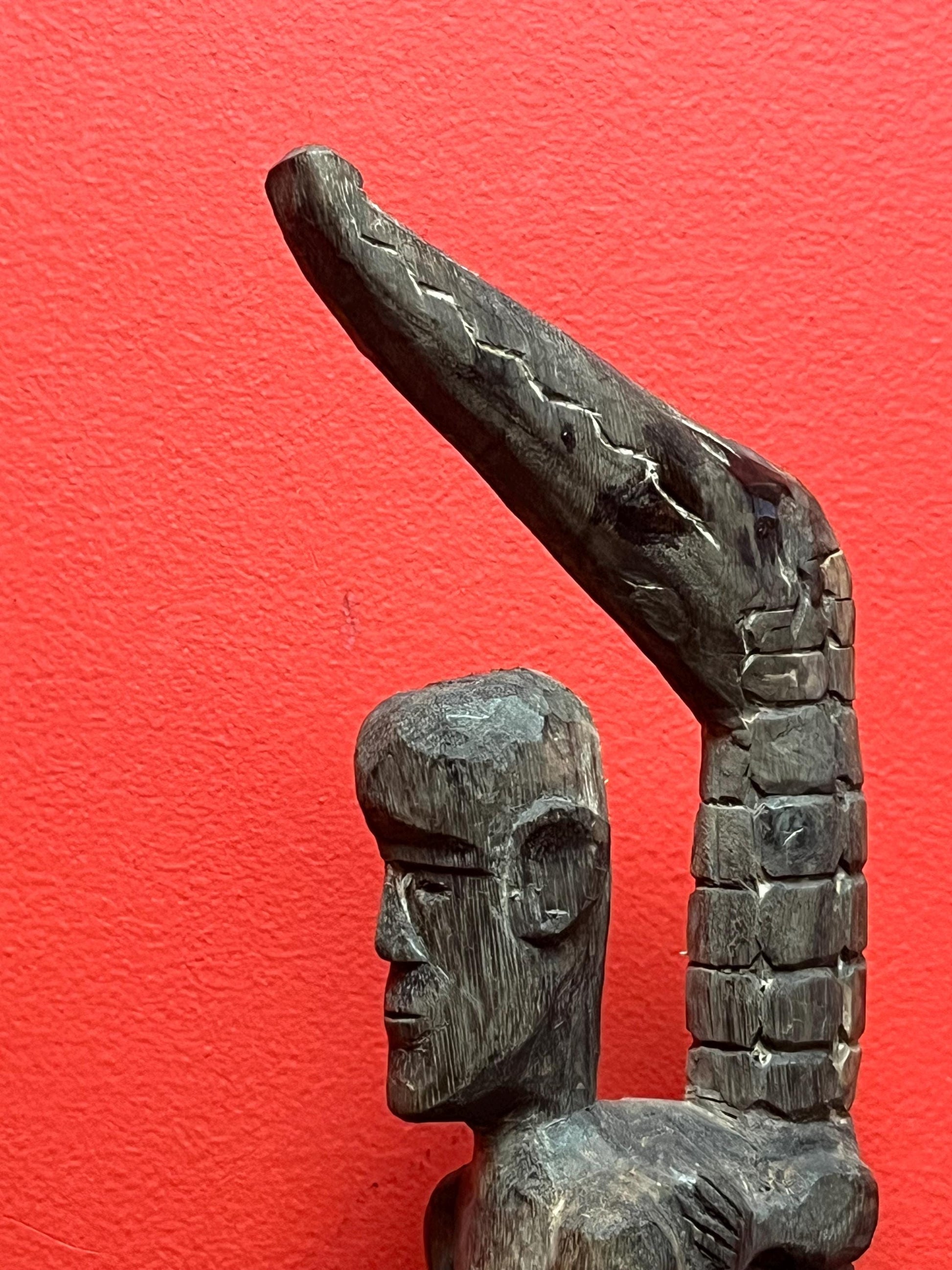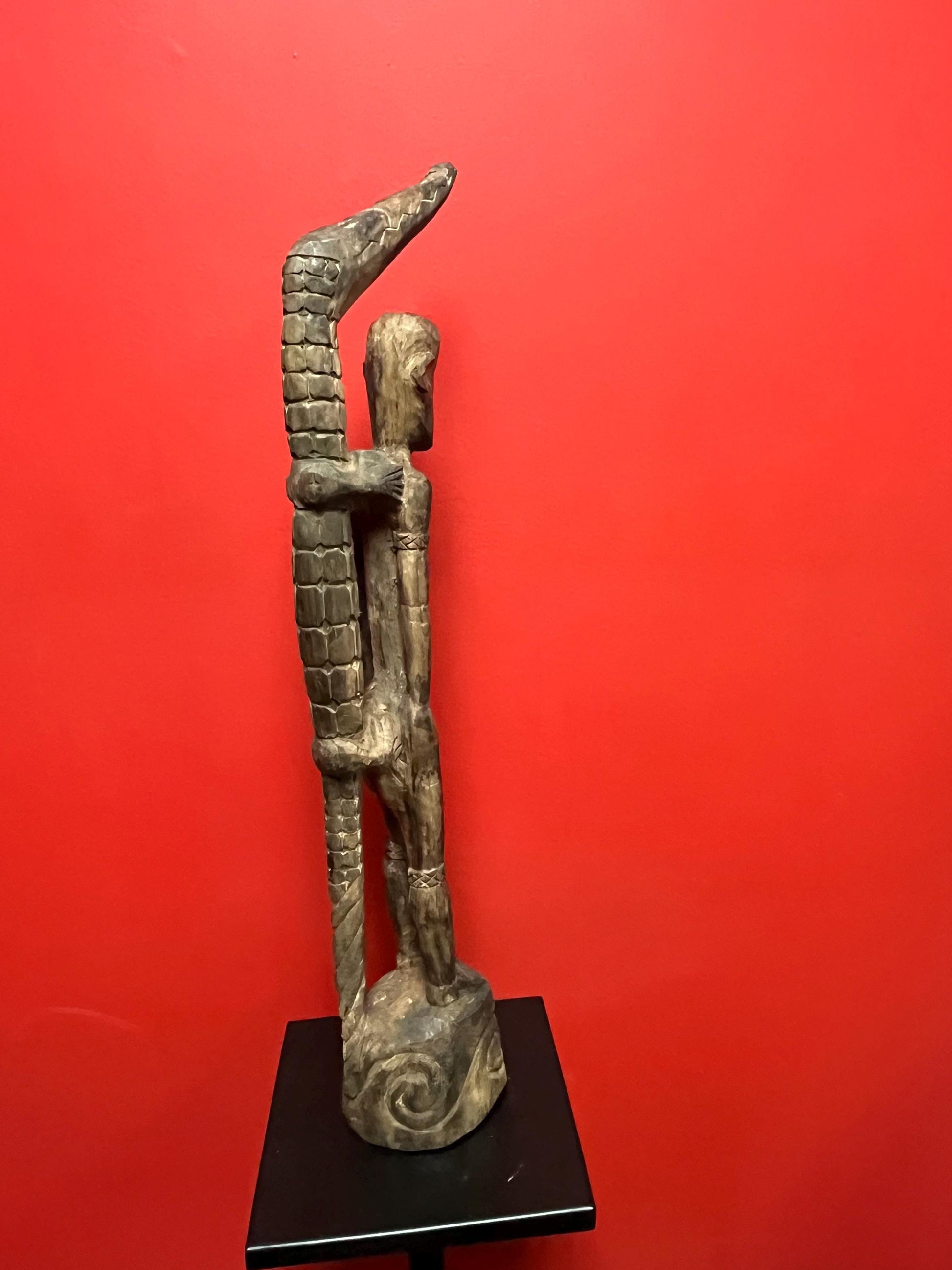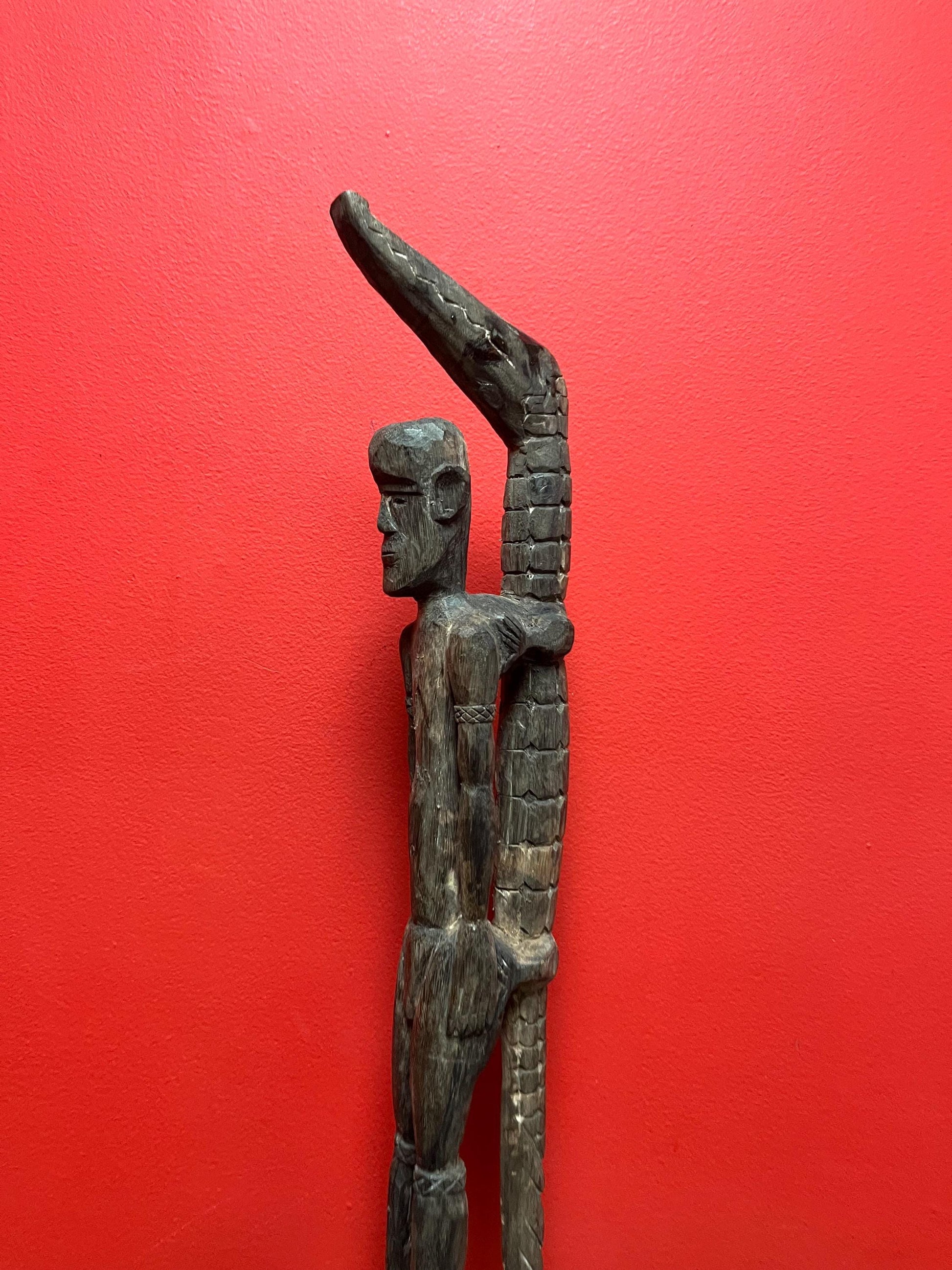 Antique 22 inch long African statue of a man with a crocodile primitive beauty with great detail and fabulous patina good value