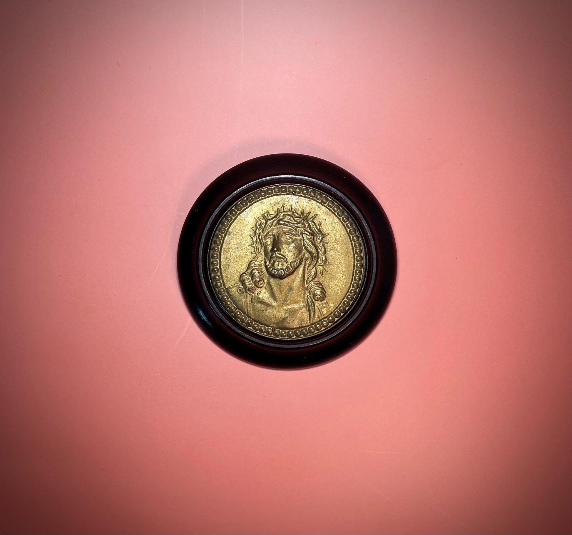 Beautifully crafted 4 inch antique wood and polished brass Jesus plaque.