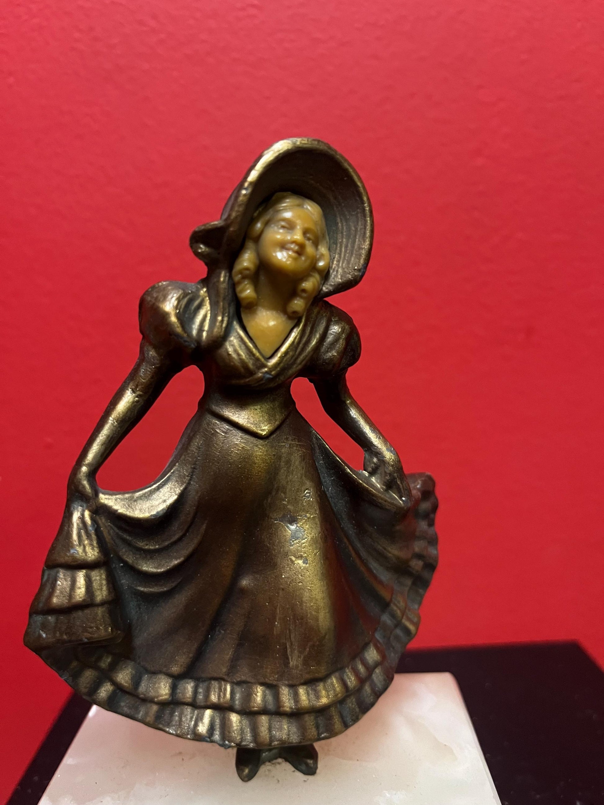 Antique bronze and bone statue of a lady on onyx base wonderful condition and patina - six inches high - art nouveau beauty