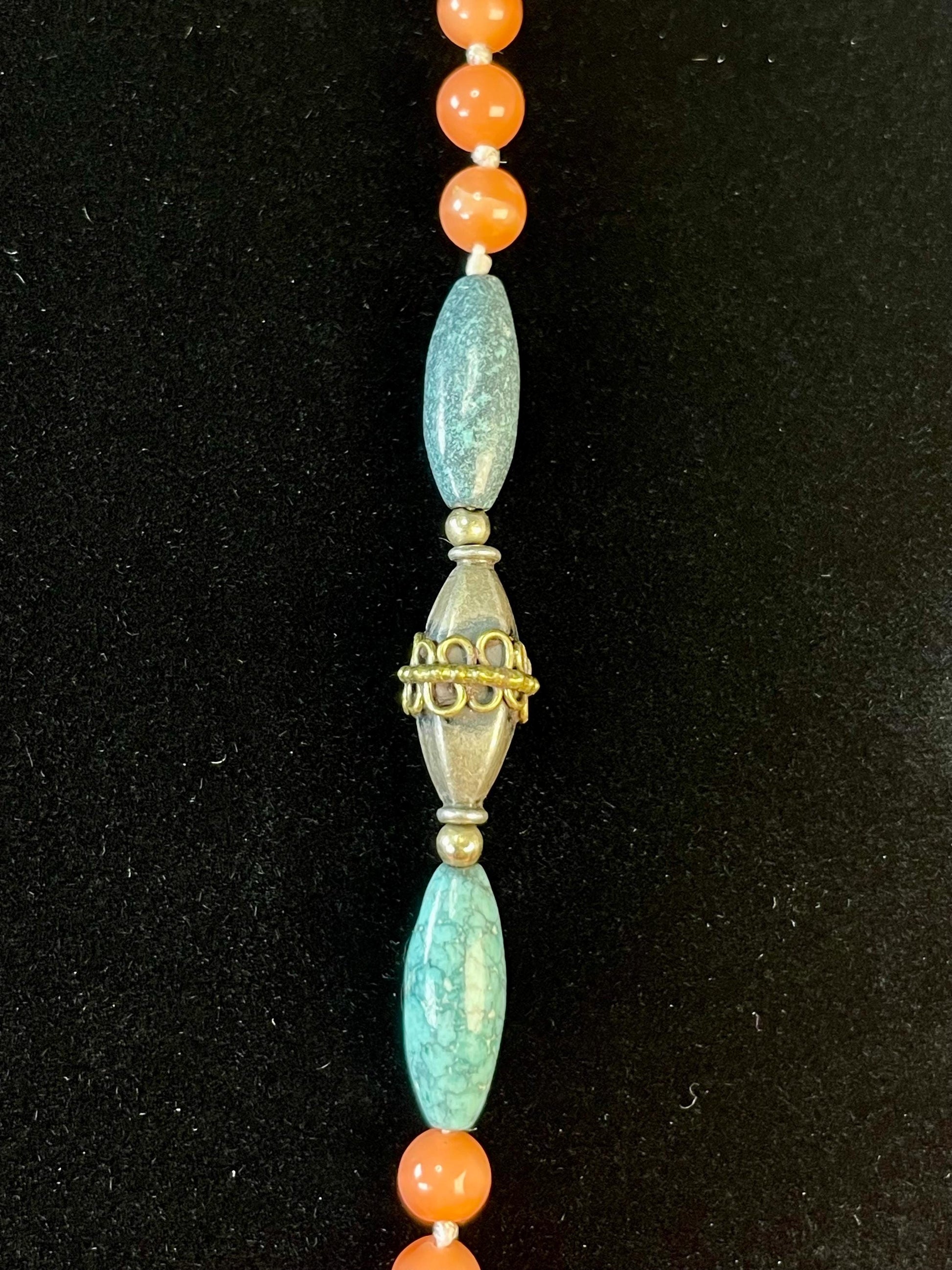 A gorgeous Chinese necklace made from intricately detailed silver beads, coral and turquoise for a wonderful colour and texture combination.