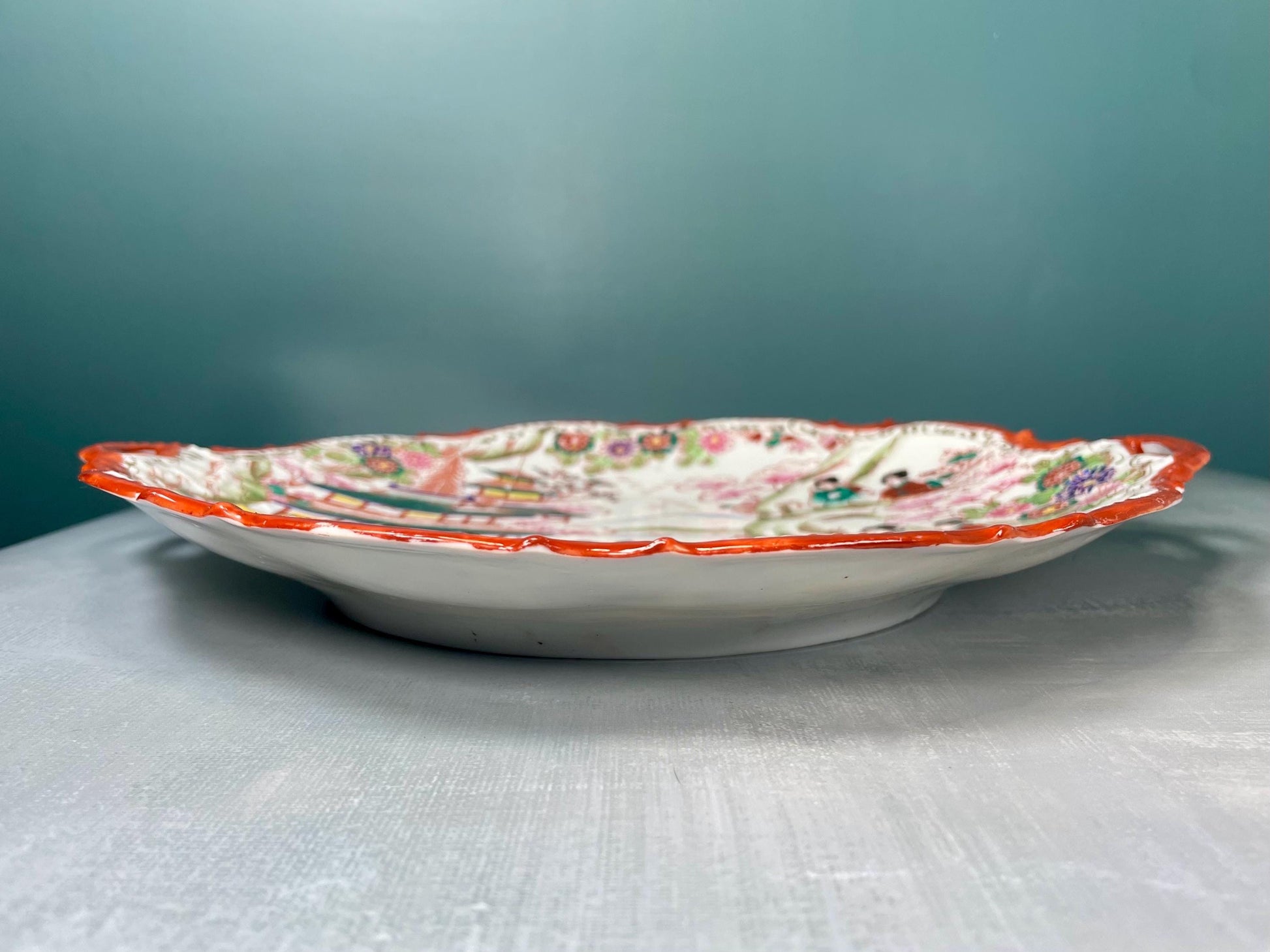 This beautiful antique Japanese porcelain piece showcases traditional Geisha girl patterning with pagodas and floral scenery. Accented with gold and delicately textured edges.