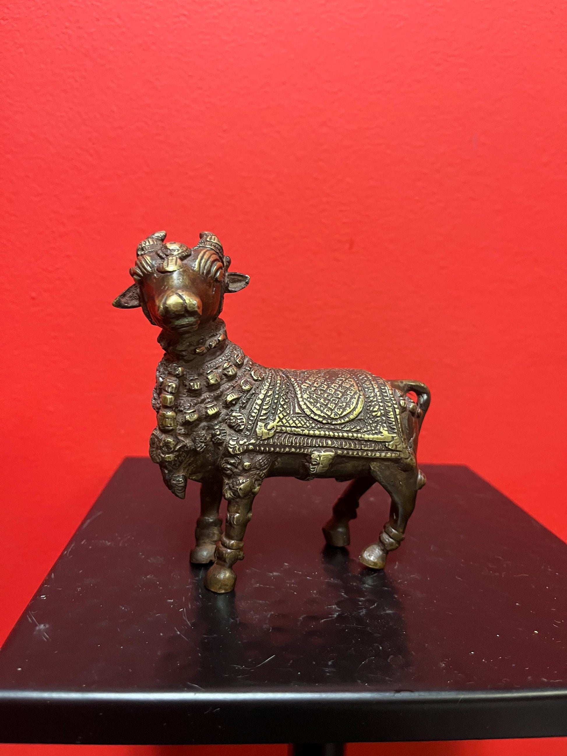 Approximately 18 century Nepalese bronze statue of a bull Shabdakosh - with amazing patina and gilding heavy 4 x 4 inches long - wow
