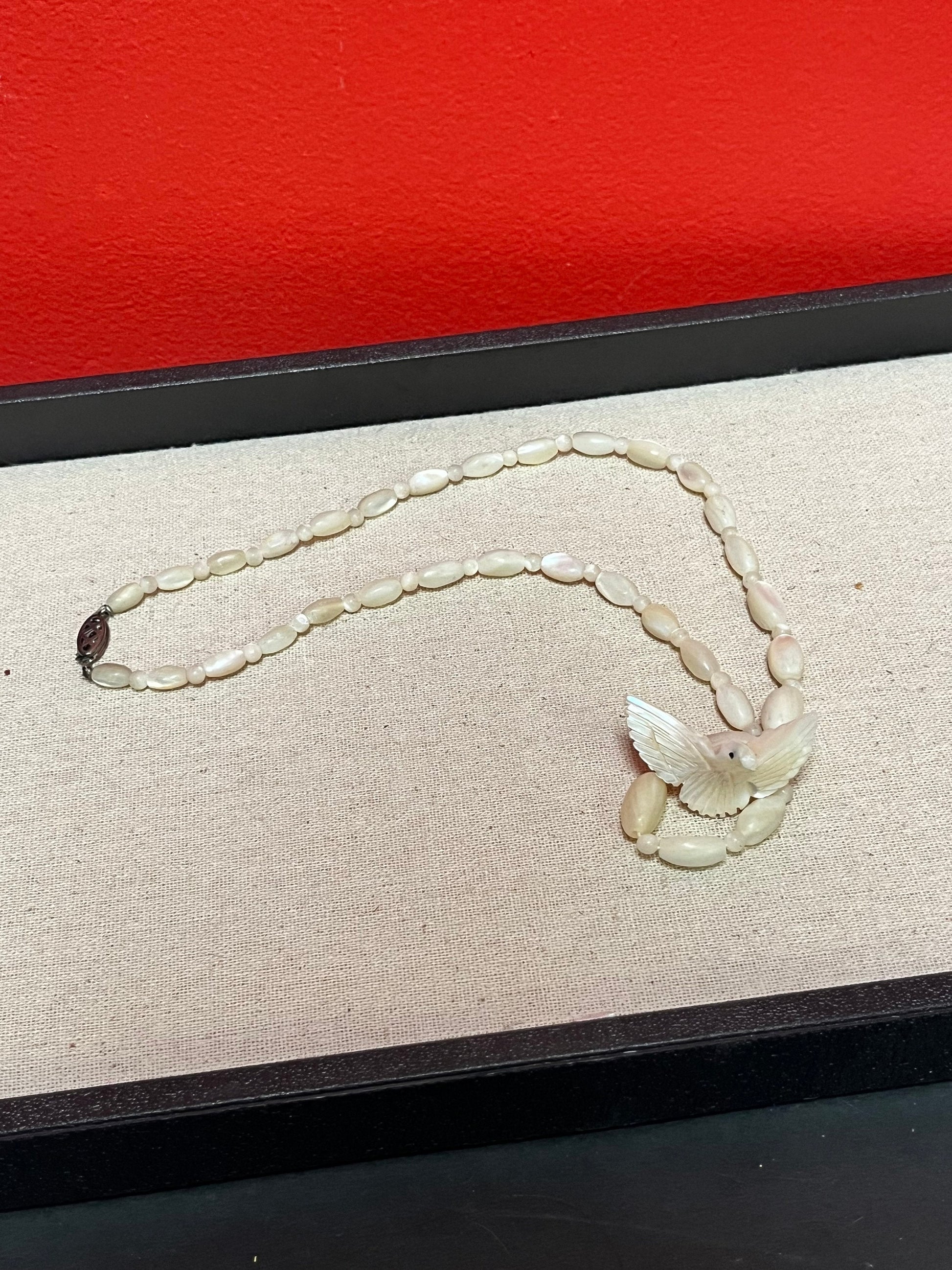 Approximately 21 inch carved shell necklace with bird pendant lovely detail