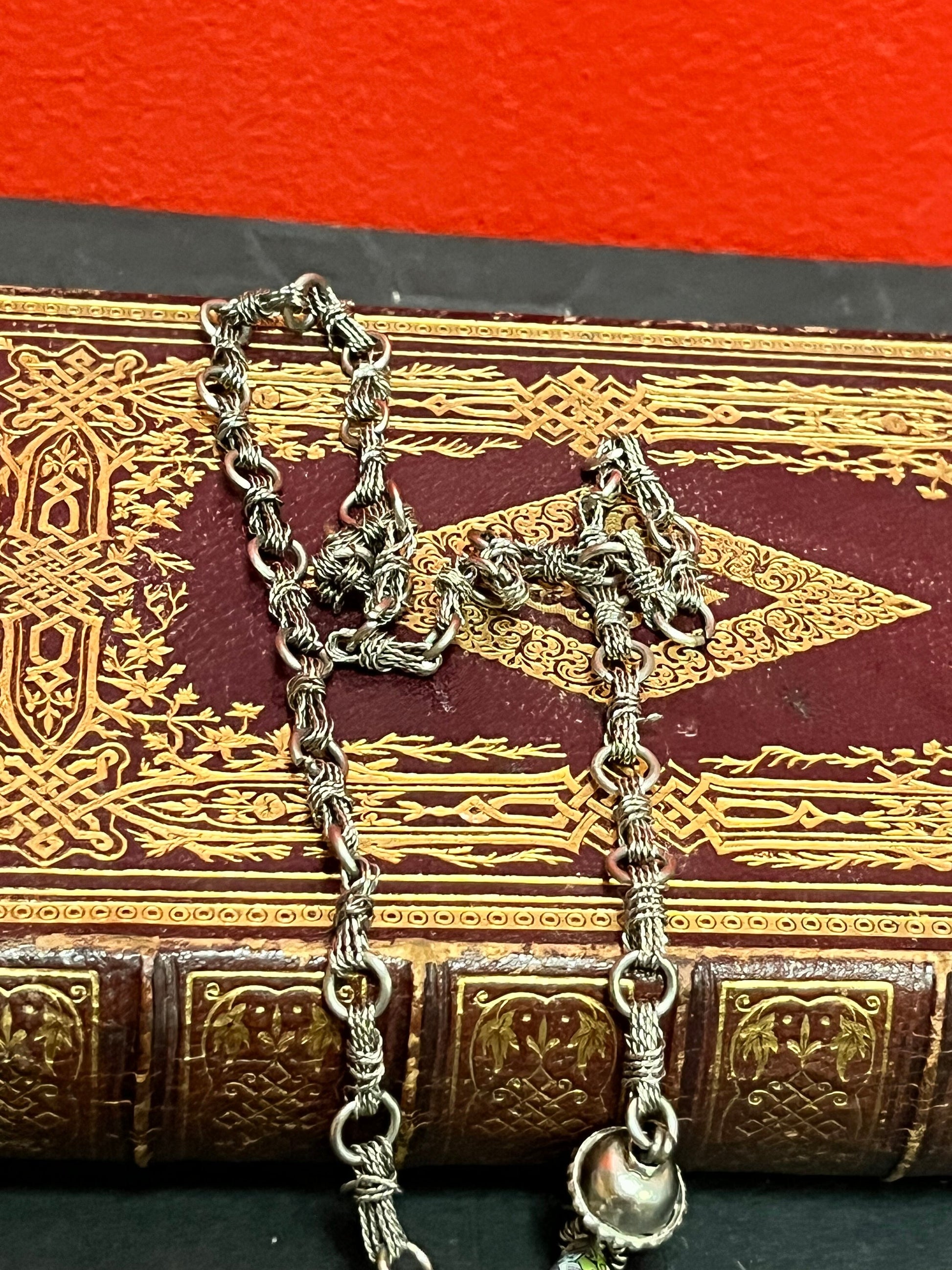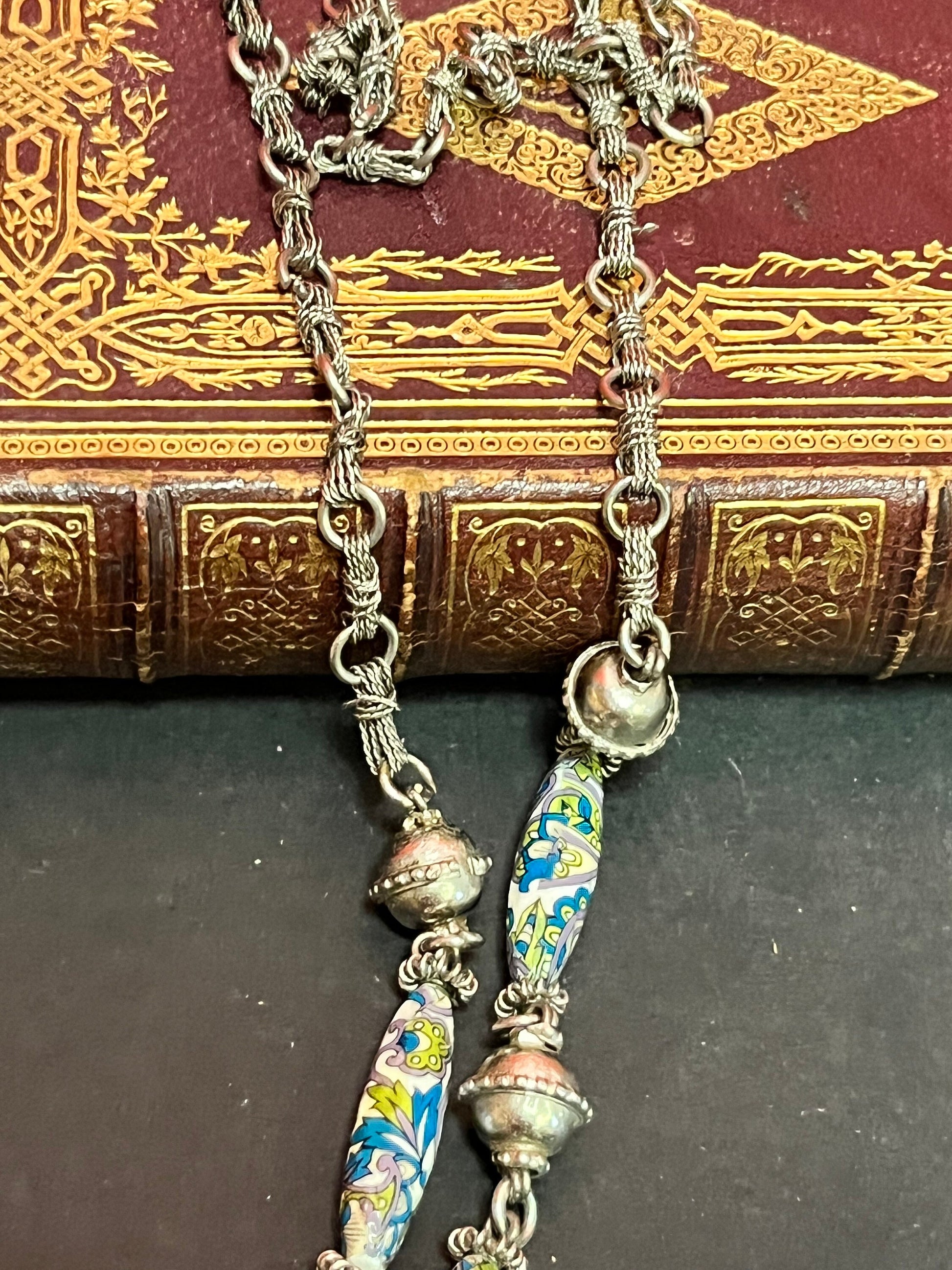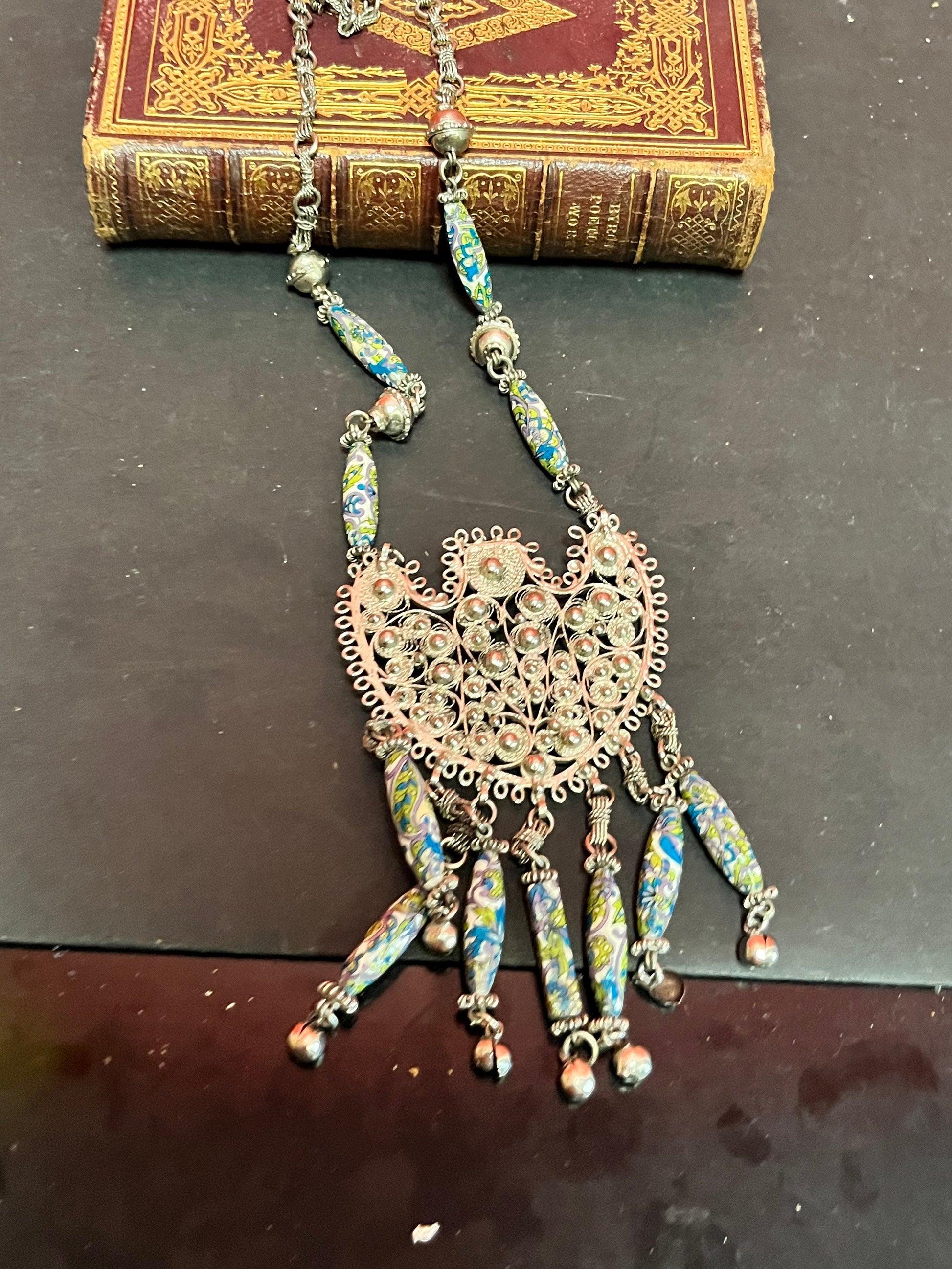 Approximately 26 inch necklace with 6 inch pendant Asian silver filagree and pottery beads very unusual and wonderful
