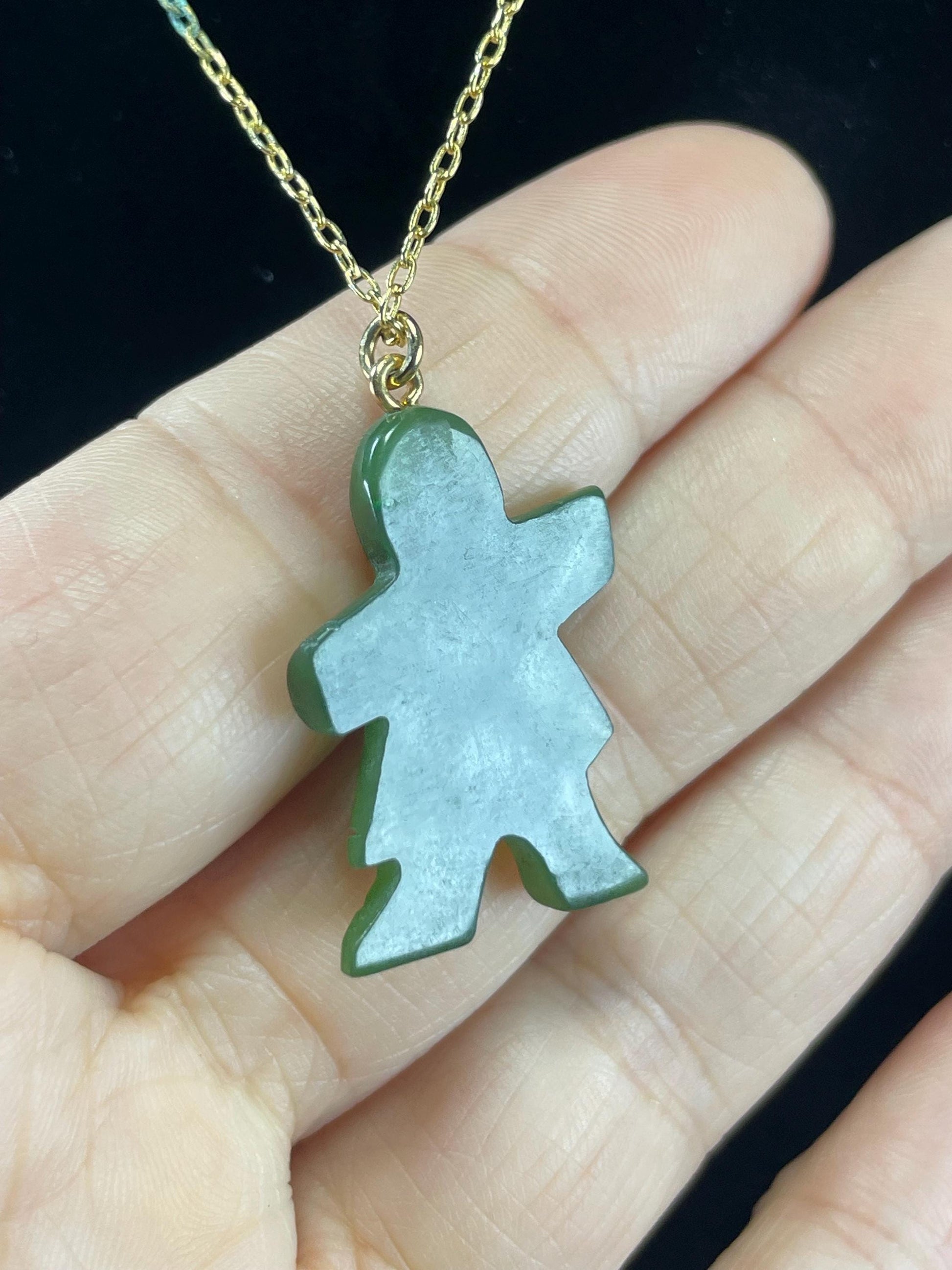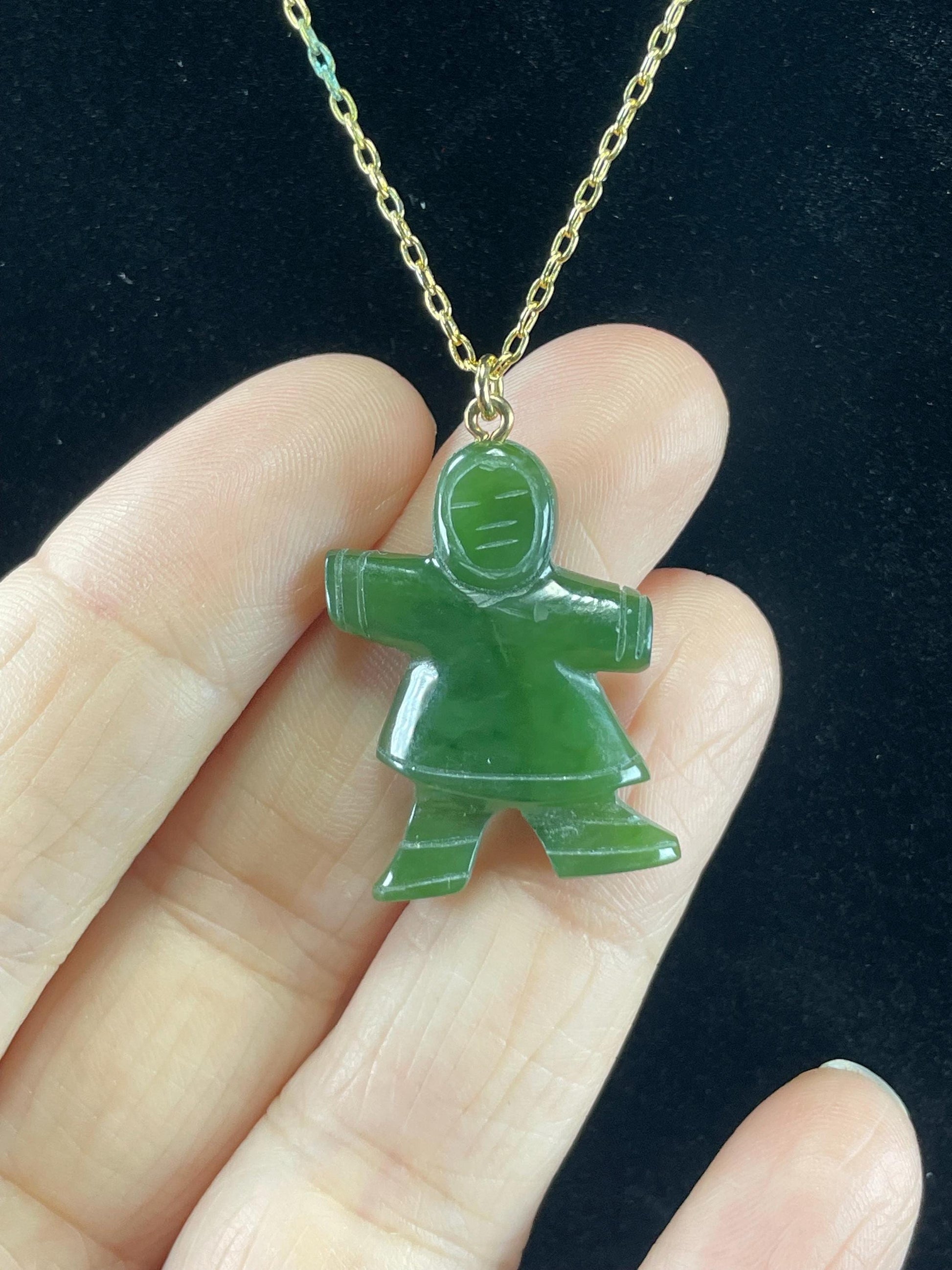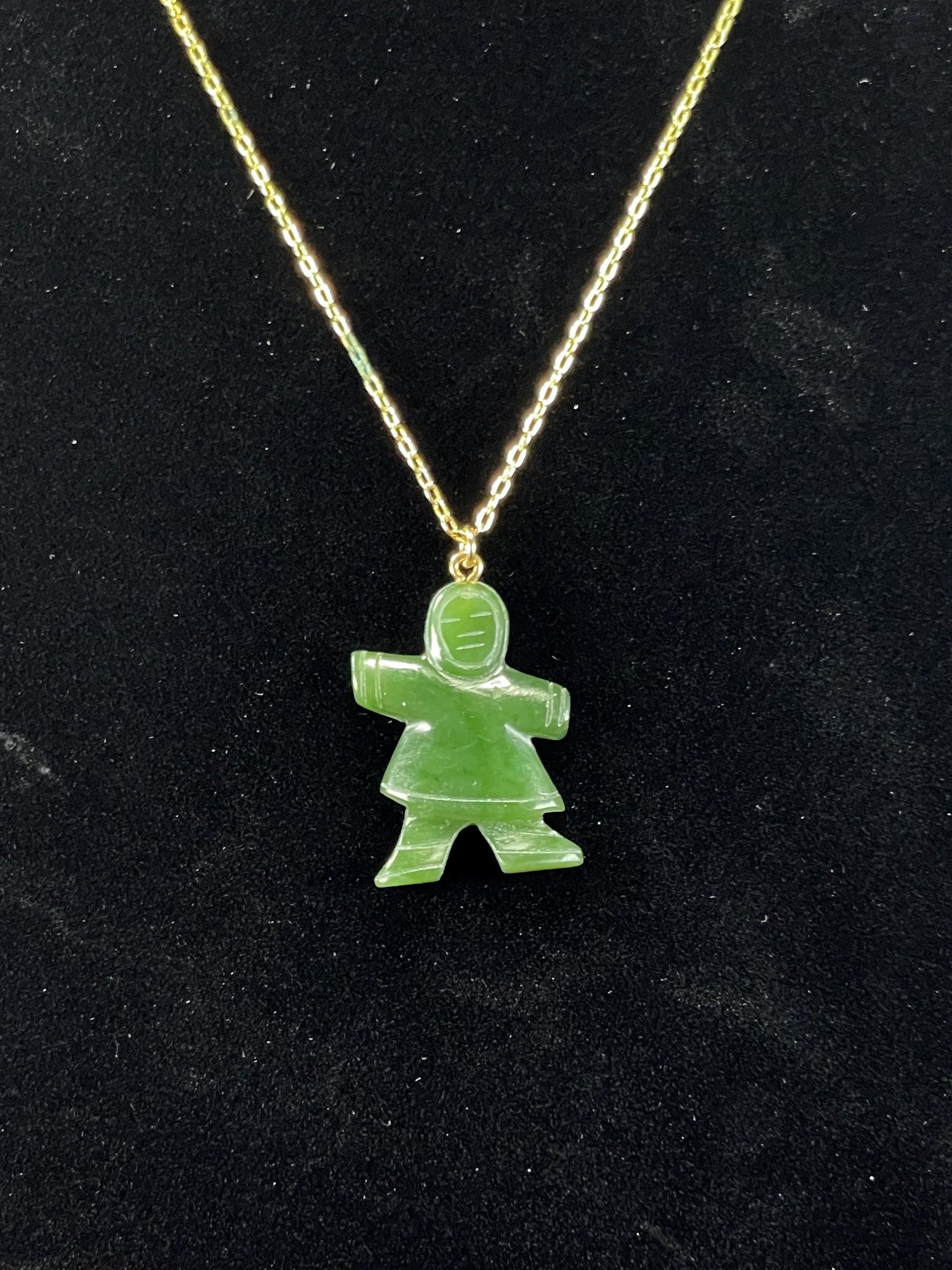 Carved BC Jade necklace Inuit figure. Gold chain (untested) has some tarnishing, priced as is.