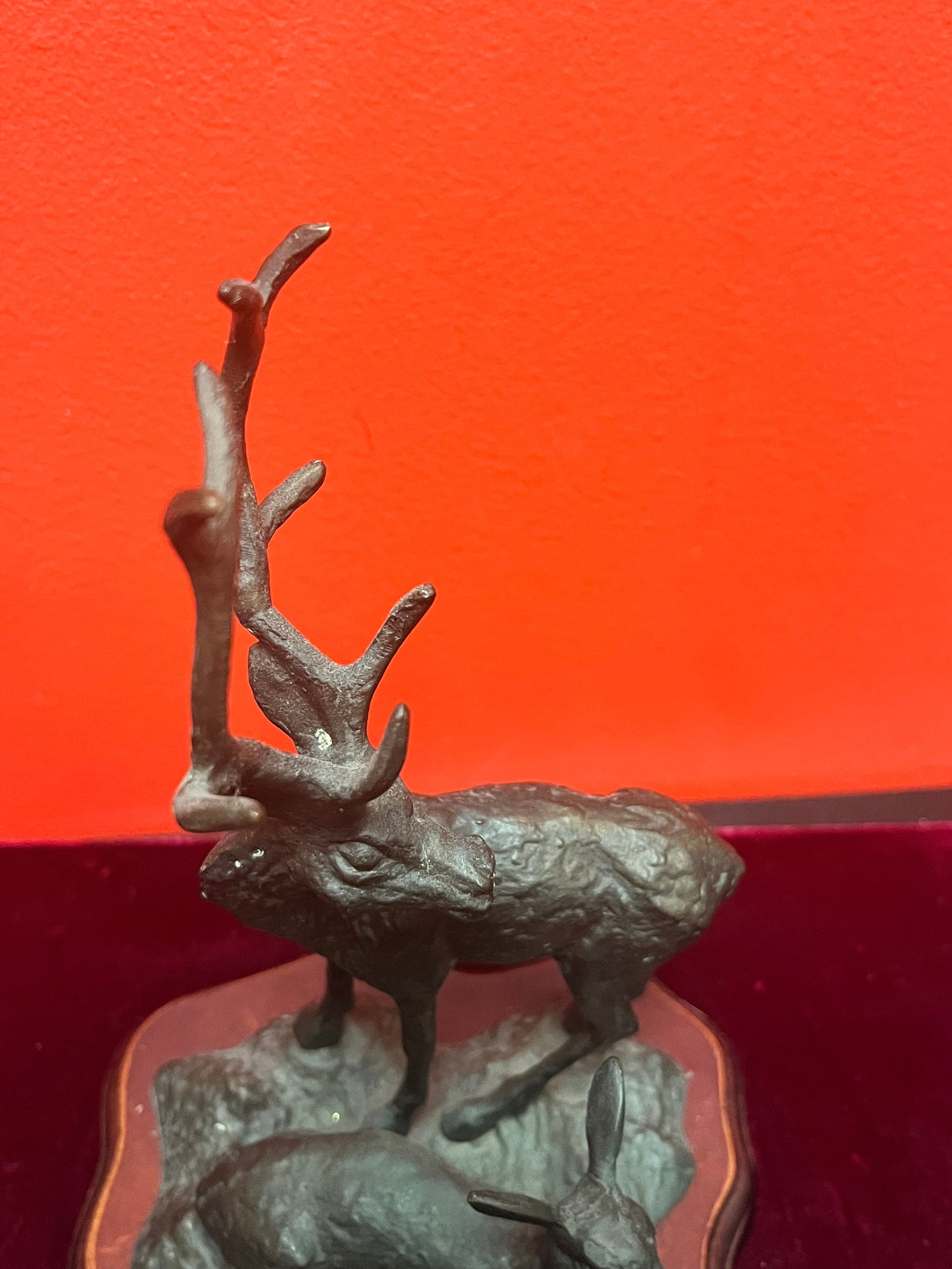 Beautiful 10 inch high older bronze stag and fawn on base lovely Patina